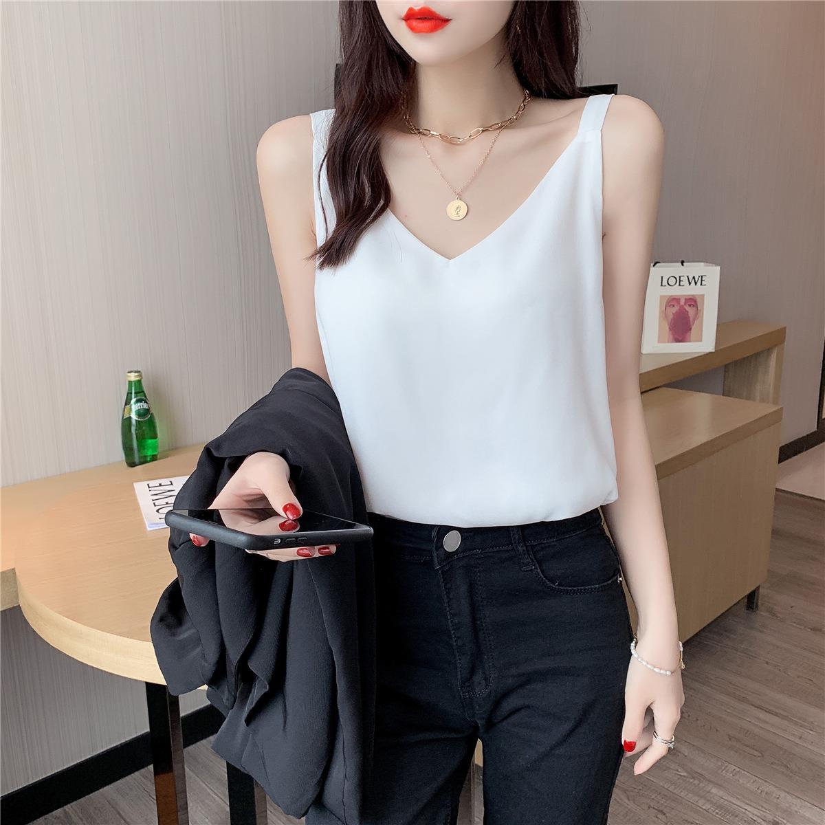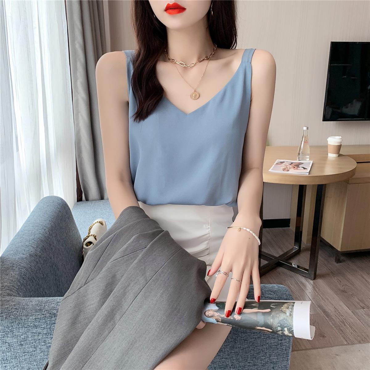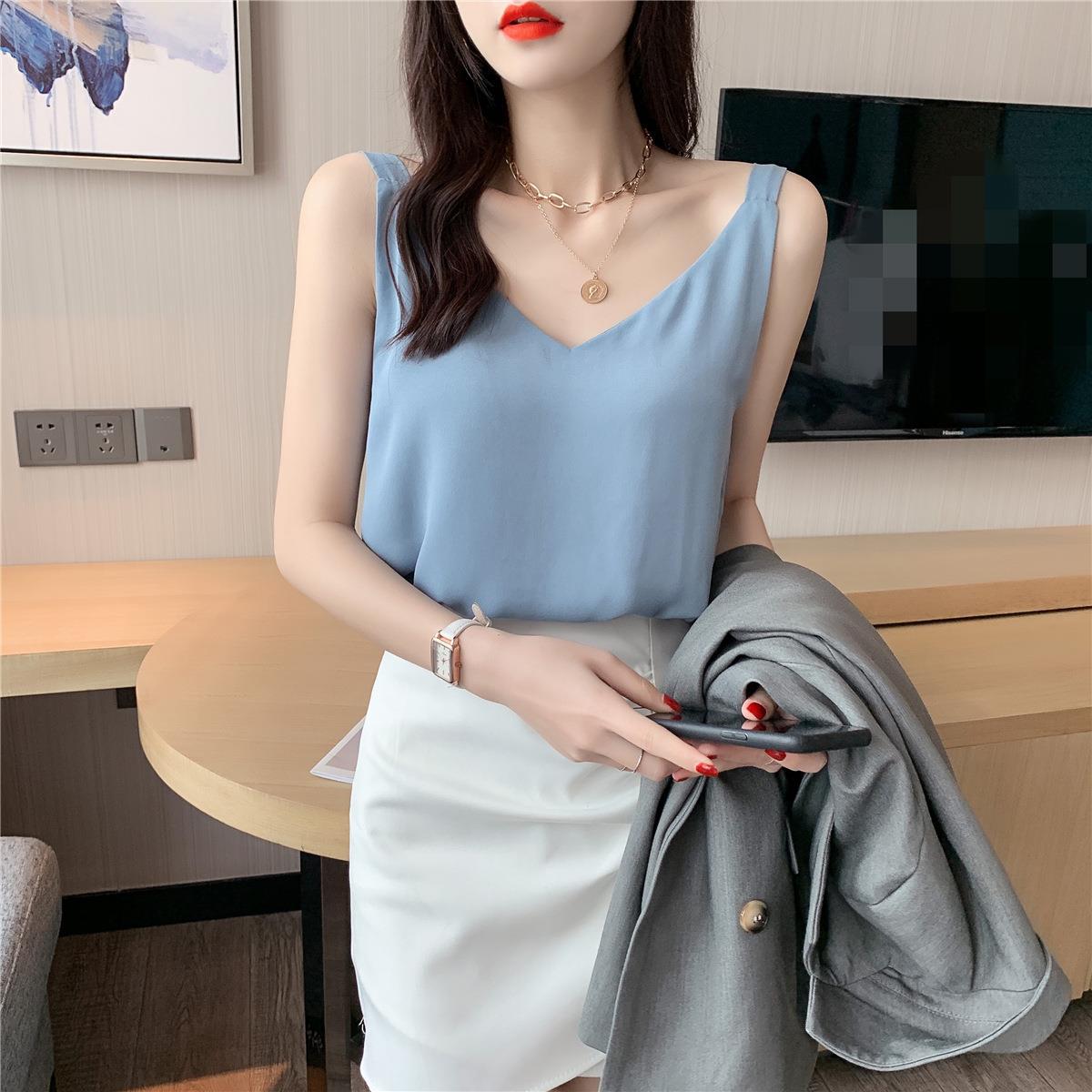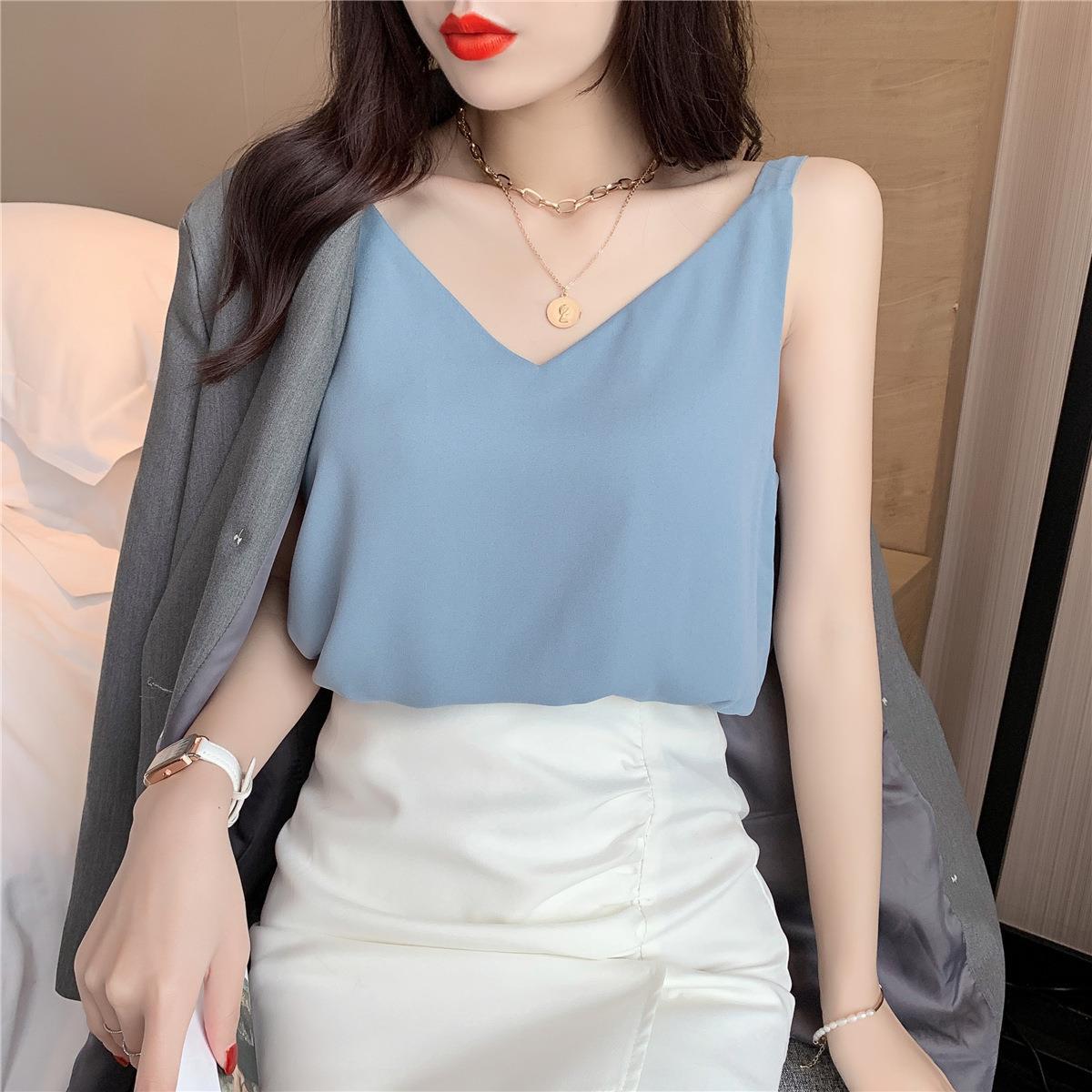 시폰 카미 솔 여자 2023 새로운 V-넥 더블 레이어 느슨한 슬림베이스 셔츠 탑