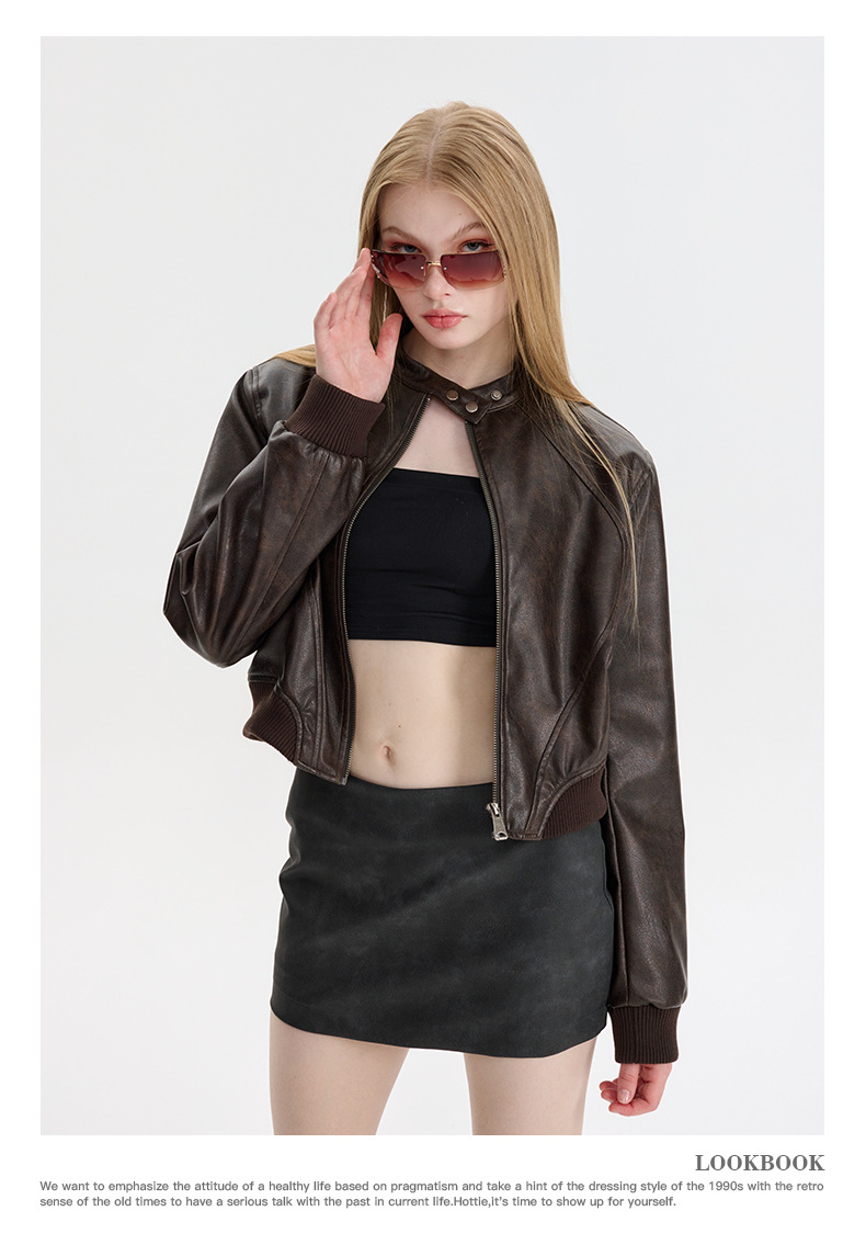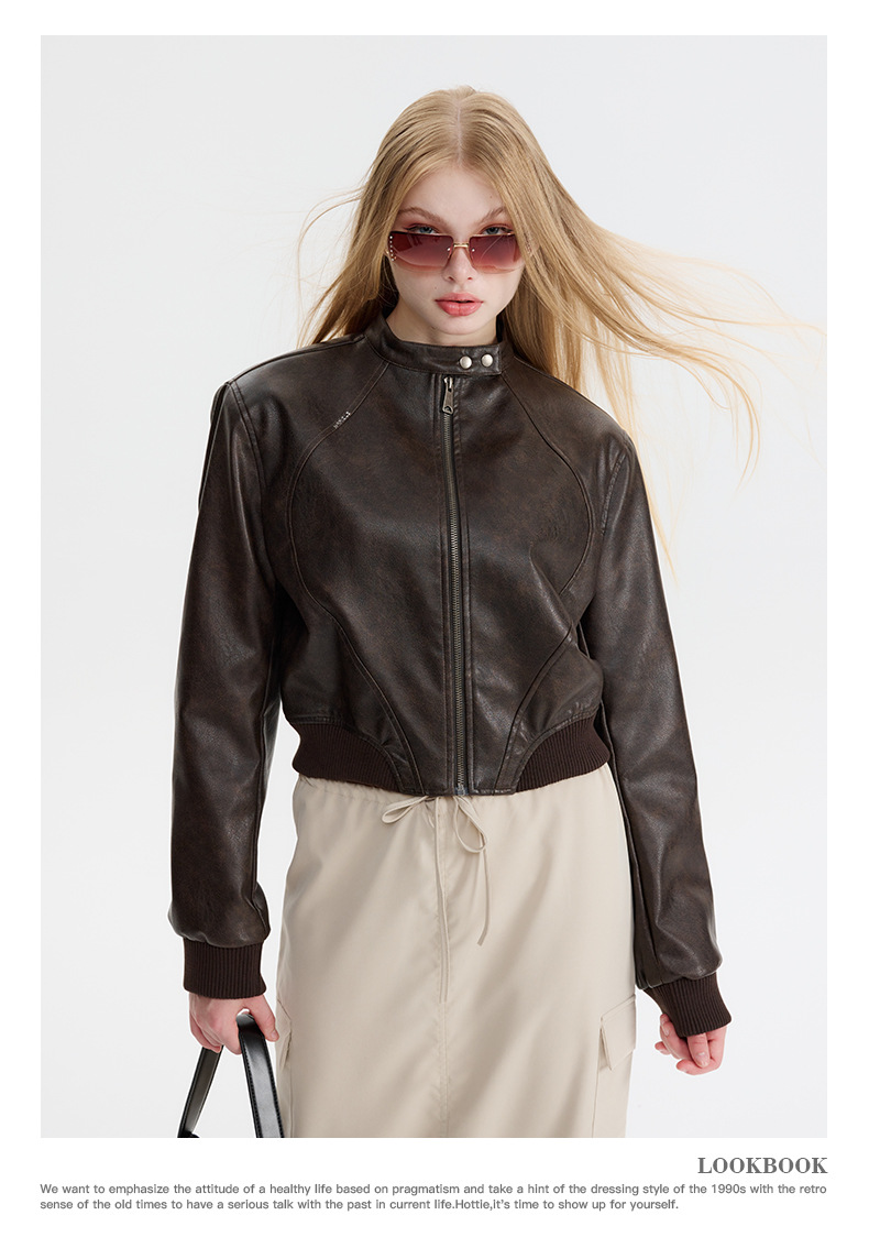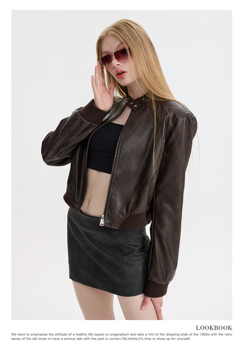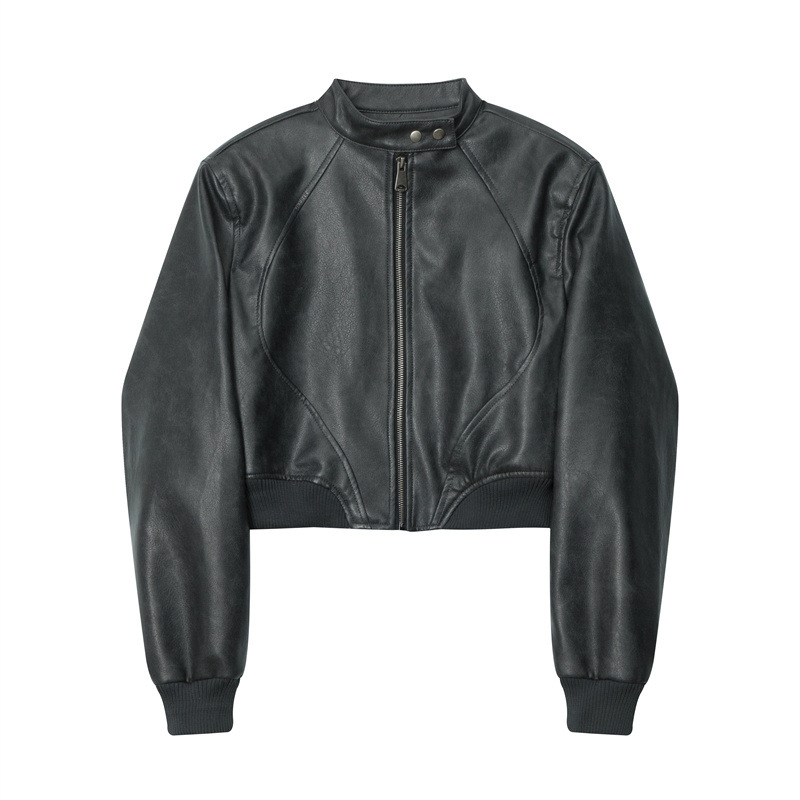 HeyHenry 아메리칸 패션 스탠드 칼라 긴 소매 짧은 PU 가죽 짧은 코트 재킷 야구 유니폼 지퍼 탑 여성