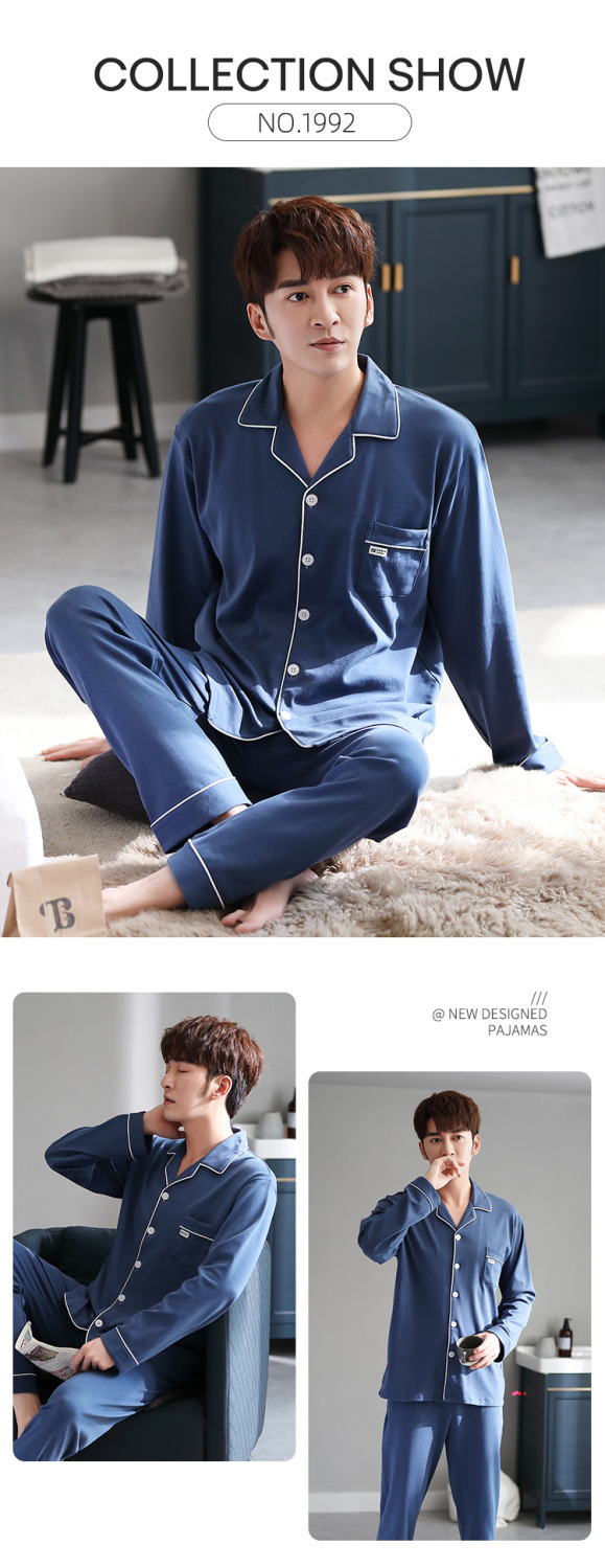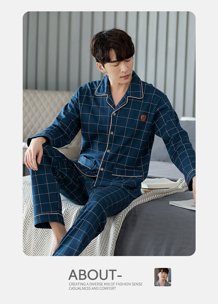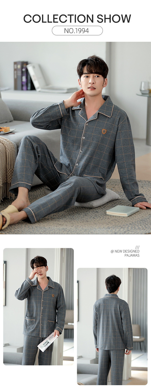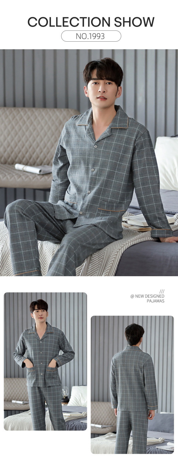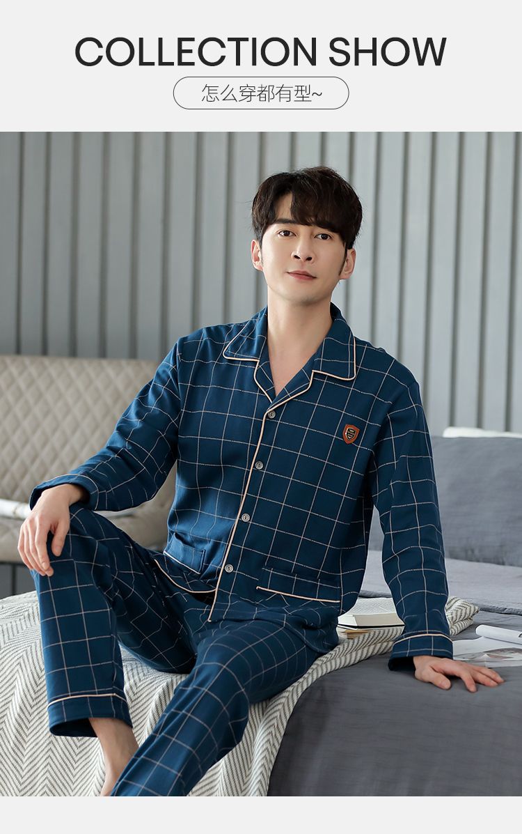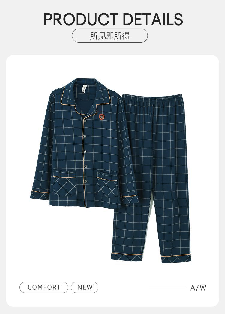 양면 100% 면 잠옷 남자의 봄과 가을 긴 소매 옷깃 세트 가을과 겨울 중년 가정 의류스토어 가기