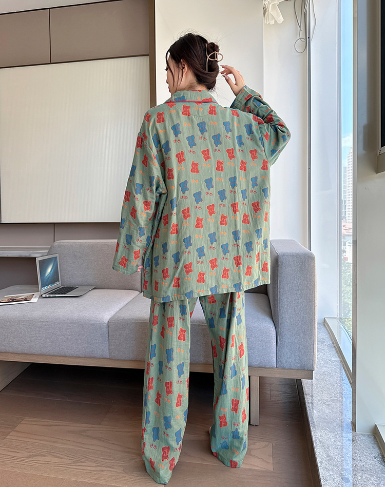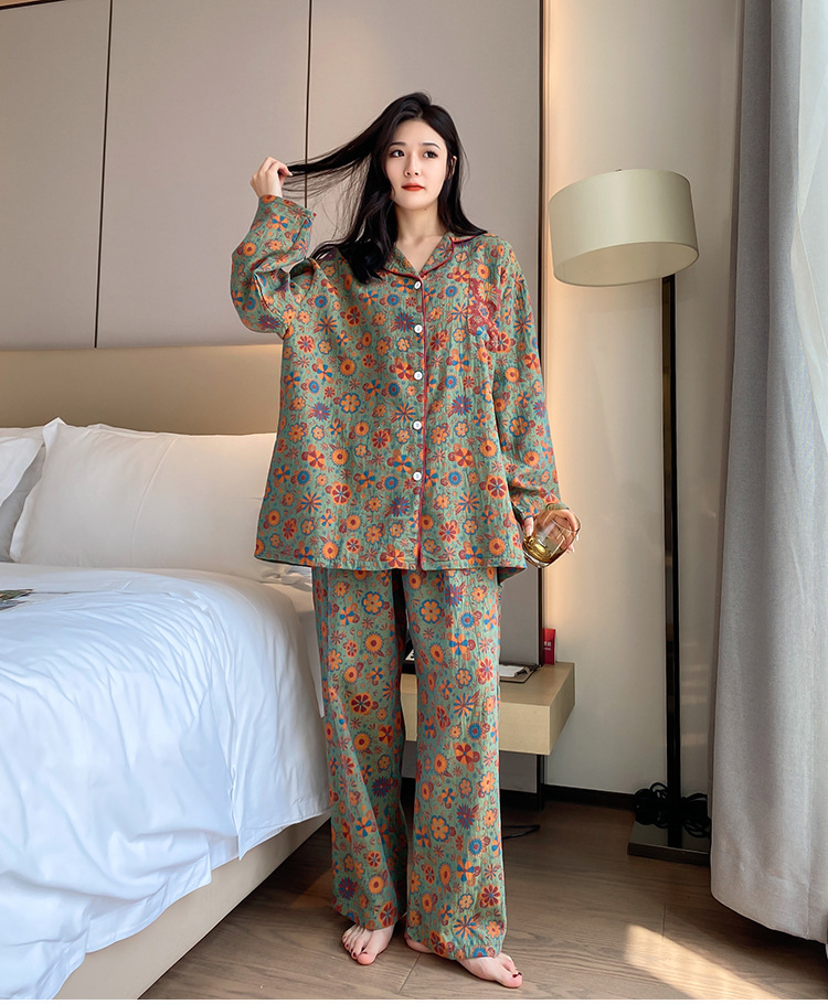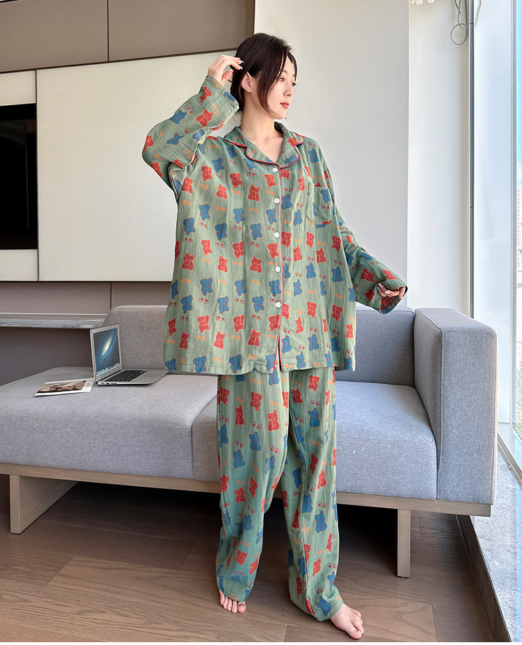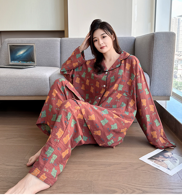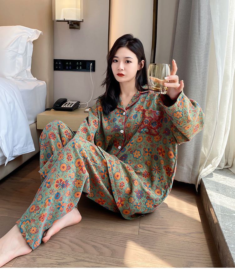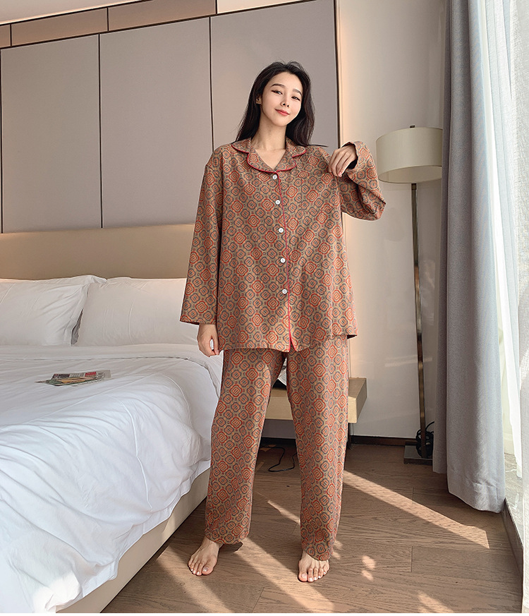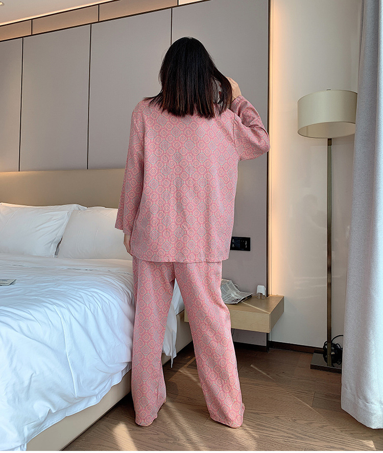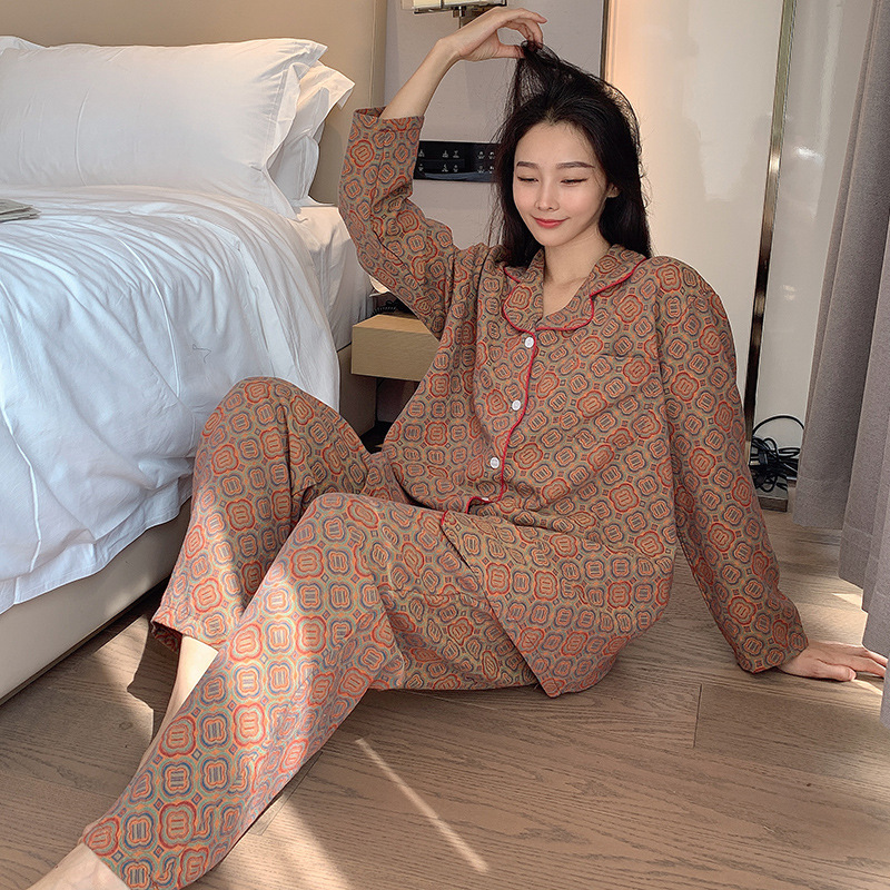 플러스 사이즈 면 잠옷 여자의 만화 인쇄 긴팔 바지 투피스 세트 봄과 가을 옷깃 카디건 잠옷 얇은 세트스토어 가기