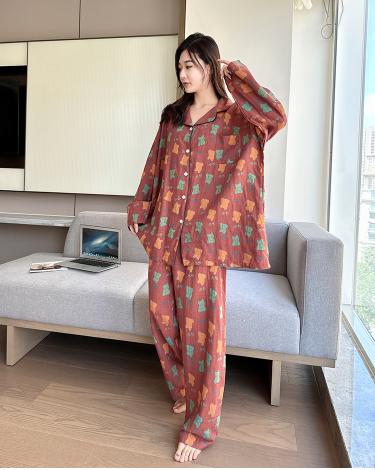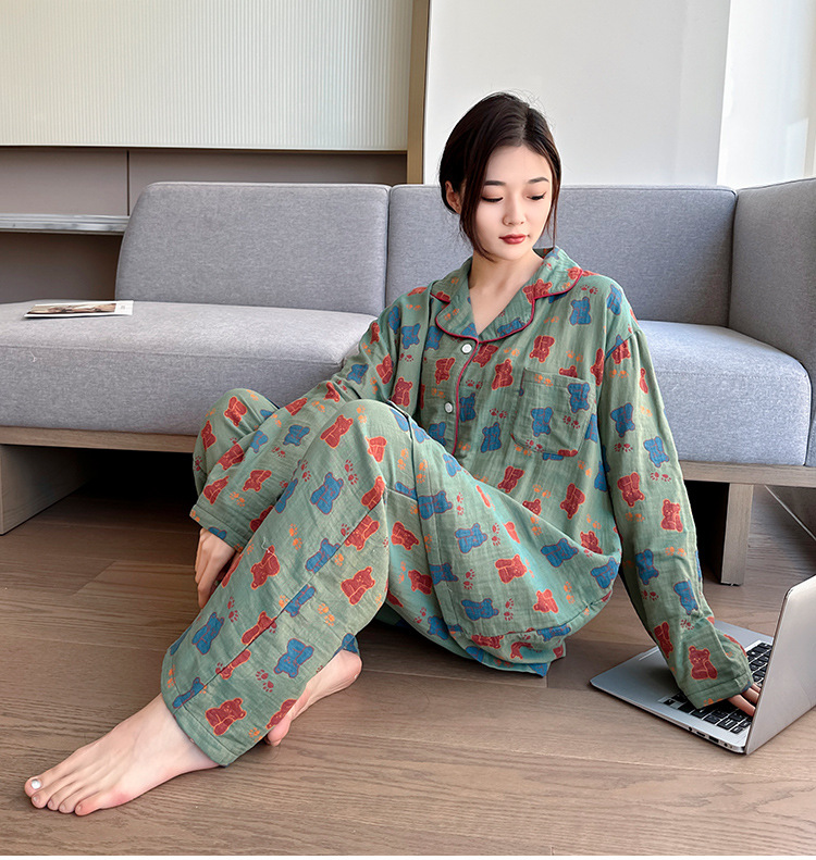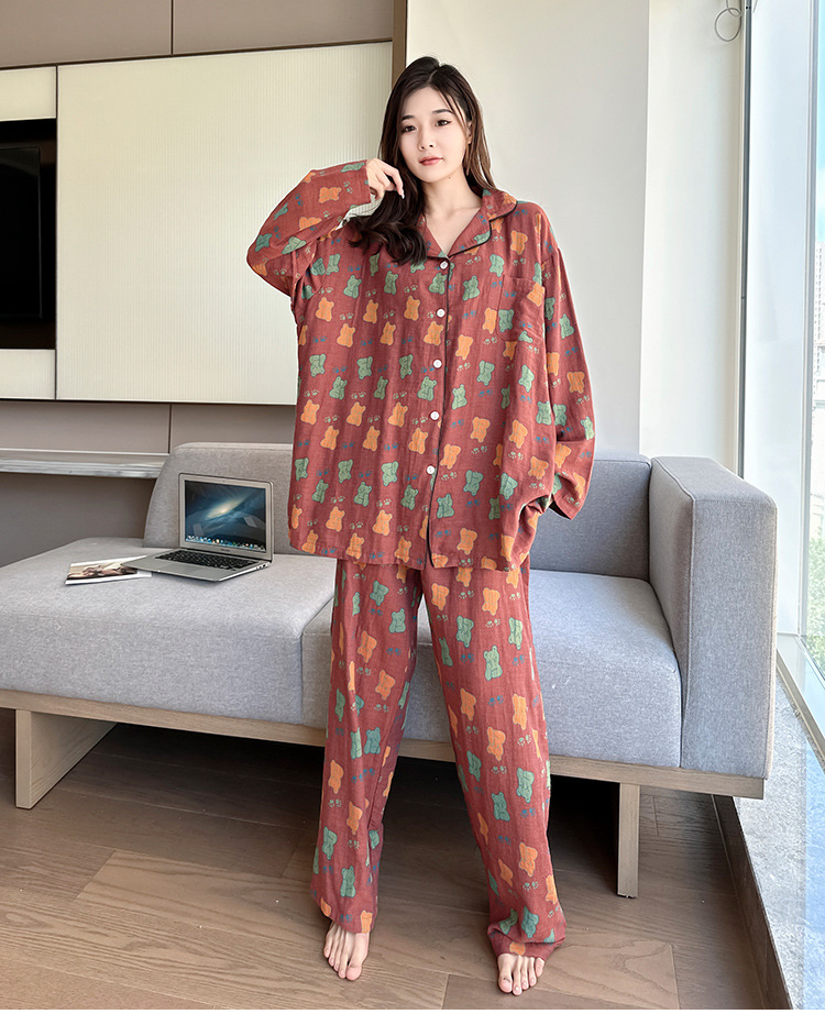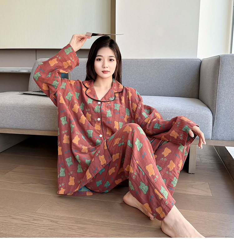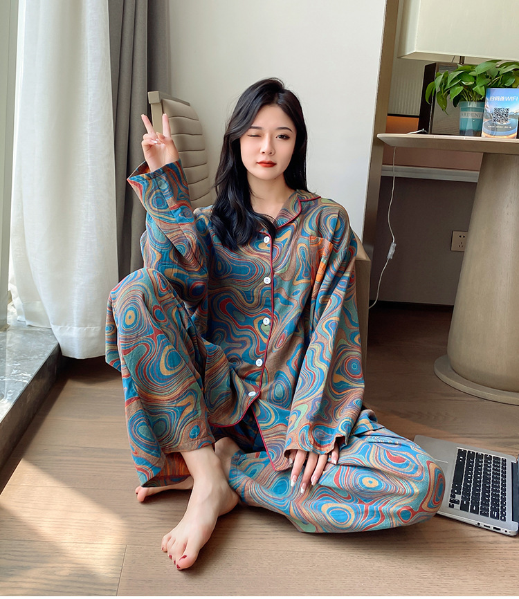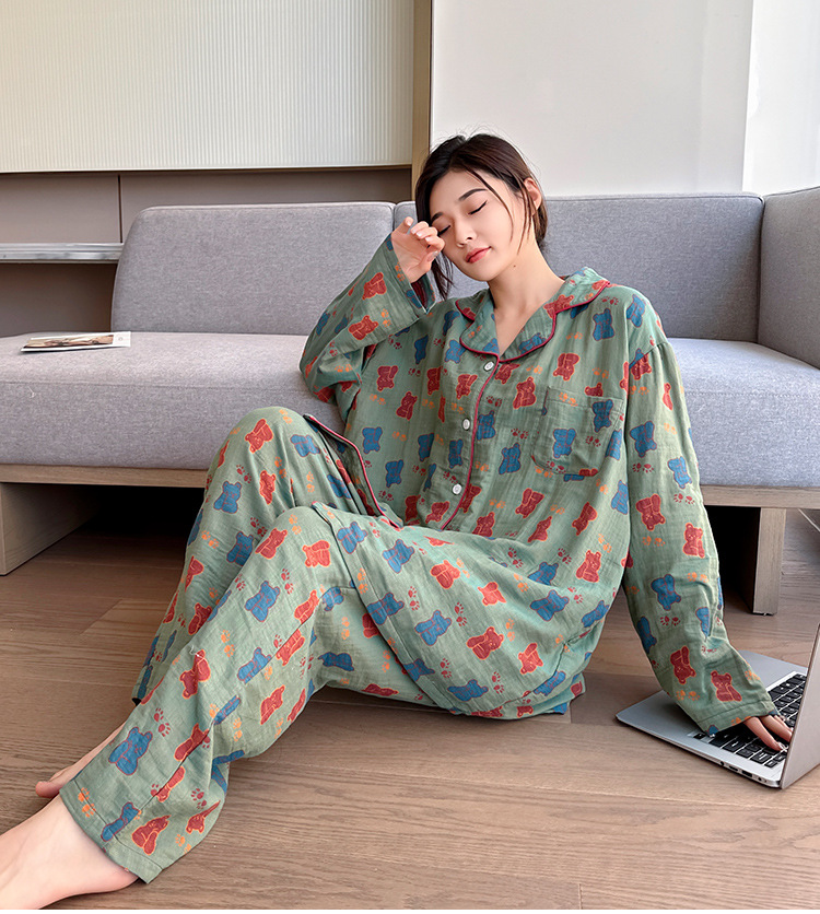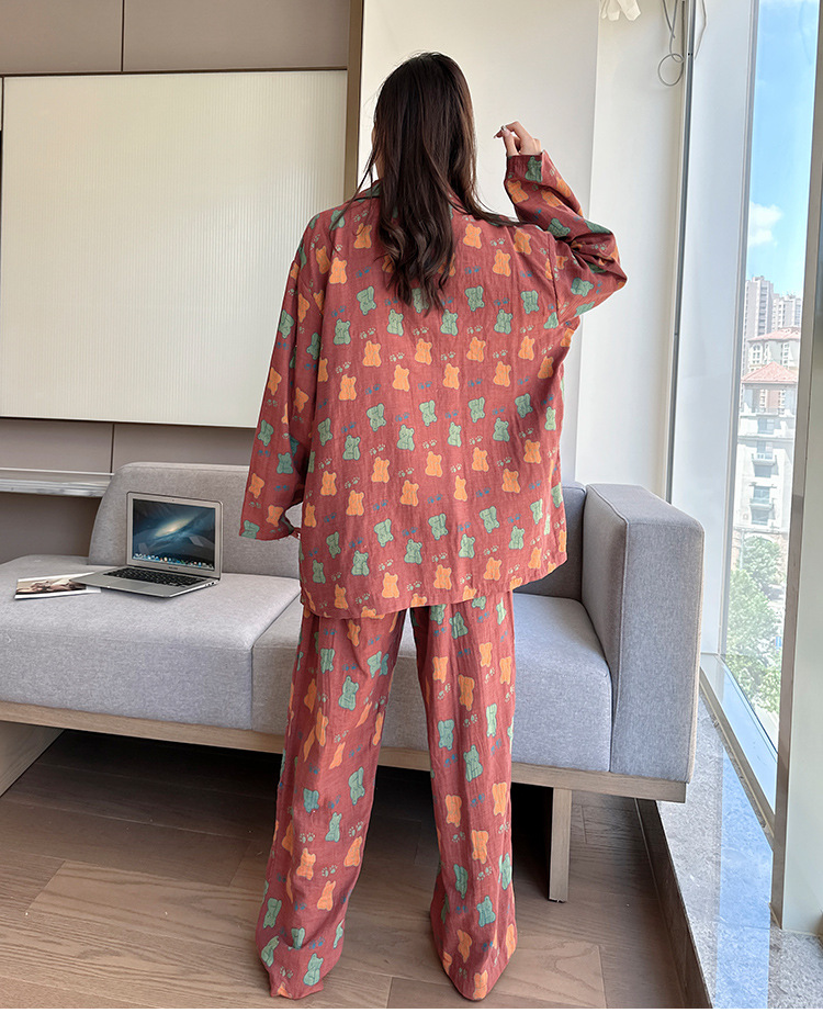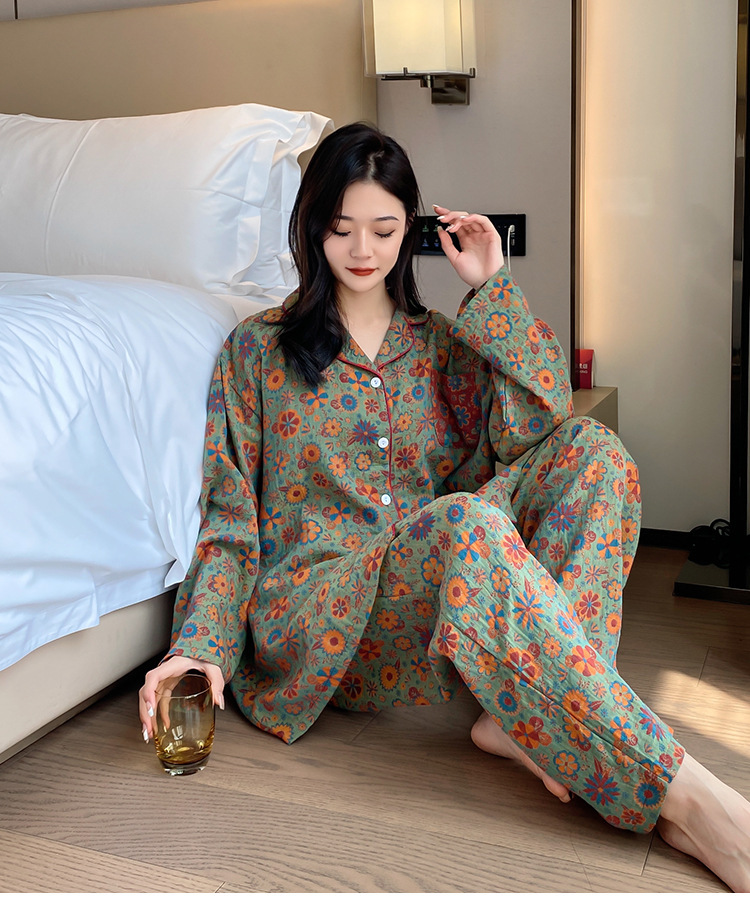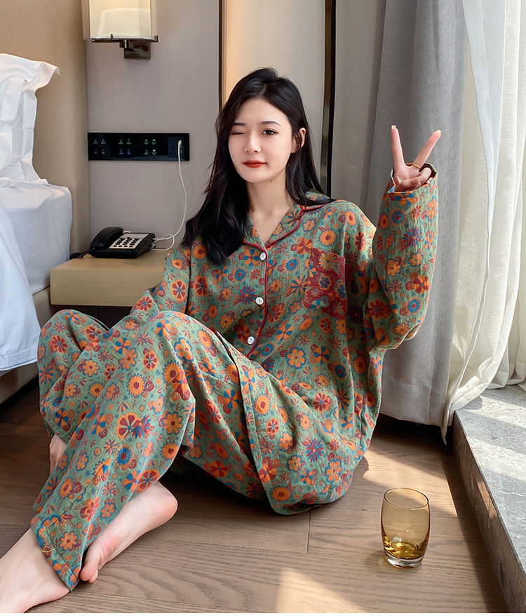 플러스 사이즈 면 잠옷 여자의 만화 인쇄 긴팔 바지 투피스 세트 봄과 가을 옷깃 카디건 잠옷 얇은 세트스토어 가기