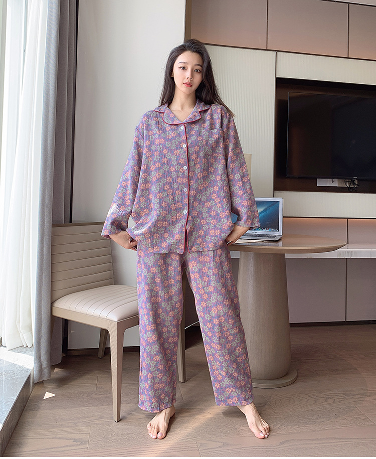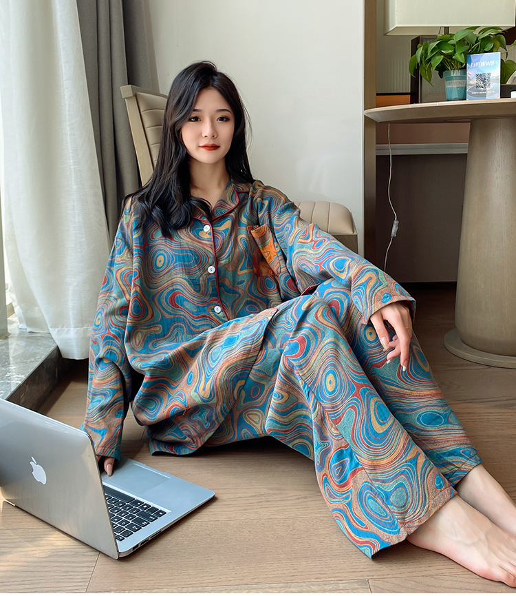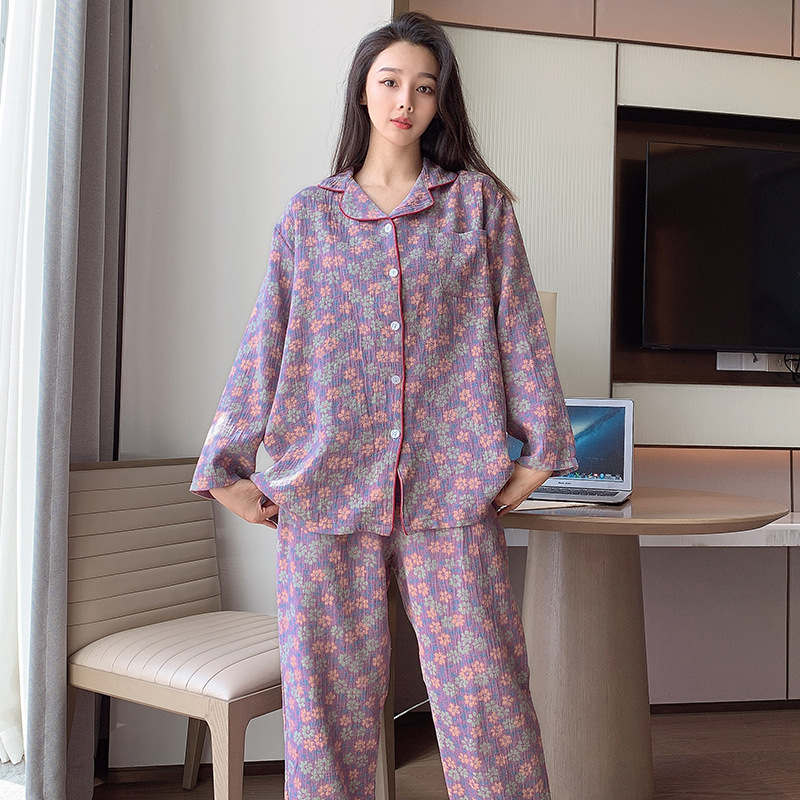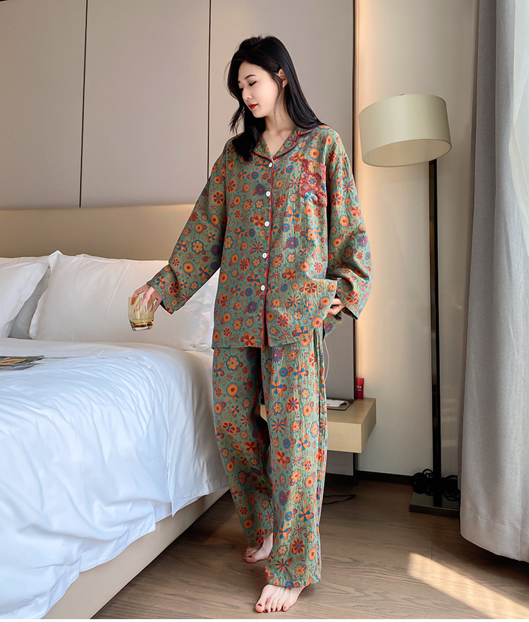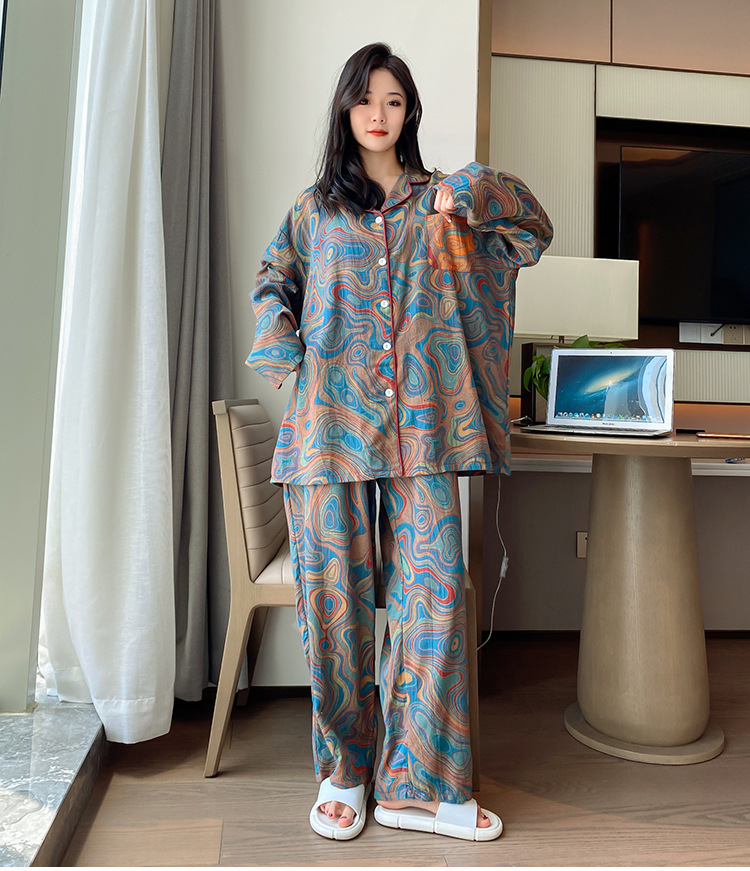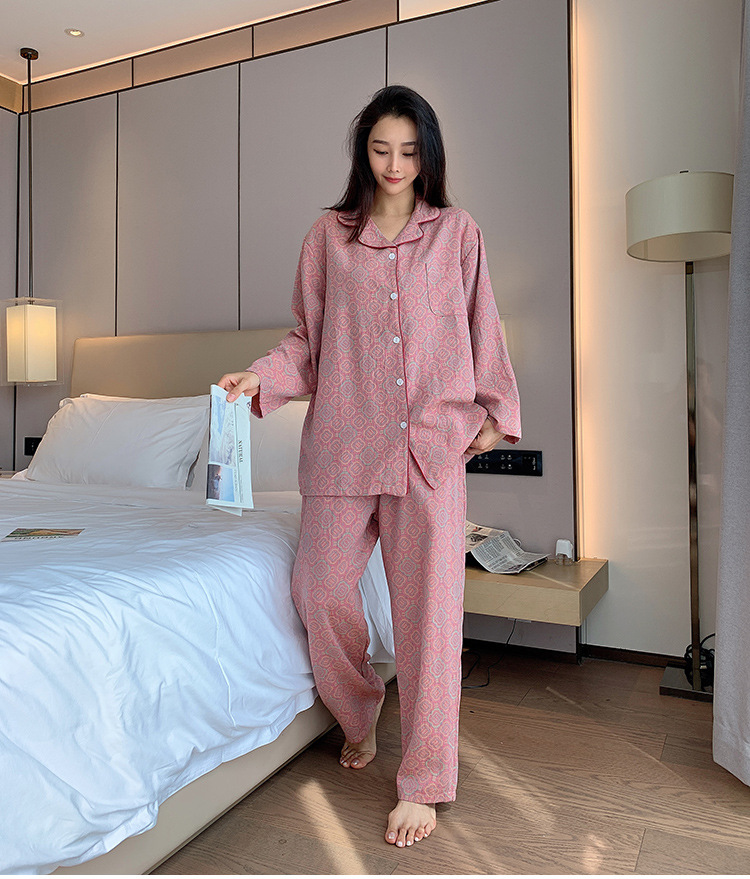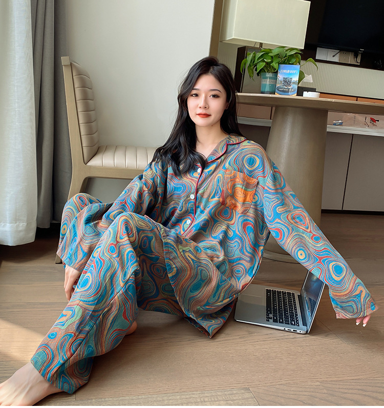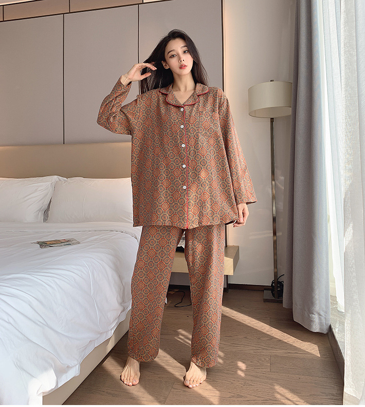 플러스 사이즈 면 잠옷 여자의 만화 인쇄 긴팔 바지 투피스 세트 봄과 가을 옷깃 카디건 잠옷 얇은 세트스토어 가기