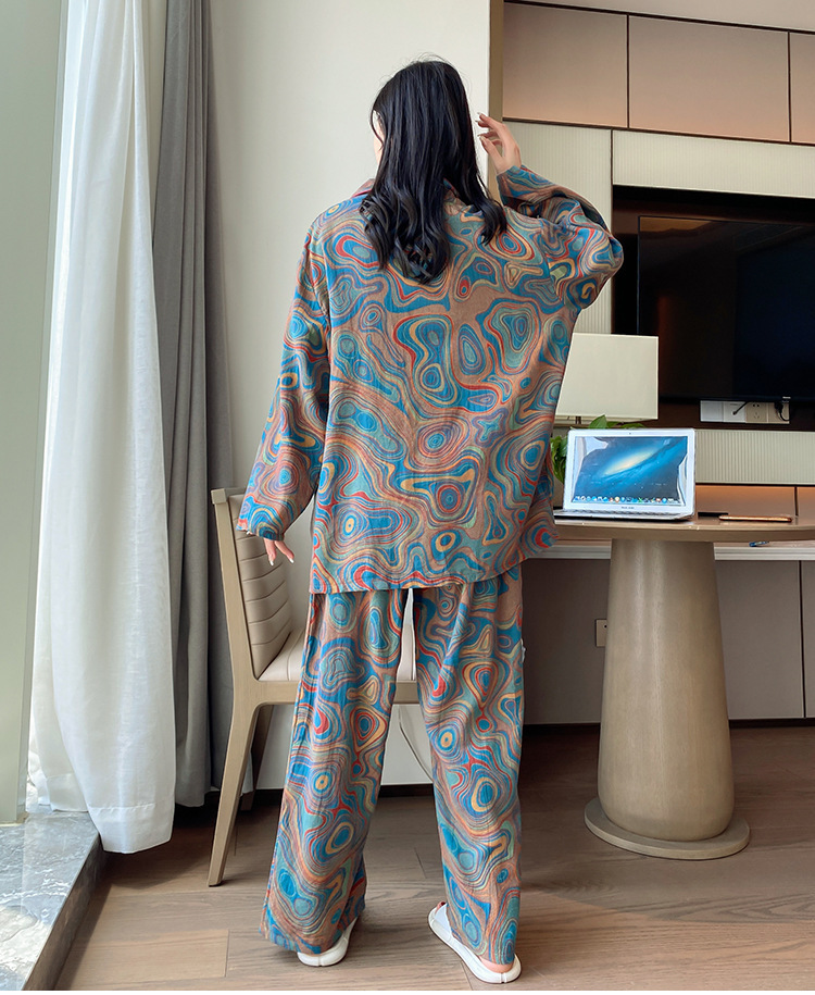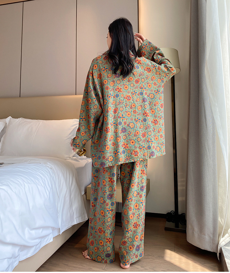 플러스 사이즈 면 잠옷 여자의 만화 인쇄 긴팔 바지 투피스 세트 봄과 가을 옷깃 카디건 잠옷 얇은 세트