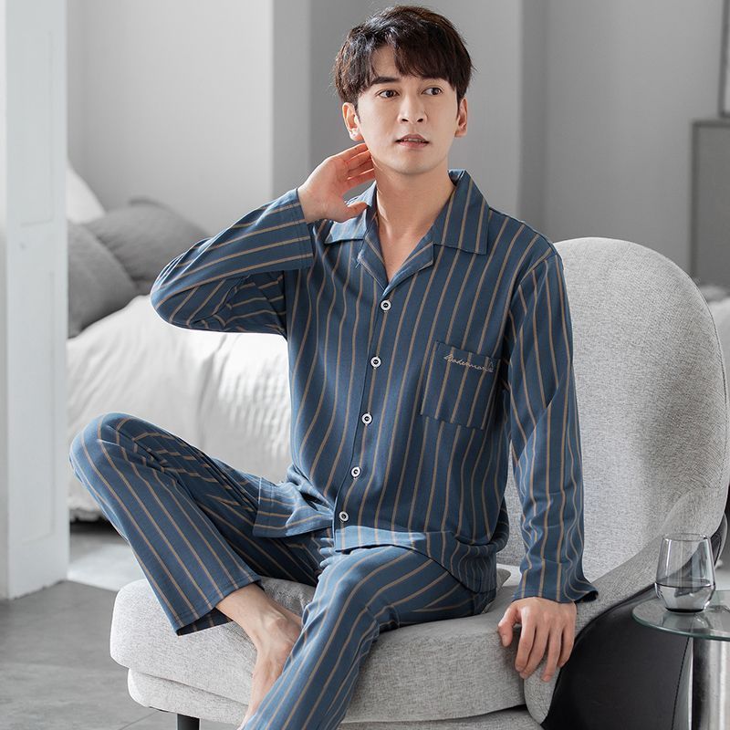 100% 순면 잠옷 남자의 봄과 가을 100 모든 면 긴 소매 얇은 플러스 사이즈 겉옷 남자의 여름 가정 의류스토어 가기