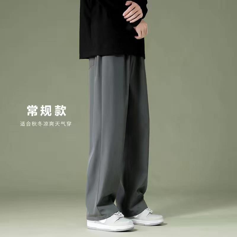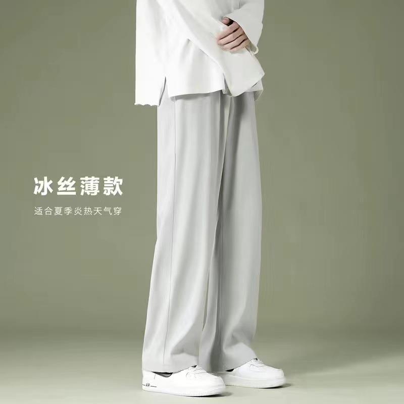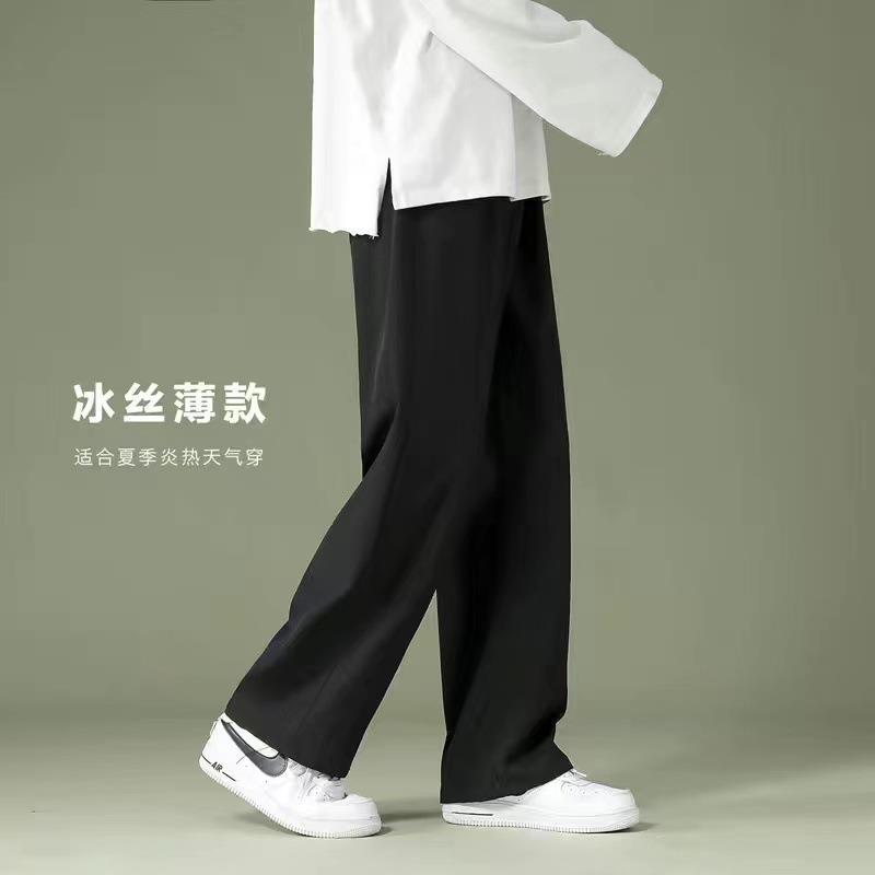 여름 얇은 아이스 실크 작업 바지 남성용 스트레이트 팬츠 느슨한 크롭 팬츠 학생 단색 와이드 레그 캐주얼 팬츠