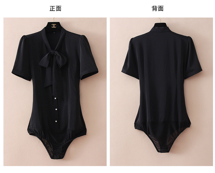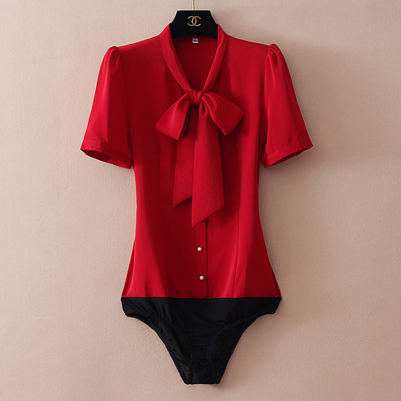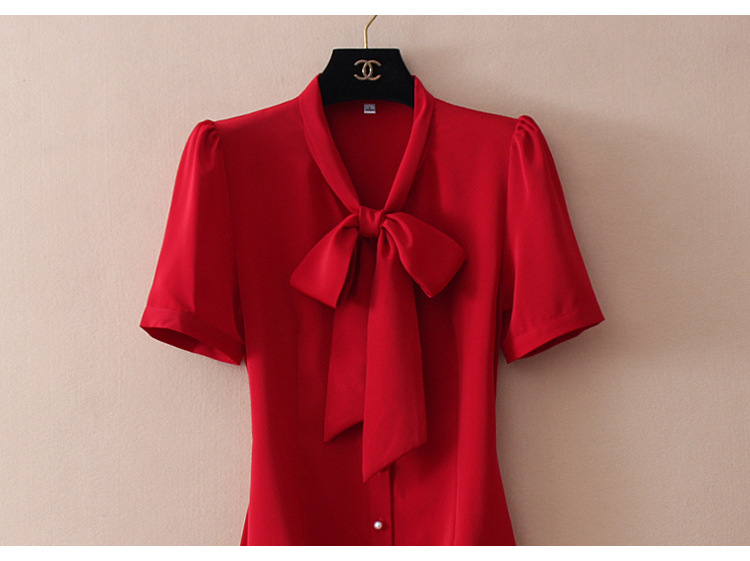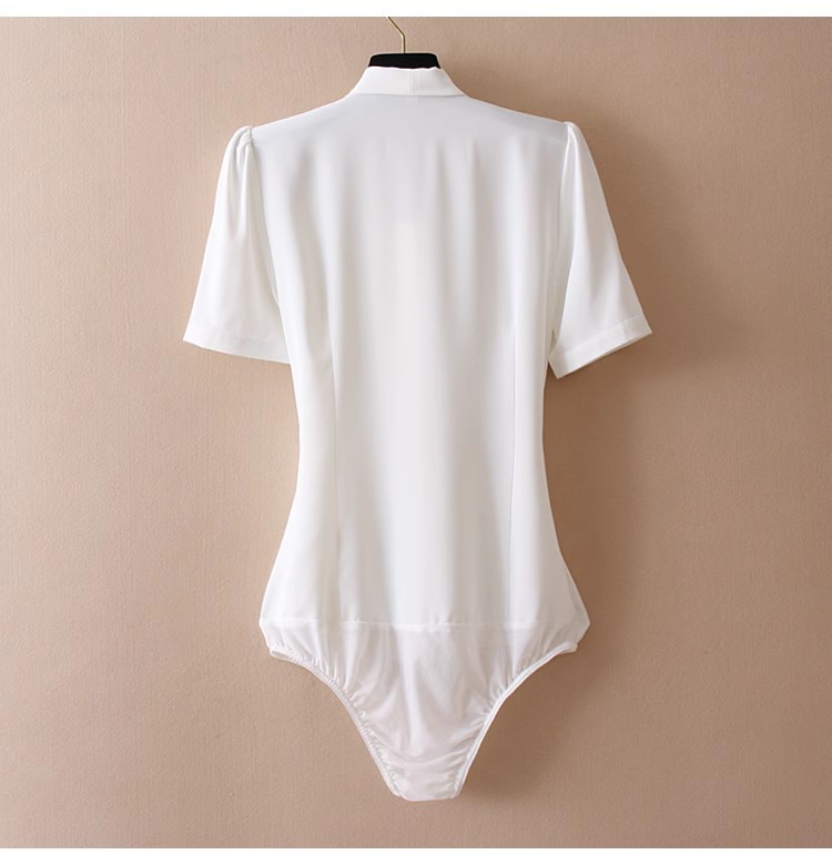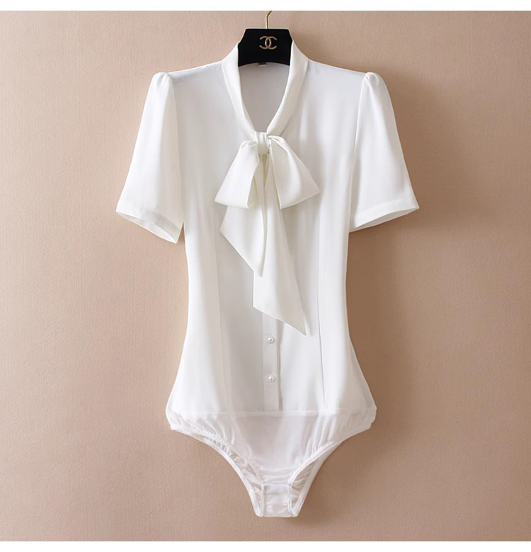 우아한 리본 활 간단한 우아한 스트레치 쉬폰 틈새 디자인 감각 원피스 셔츠 여성용 짧은 소매 화이트스토어 가기