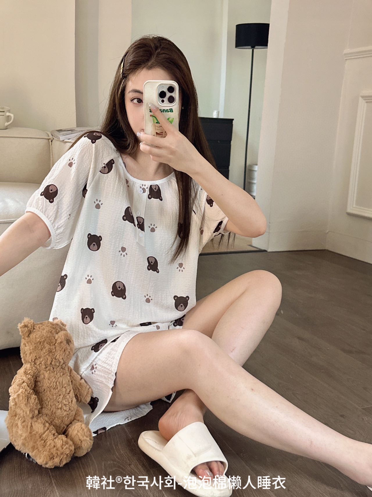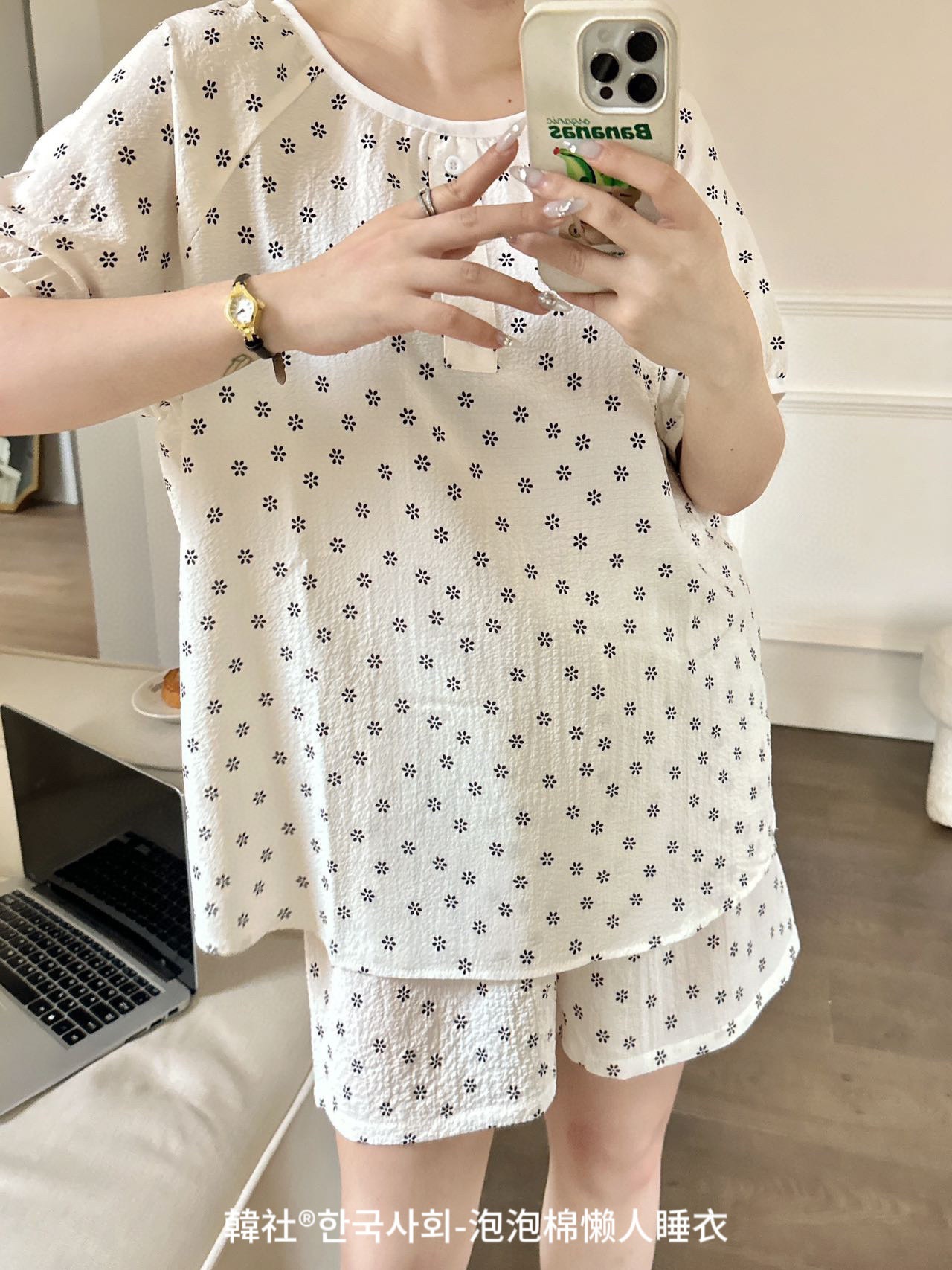 여름 새로운 간단한 만화 한국 사회 버블 면 게으른 세트 느슨한 짧은 옷 반바지 잠옷 캐주얼 가정 옷스토어 가기
