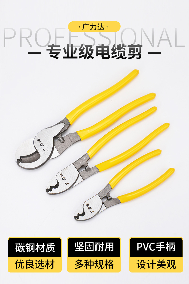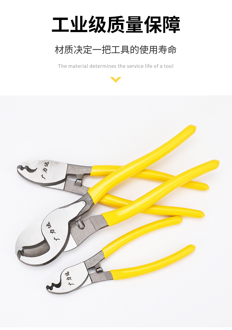 徐州广智金属工具制造有限公司是电缆剪、工业剪刀、剥线钳、金属工具等产品专业生产加工的公司,拥有完整、科学的质量管理体系。徐州广智金属工具制造有限公司的诚信、实力和产品质量获得业界的认可。公司一直以服务专业、顾客满意为经营宗旨,以求仁为大、求利为小、真正为人民服务的经营理念,开拓进取,务实创新,在做好经营的基础上,还以打造地方特色品牌为己任。在多年的经营中,坚持培养高素质员工,不断优化生产技术,用品质和服务让客户回头的经营原则;实行品质为先、快速加工,依靠专业能力获取公平回报的经营策略。坚持快速销售、合理定价,要求销售人员与客户心对心联络、面对面交流。同时,公司坚持规范经营,不追求高利润率,坚守价值底线、拒绝利益诱惑,坚持以专业能力从市场获取公平回报,是获得成功的基石。欢迎各界朋友莅临参观、指导和业务洽谈。