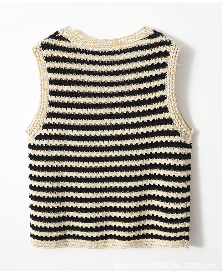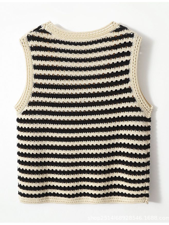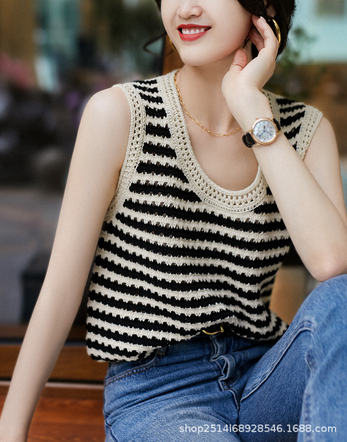 오빠의 새로운 여성 의류 2023 여름 새로운 아이스 실크 중공 라운드 넥 스트라이프 민소매 조끼 슬링 조끼 재고스토어 가기