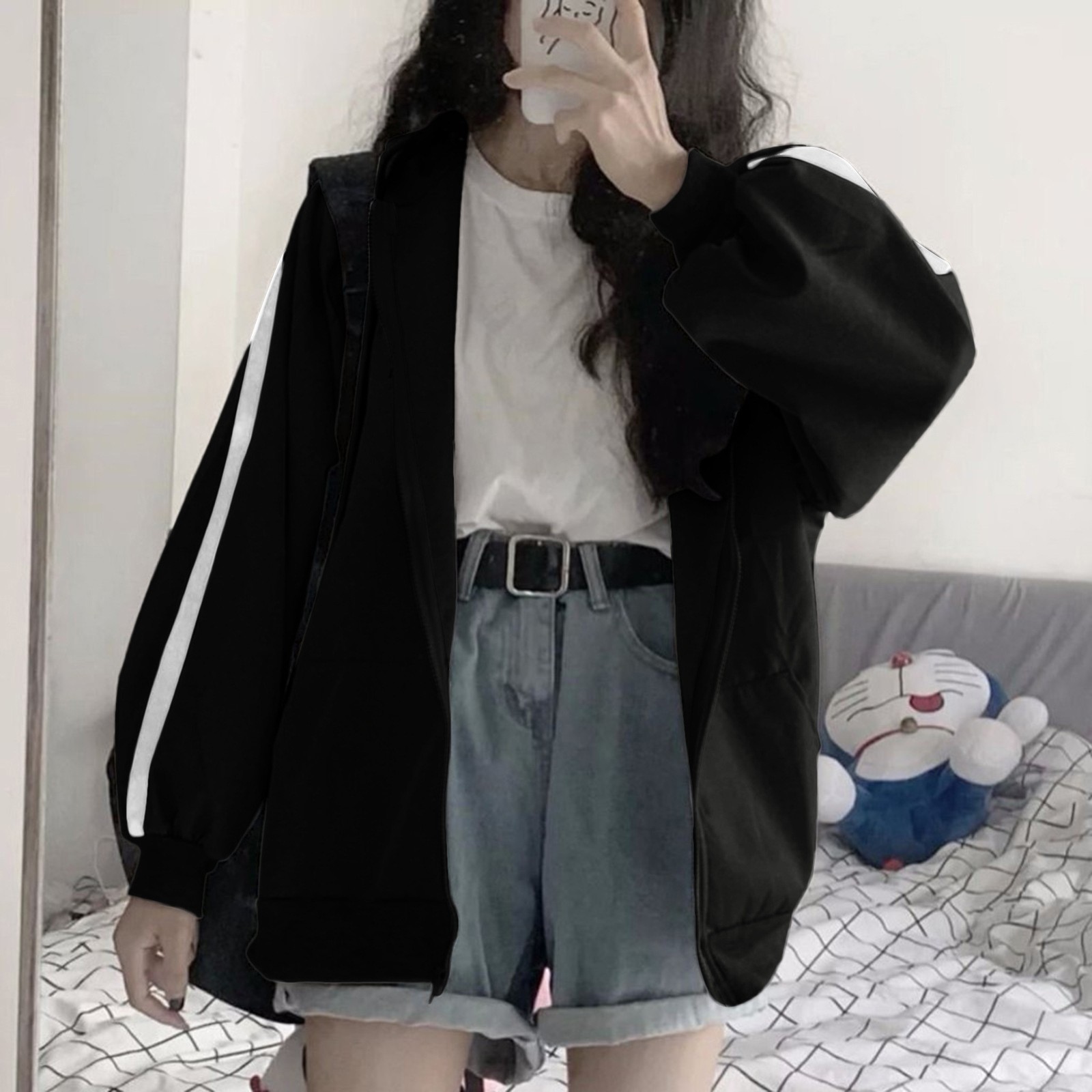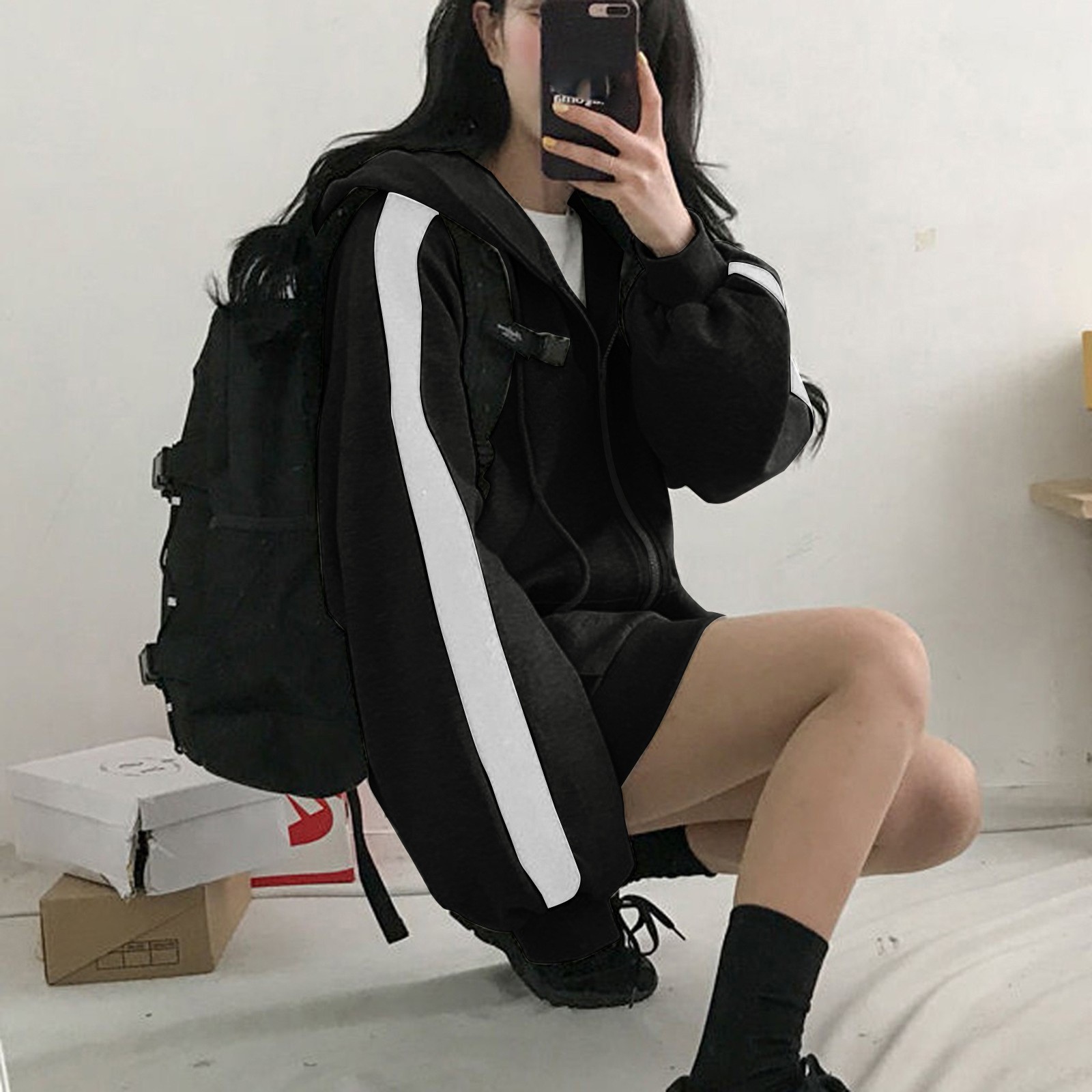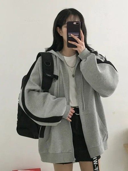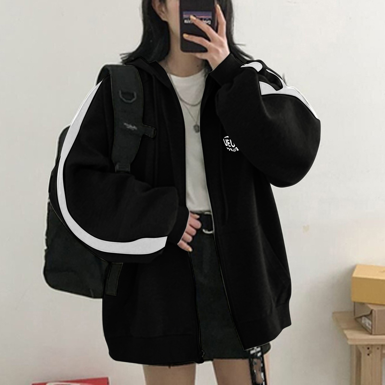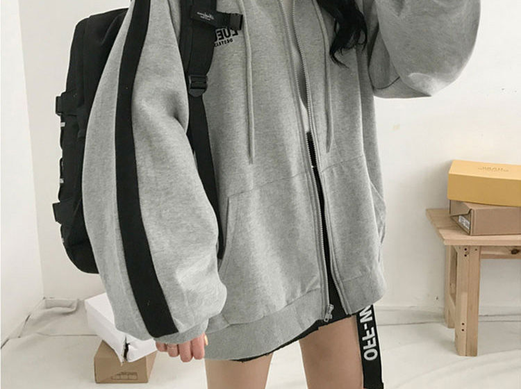 버프 컬러 블록 수 놓은 편지 지퍼 새로운 한국 스타일 가을, 겨울 여성 하라주쿠 스타일 벨벳 후드 티셔츠 자켓 여성용스토어 가기
