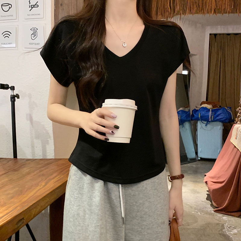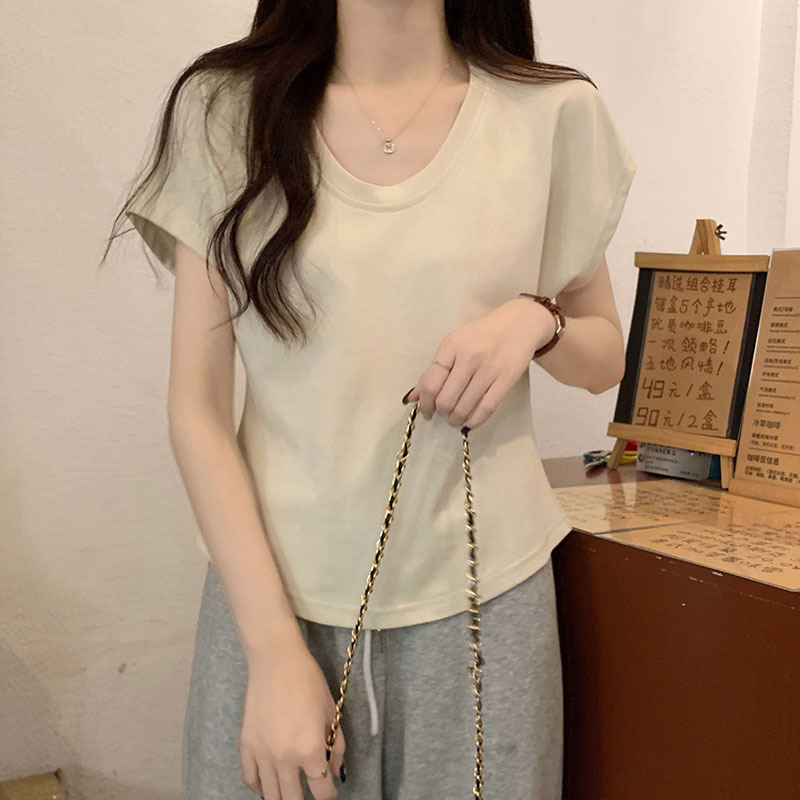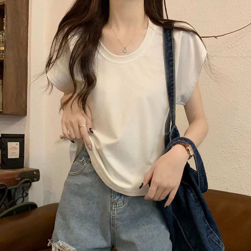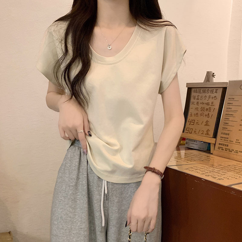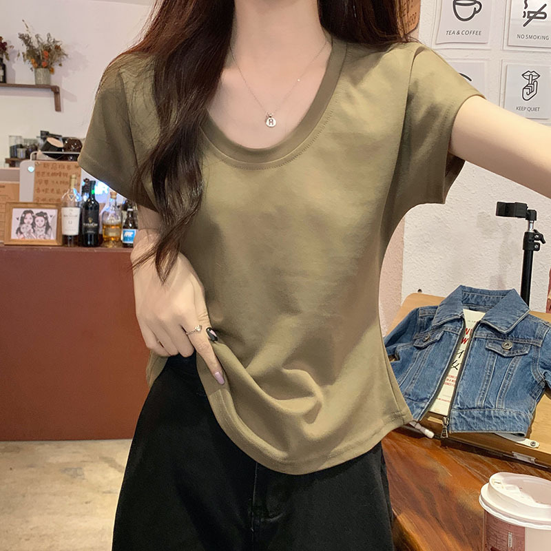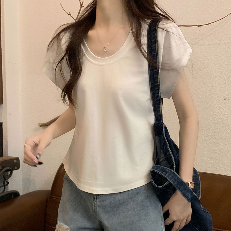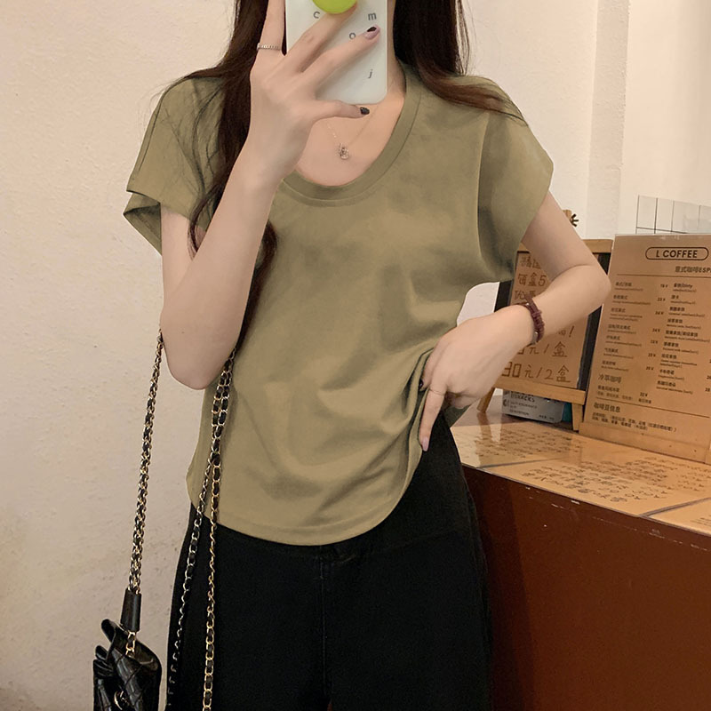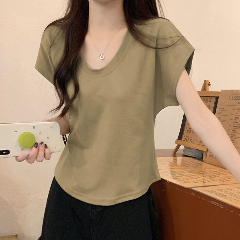 리얼 샷 리얼 프라이스 어깨 반팔 티셔츠 여성용 여름 디자인 센스 퓨어 위시 허리 슬리밍 U-넥 불규칙한 탑스토어 가기