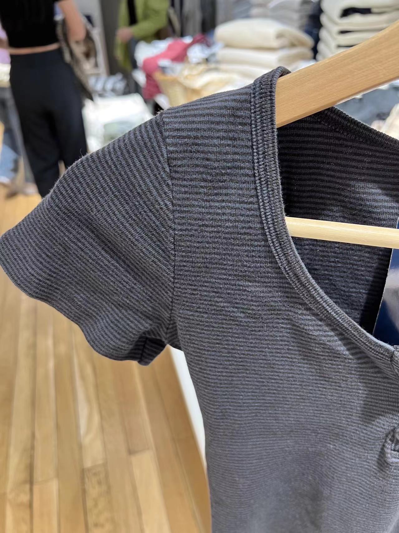 BM 새로운 아메리칸 스타일 3 버튼 네이비 회색 스트라이프 반팔 탑 bm 여성용 하이 웨이스트 슬림 핏 슬리밍 티셔츠스토어 가기