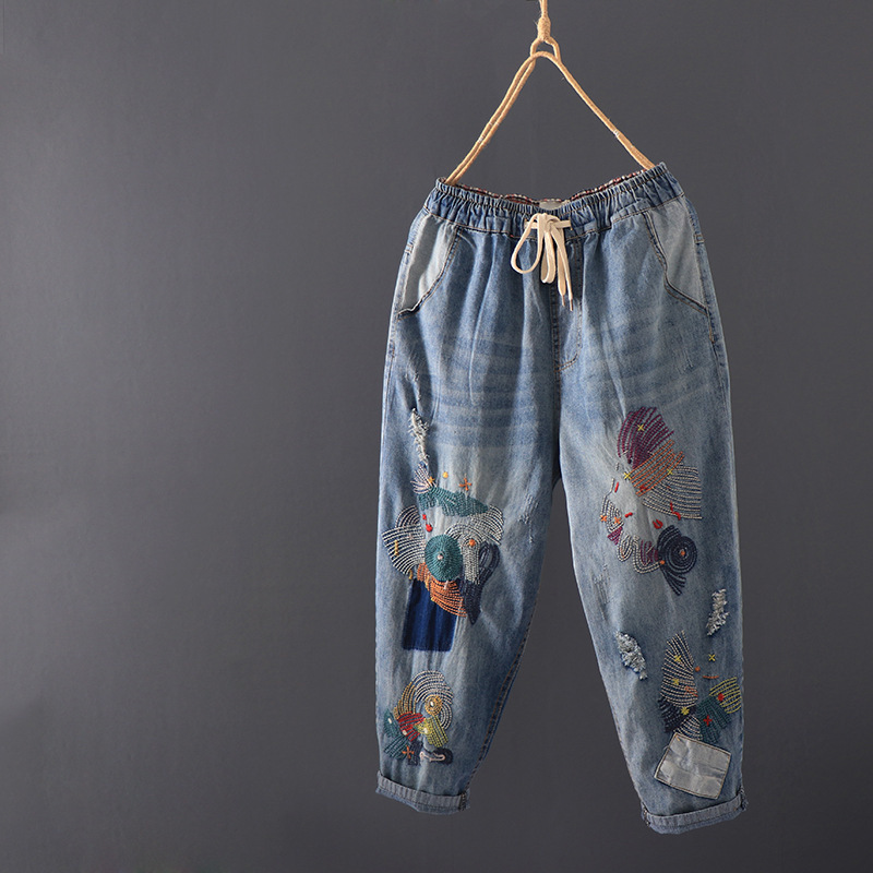 2023 여름 얇은 복고풍 예술적 바지 여성의 대조 색상 찢어진 느슨한 청바지 스트레치 허리 Harlan 당근 바지스토어 가기