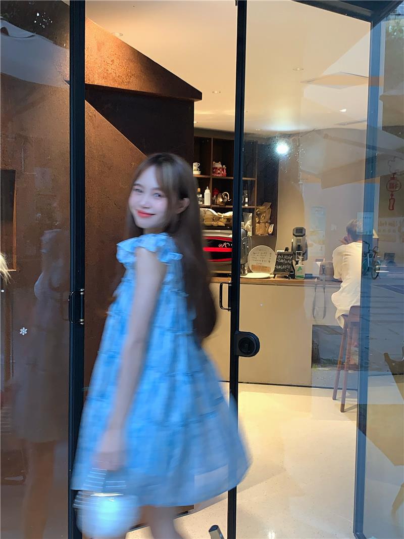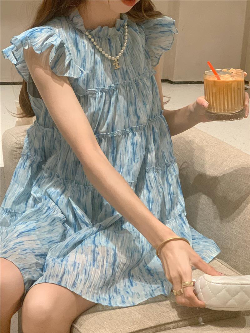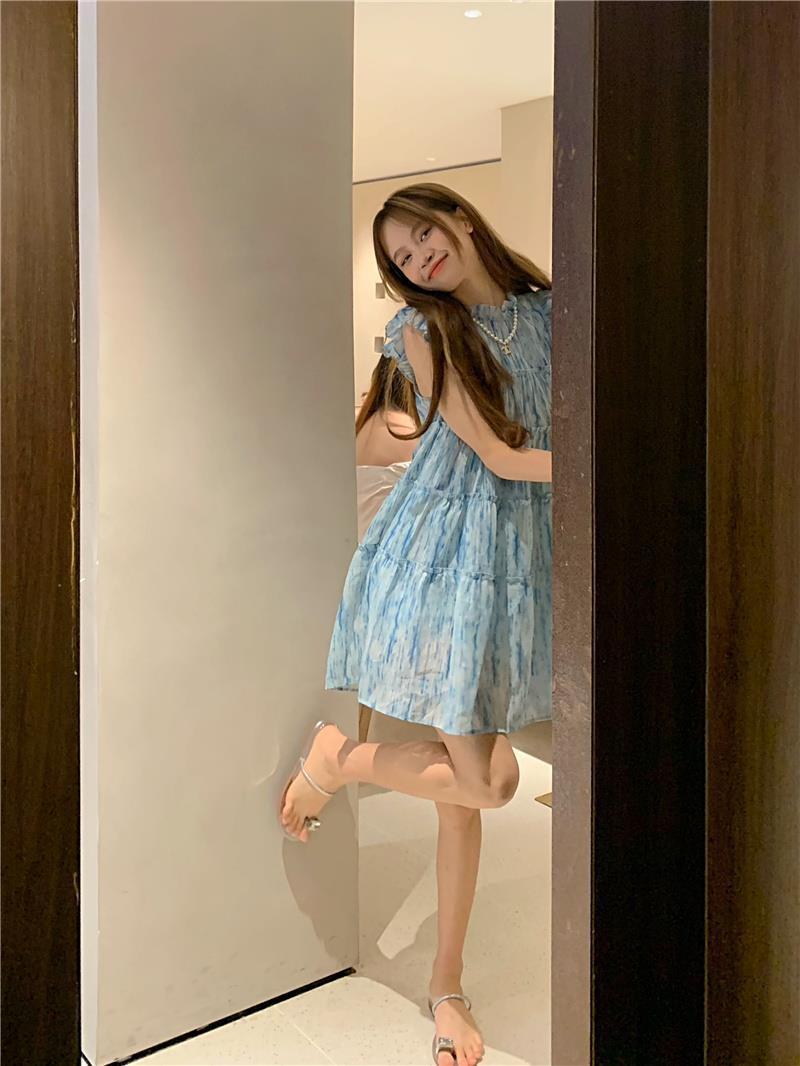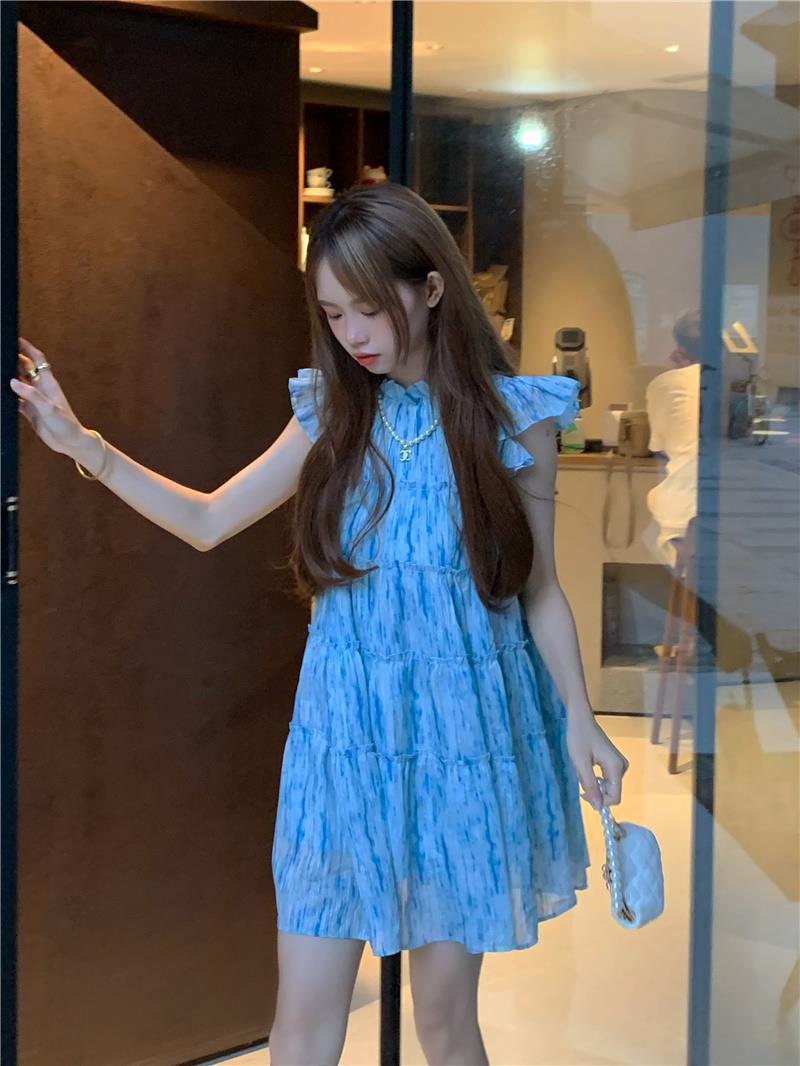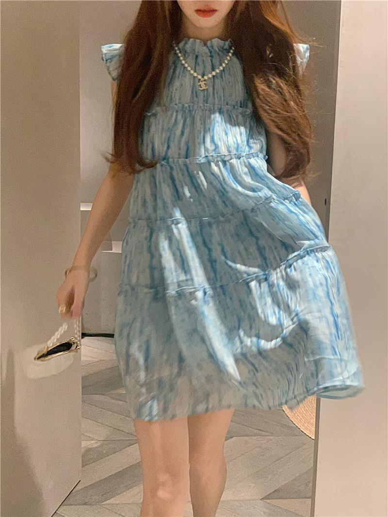 작은 플라이 슬리브 타이 다이 원피스 여성의 여름 프랑스 틈새 디자인 우아한 A-라인 스커트 작은 허리 스커트스토어 가기