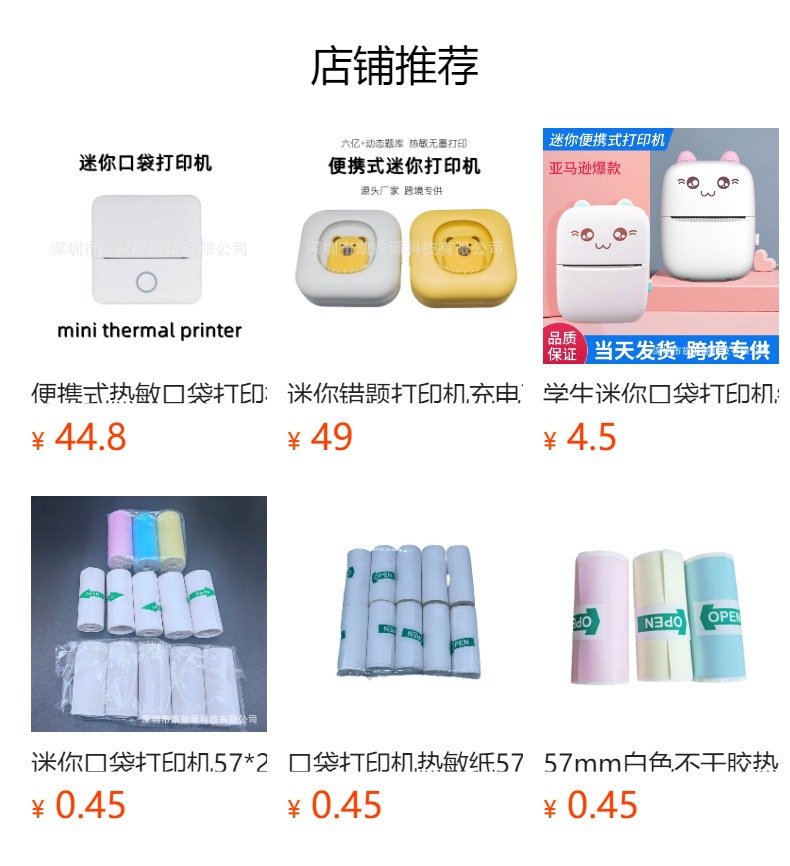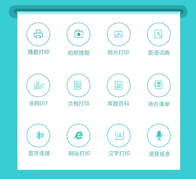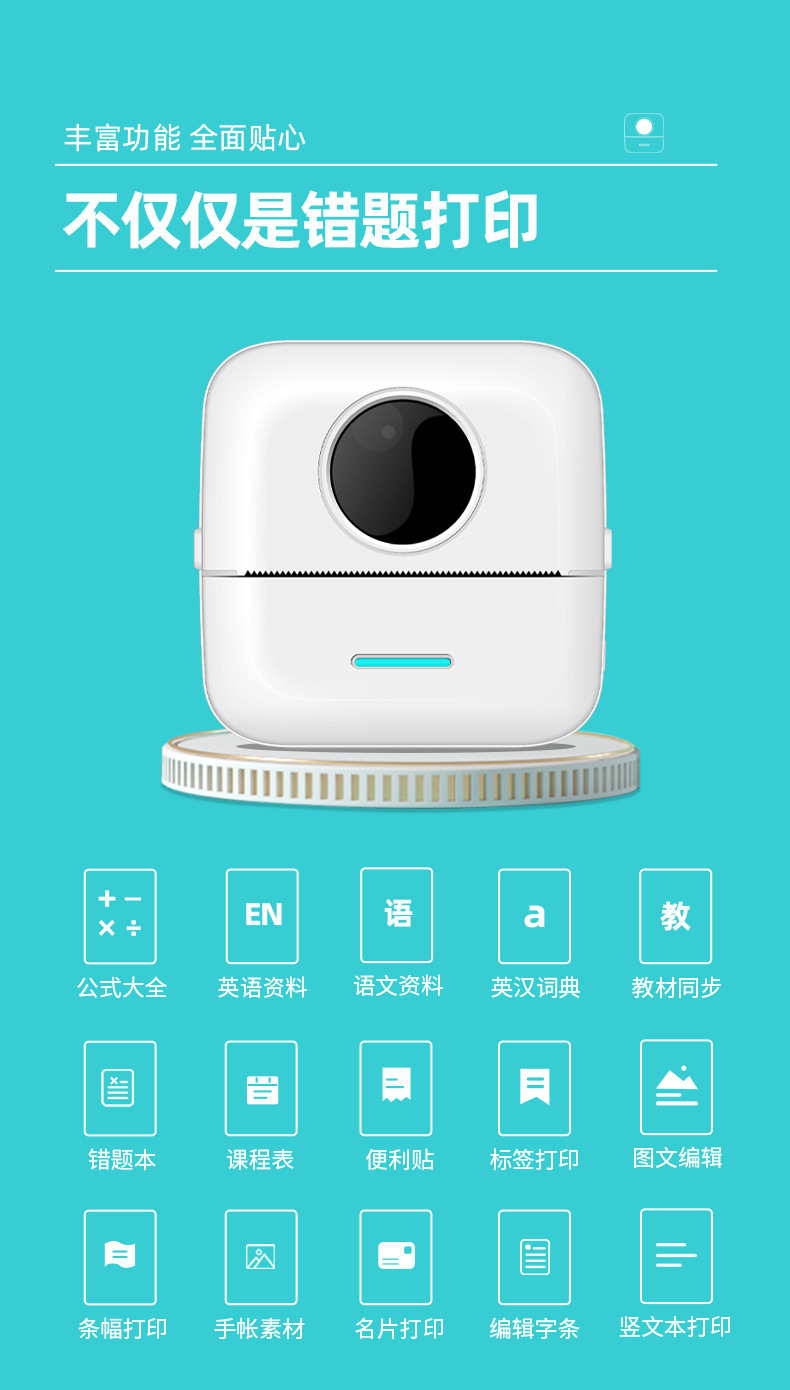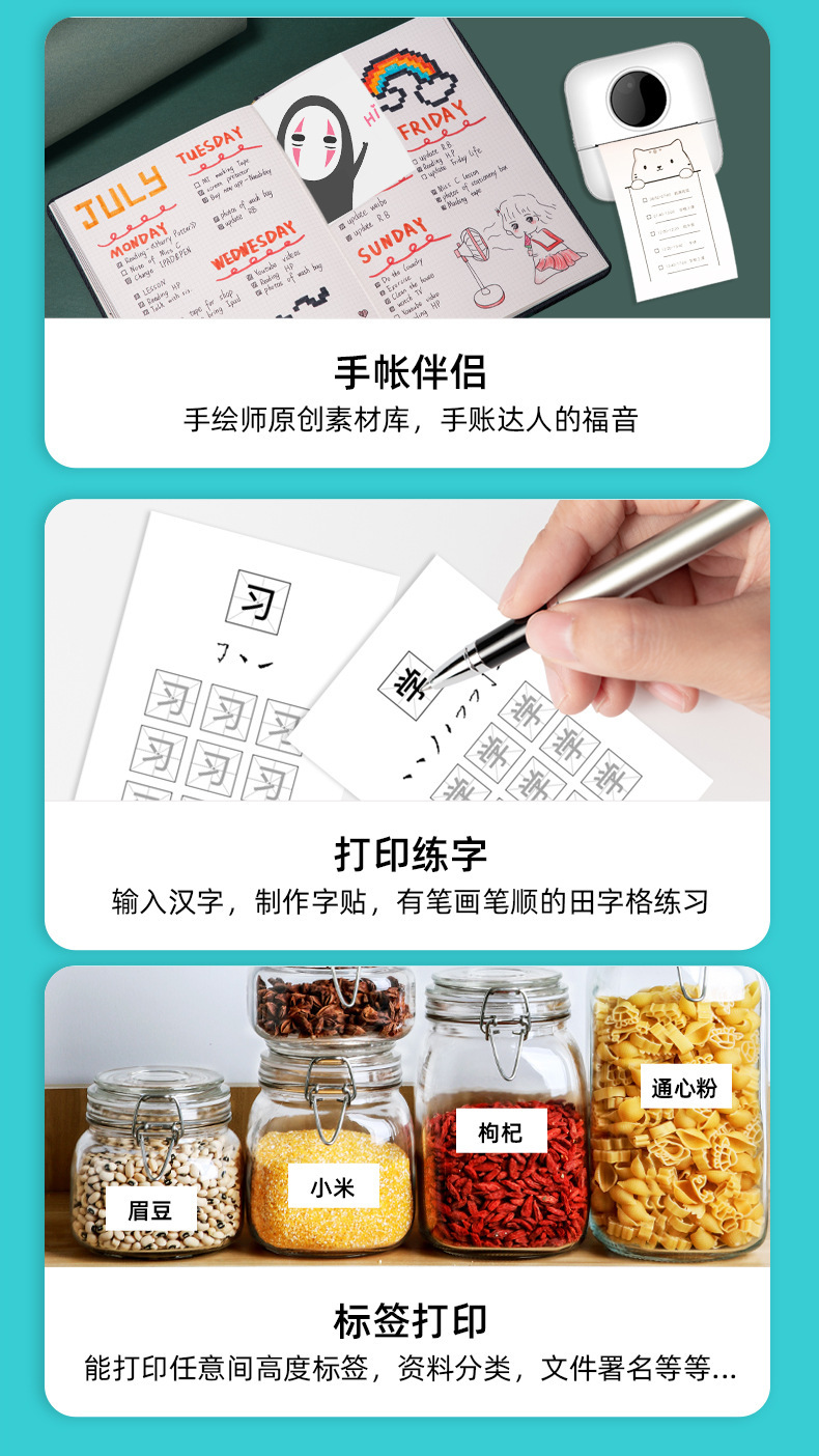 产品功能:照片打印、代办清单、素描画板、 条幅打印、文字提取、语音纸条、网页打印等 颜色分类:白色/粉色 产品尺寸:82*82*45mm 产品净重:175g 产品毛重:260g 包装清单:主机+数据线+说明书+1卷打印纸+外包装 电 源:800mah 连接方式:蓝牙BLE4.0 包装尺寸:97*53*117MM 外箱尺寸:411*280*371MM 装箱规格:60台/箱 毛 重:16.6KG