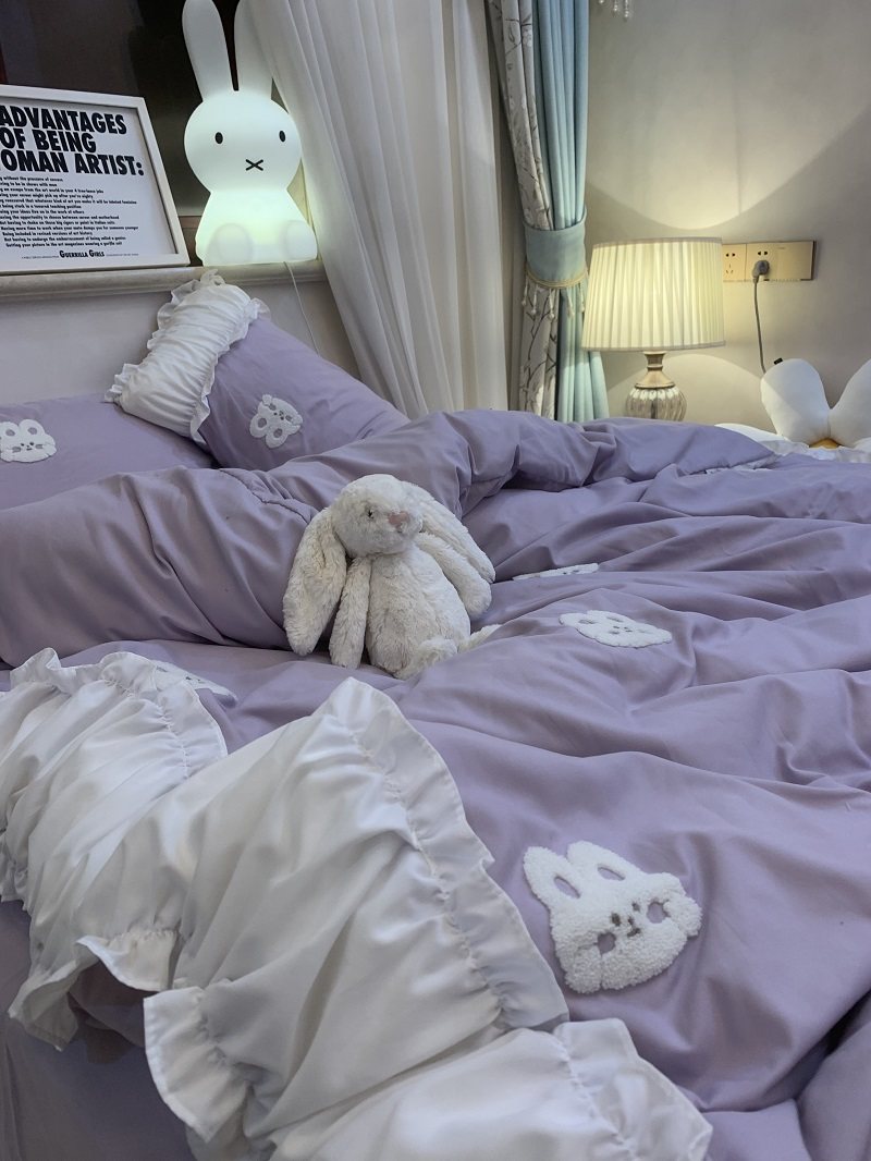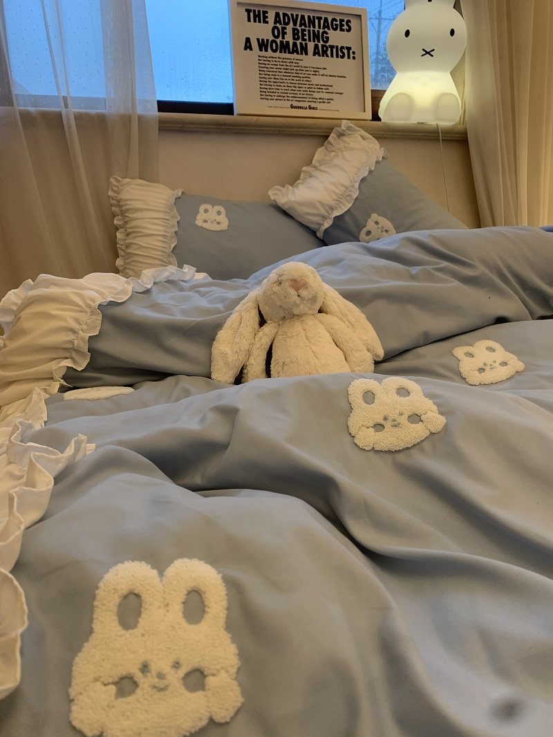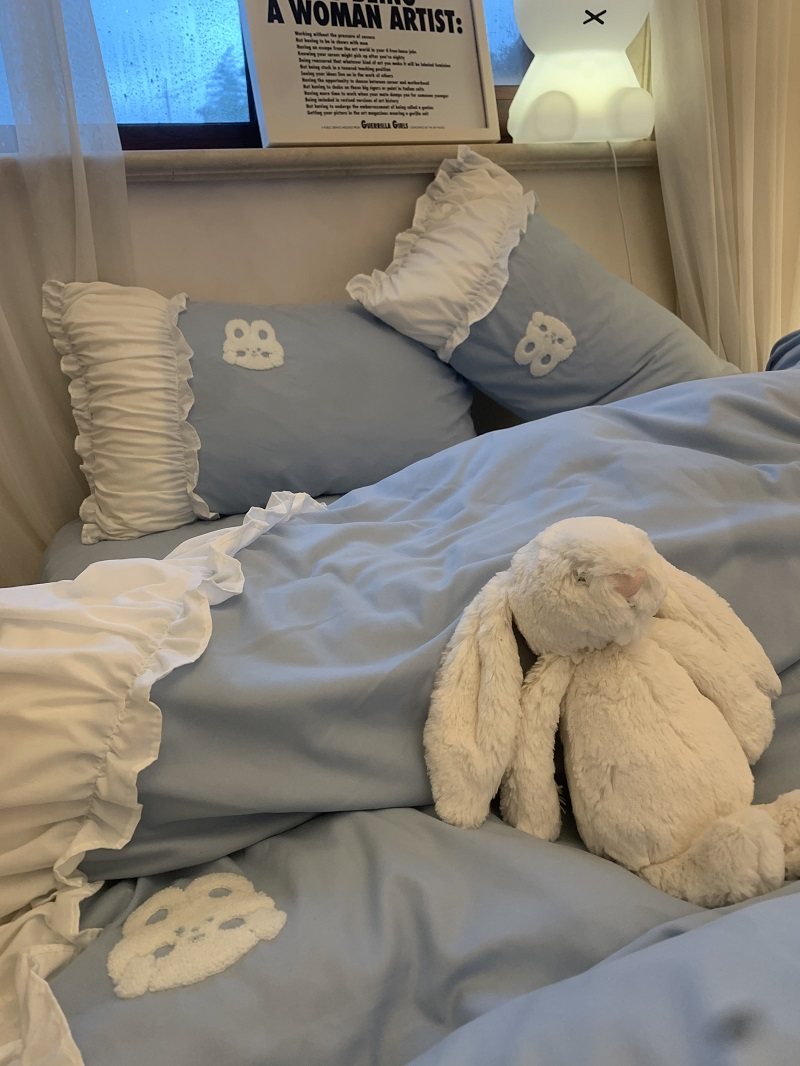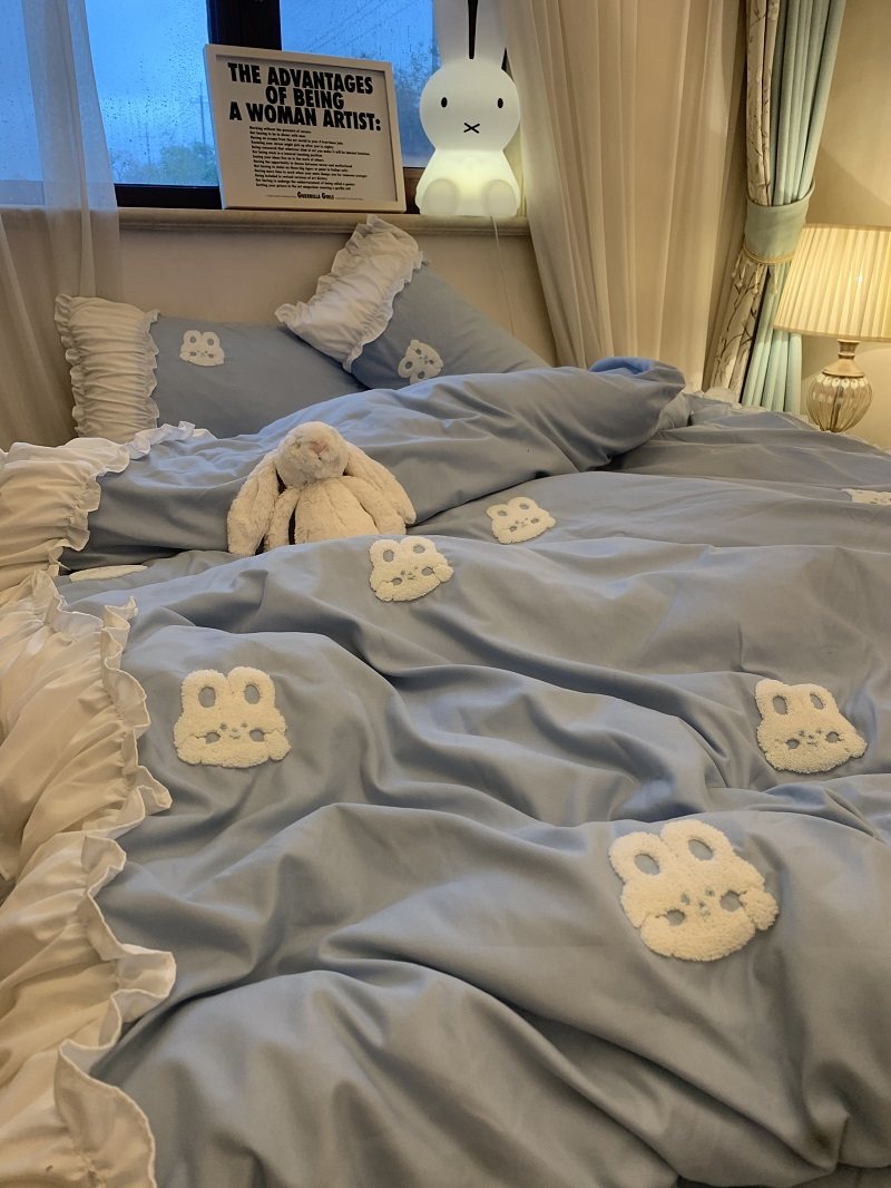 3zbyins 수건 자수 라이트 블루 토끼 침대 4 피스 1.8 소녀 공주 아트 이불 커버 시트 3