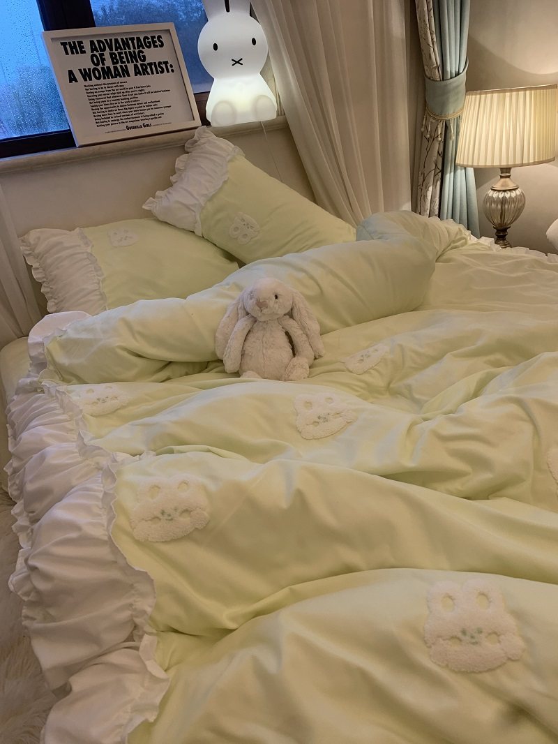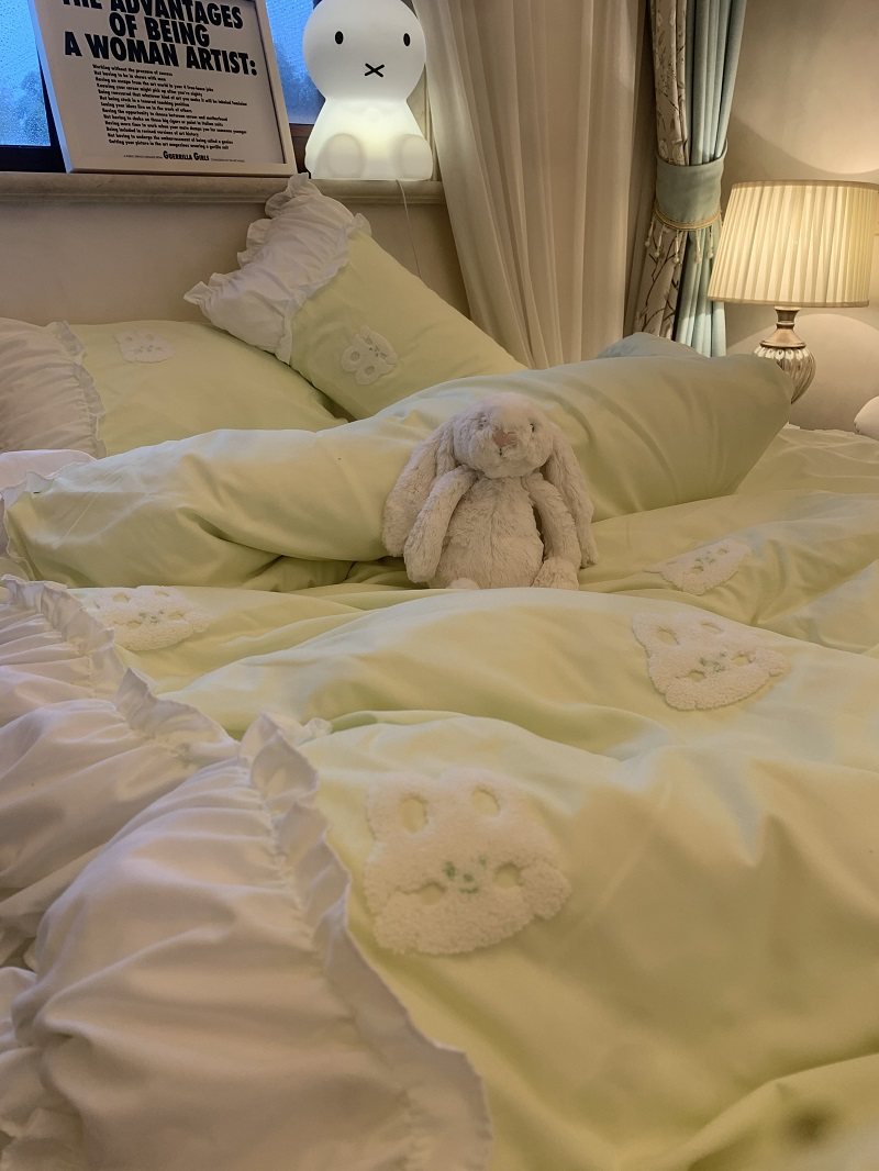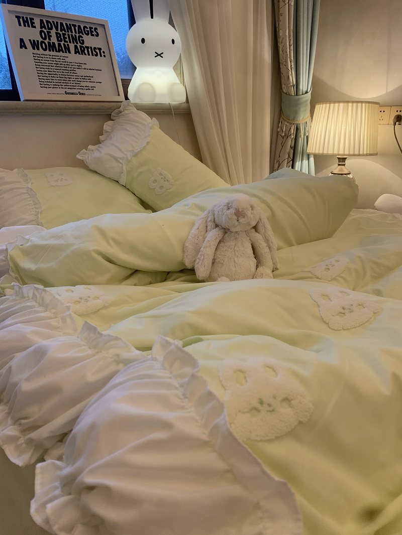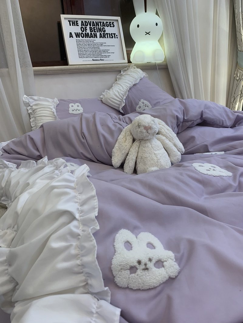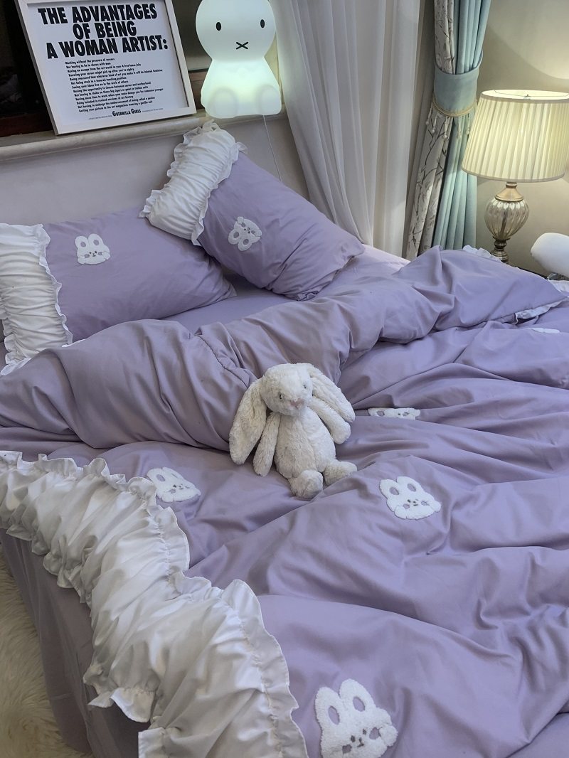 3zbyins 수건 자수 라이트 블루 토끼 침대 4 피스 1.8 소녀 공주 아트 이불 커버 시트 3
