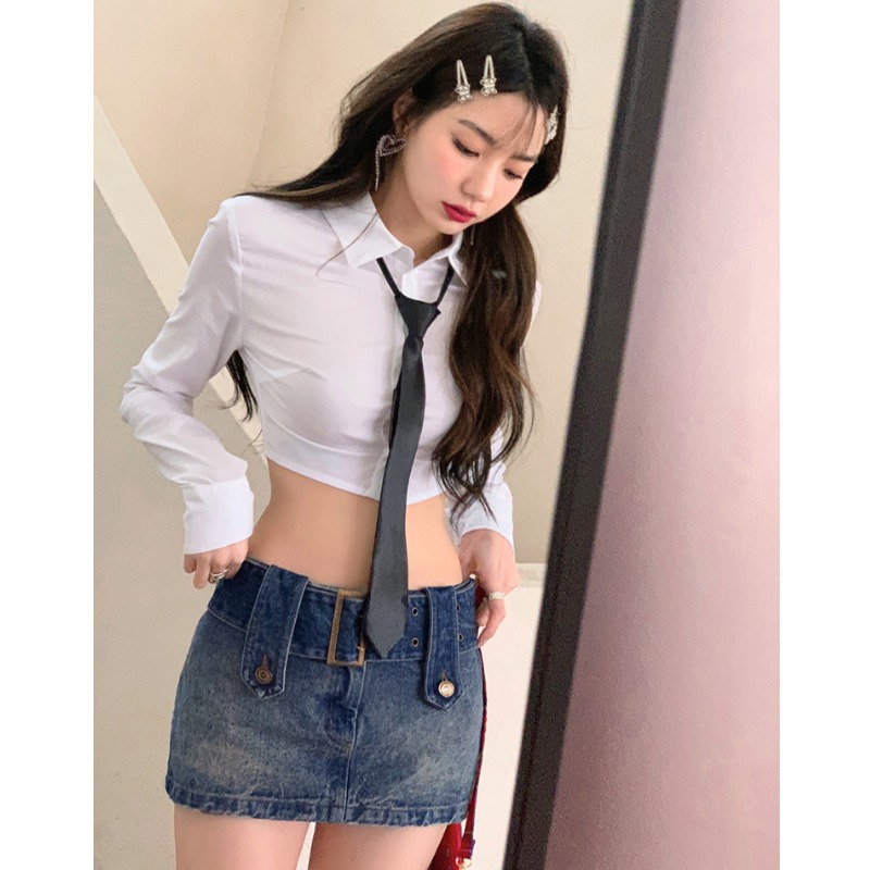 꽉 허리 하이 엔드 디자인 감각 틈새 슬림핏 타이 셔츠 여성용 봄 짧은 탑 퓨어 스파이스 소녀의 흰색 jk 셔츠스토어 가기