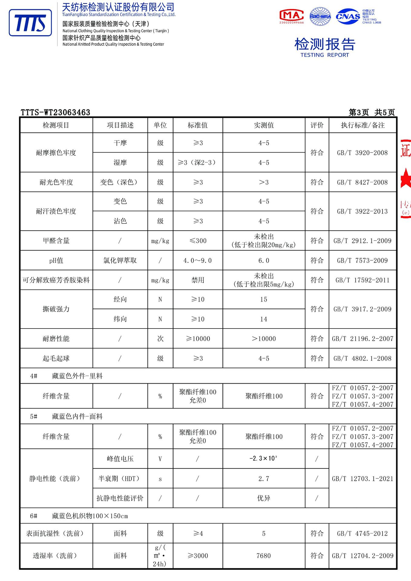 本款送检编号T T T S - W T 2 3 0 6 3 4 6 3,防水≥10000mm,透湿≥7600g/(㎡·24h),吊牌标注5000为最低达标值,非实测值,请放心穿着。