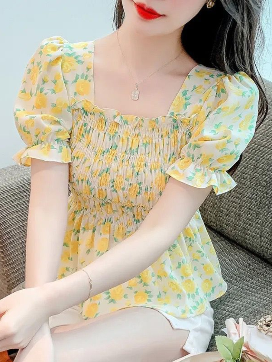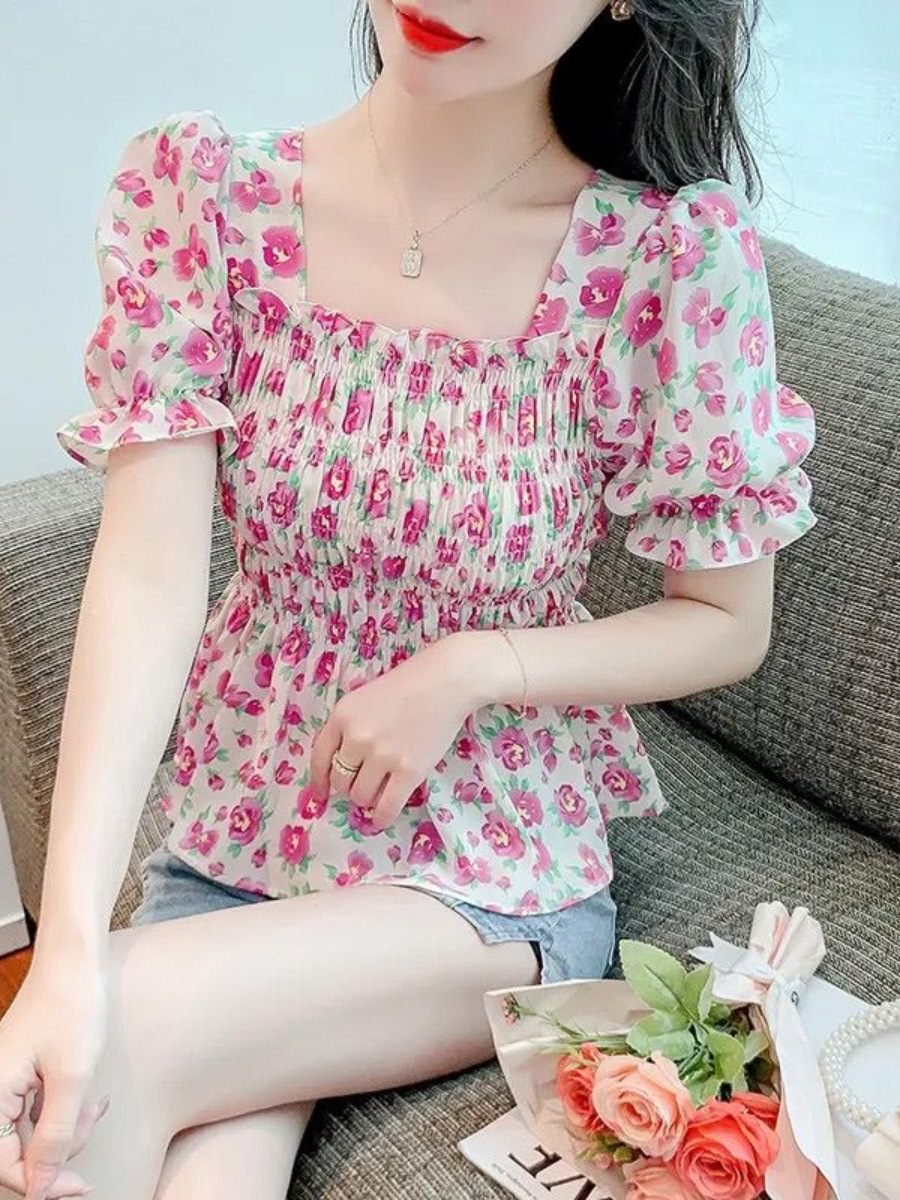반팔 쉬폰 셔츠 여성용 여름 새로운 달콤한 슬리밍 허리 프랑스 스타일 작은 셔츠 퍼프 슬리브 스퀘어 칼라 꽃 탑