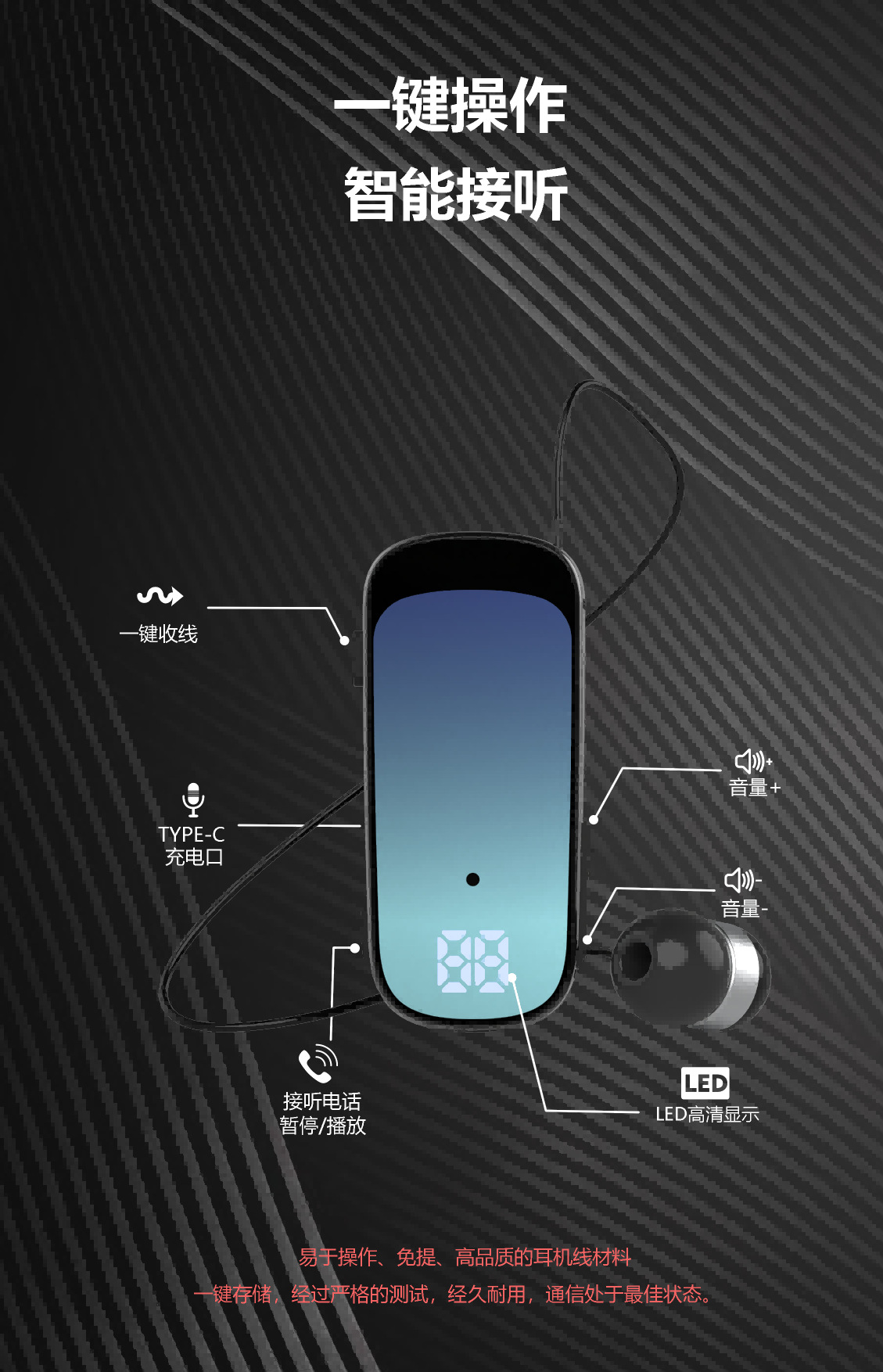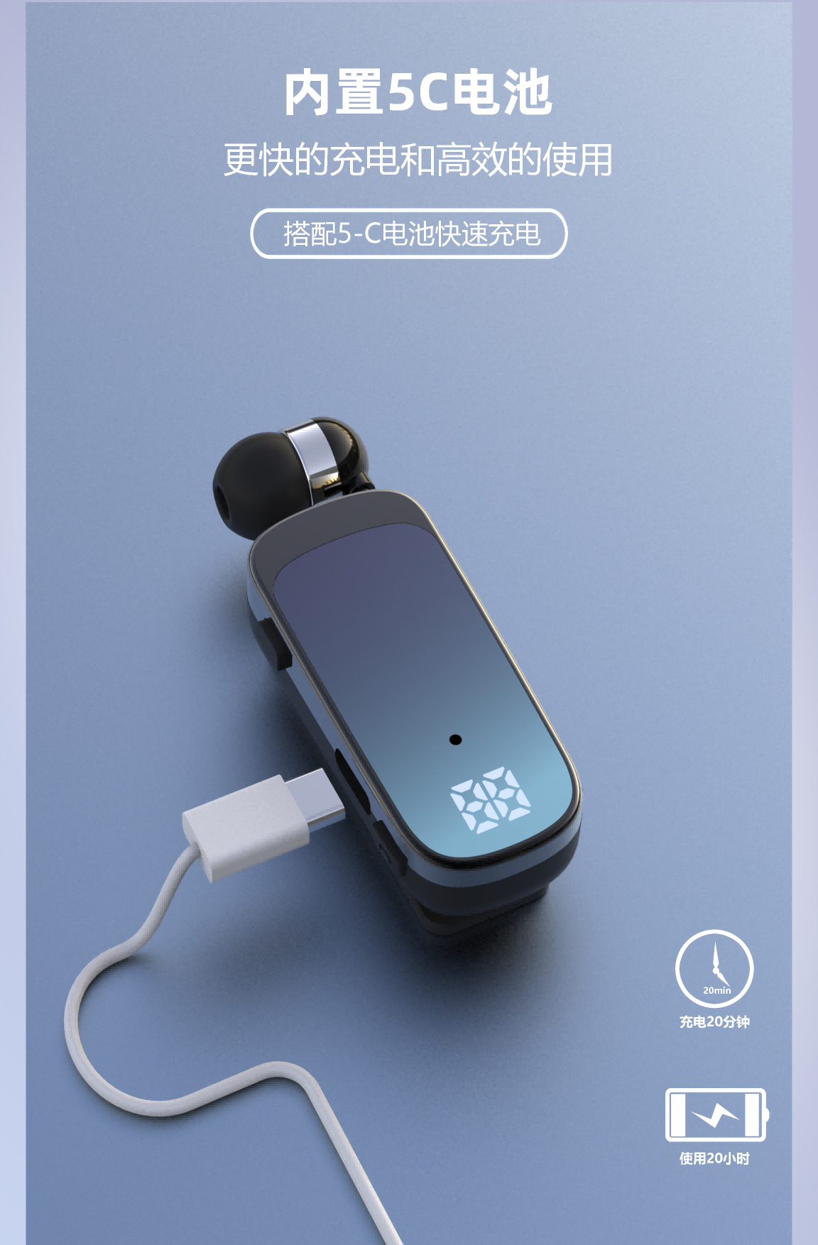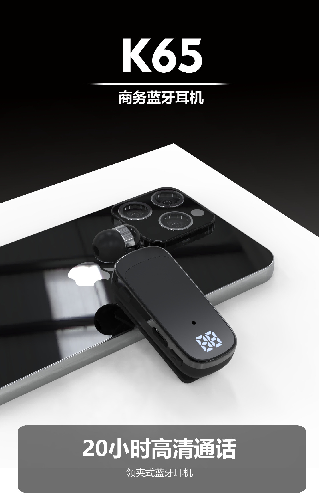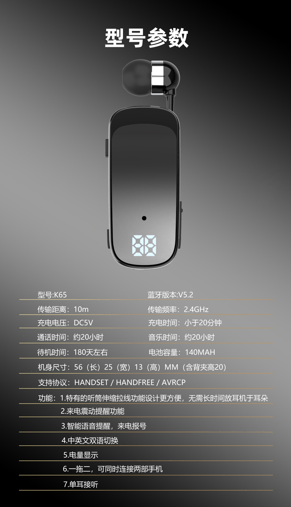 K65 신형 칼라 클립형 텔레스코픽 케이블 블루투스 헤드셋 인 이어 디지털 디스플레이 롱 내구 비즈니스 싱글 이어 헤드셋
