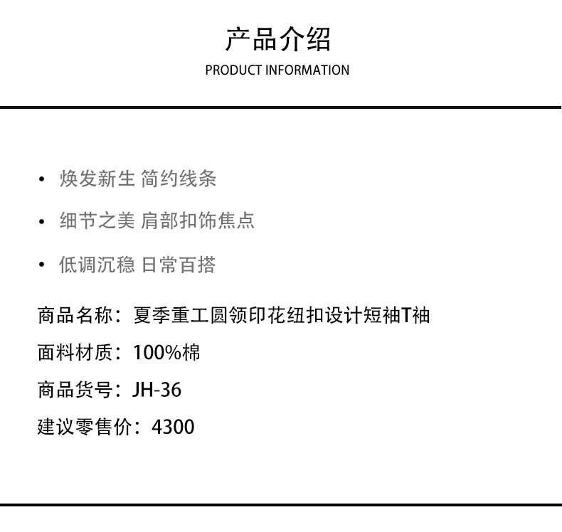 [JH-36] 2024 봄과 여름 남성 중공업 둥근 목 인쇄 버튼 디자인 짧은 소매 T 소매스토어 가기