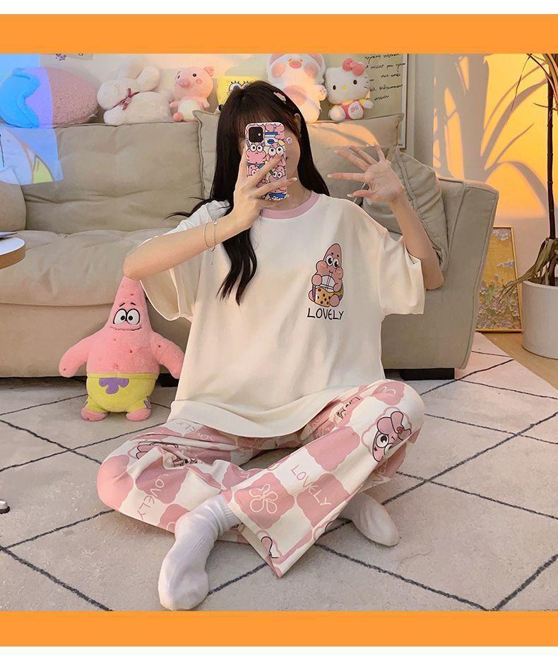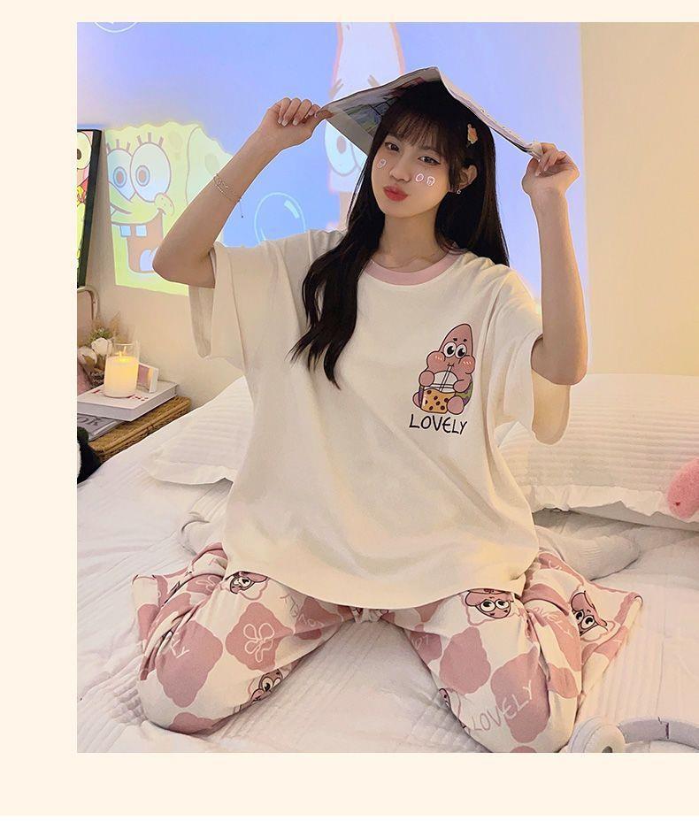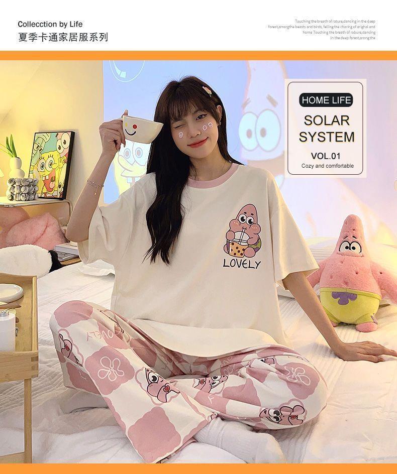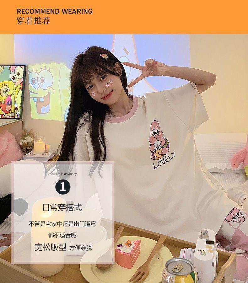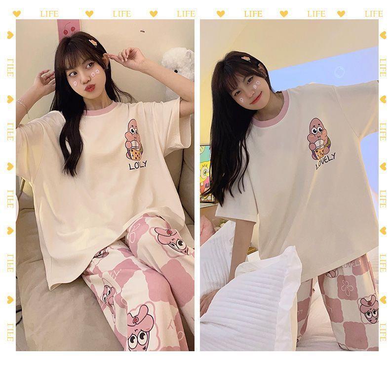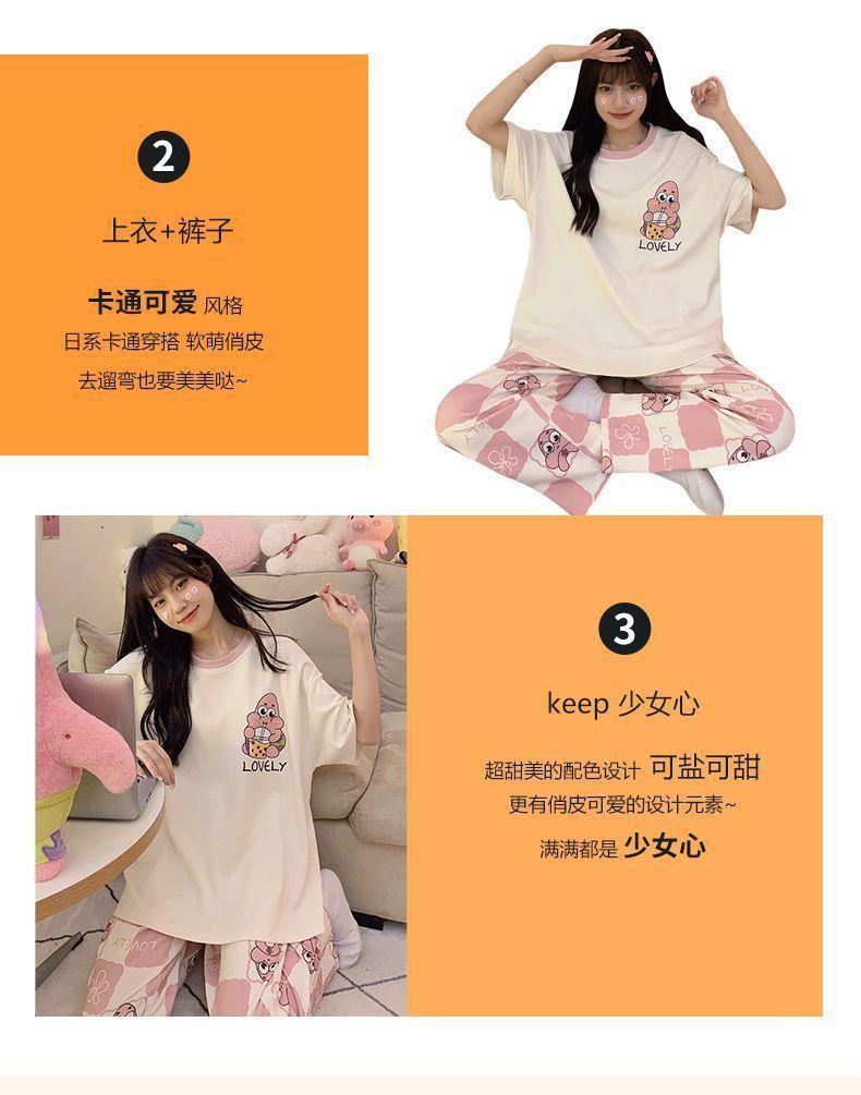 잠옷 여자의 여름 달콤한 귀여운 만화 반팔 바지 세트 여름 여자의 느슨한 가정 옷 봄과 가을스토어 가기