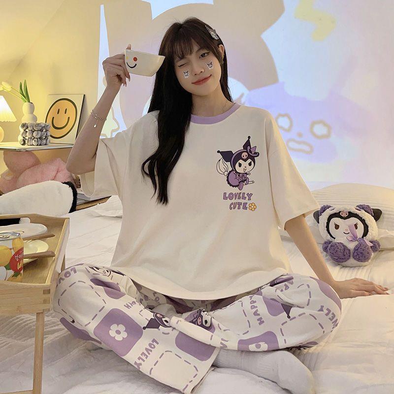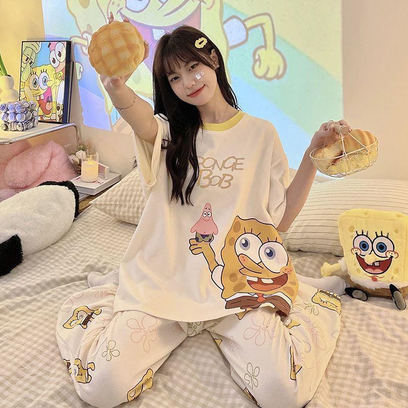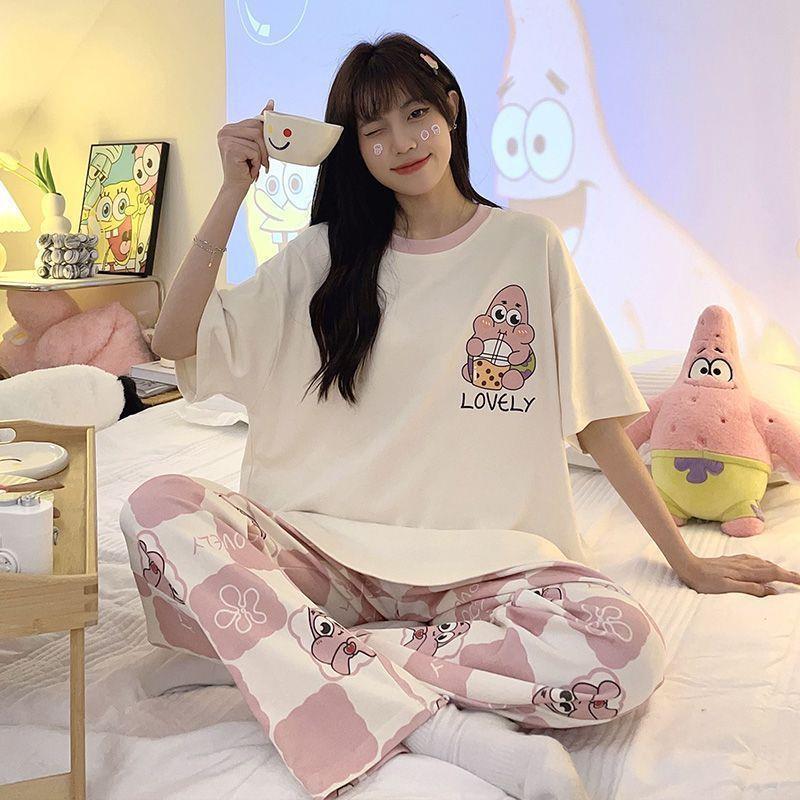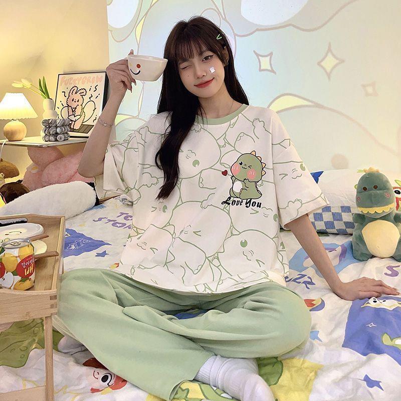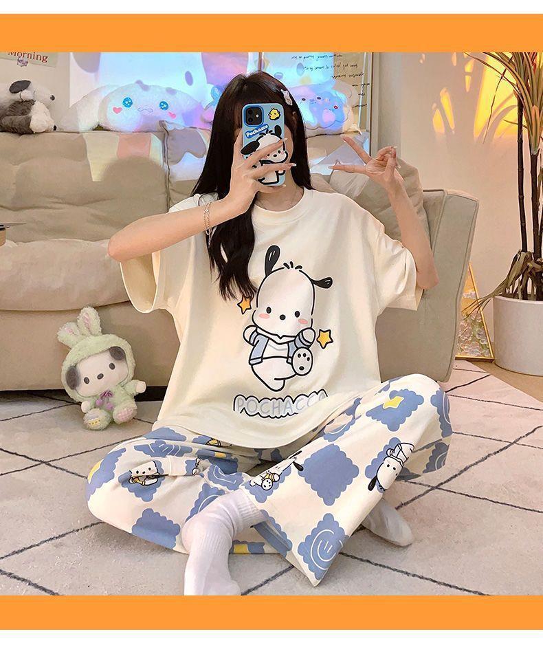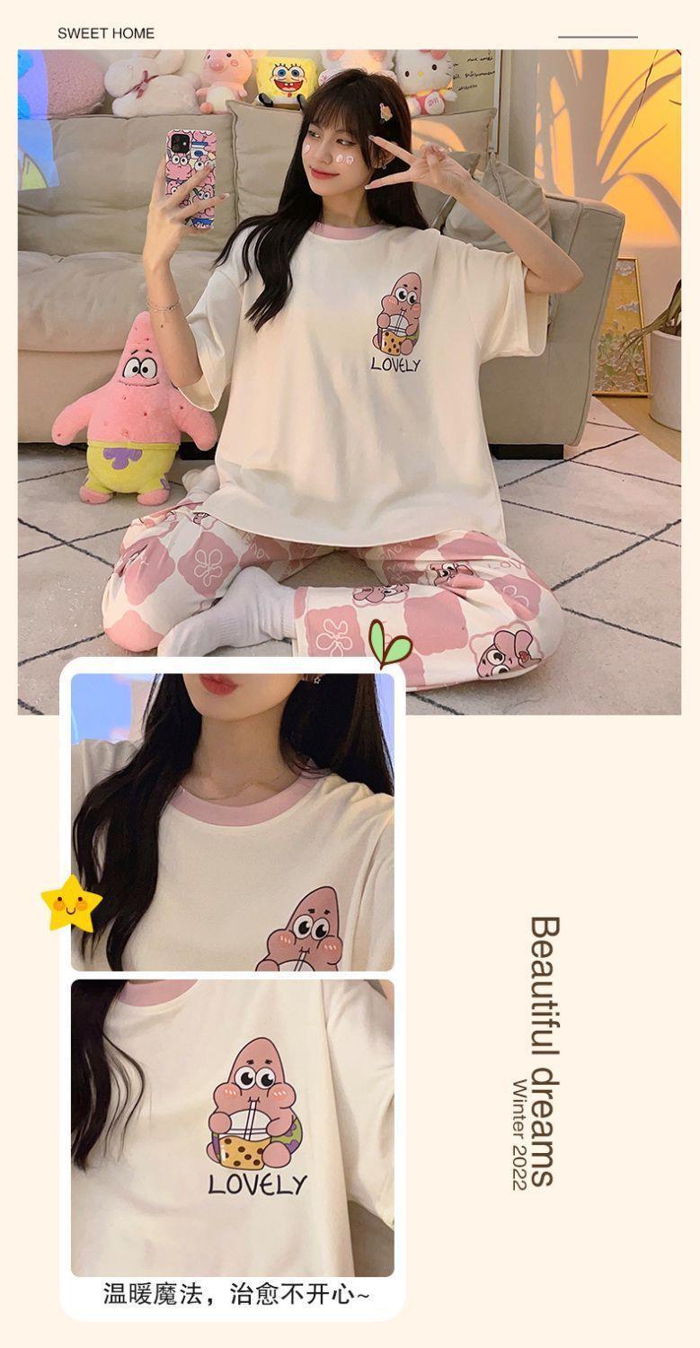 잠옷 여자의 여름 달콤한 귀여운 만화 반팔 바지 세트 여름 여자의 느슨한 가정 옷 봄과 가을스토어 가기