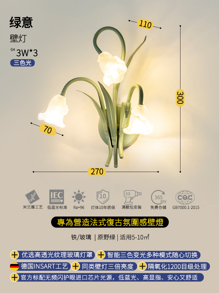 프랑스 목가적 인 크림 스타일 침실 침대 옆 벽 램프 창조적 인 꽃 배경 벽 미국 녹색 LED 신선한 벽 램프