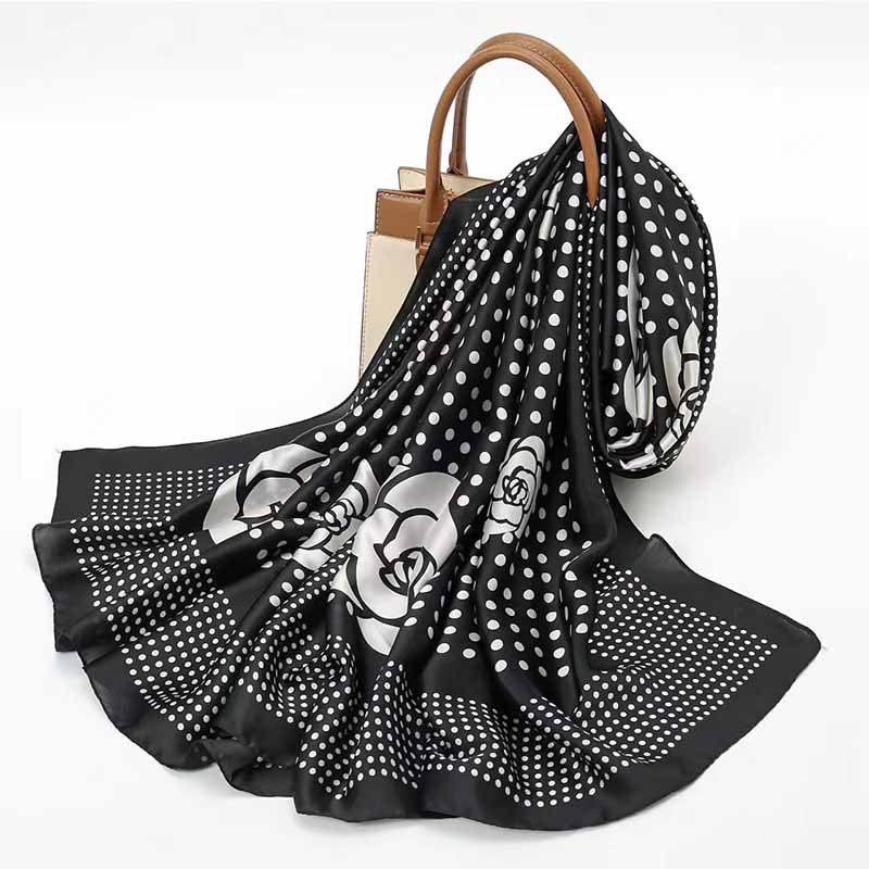 새로운 2023 새틴 흑백 인쇄 실크 스카프 여성용 조커 목도리 스카프 패션 트렌드 제조업체 도매스토어 가기