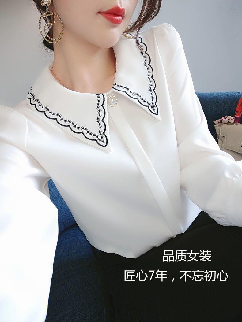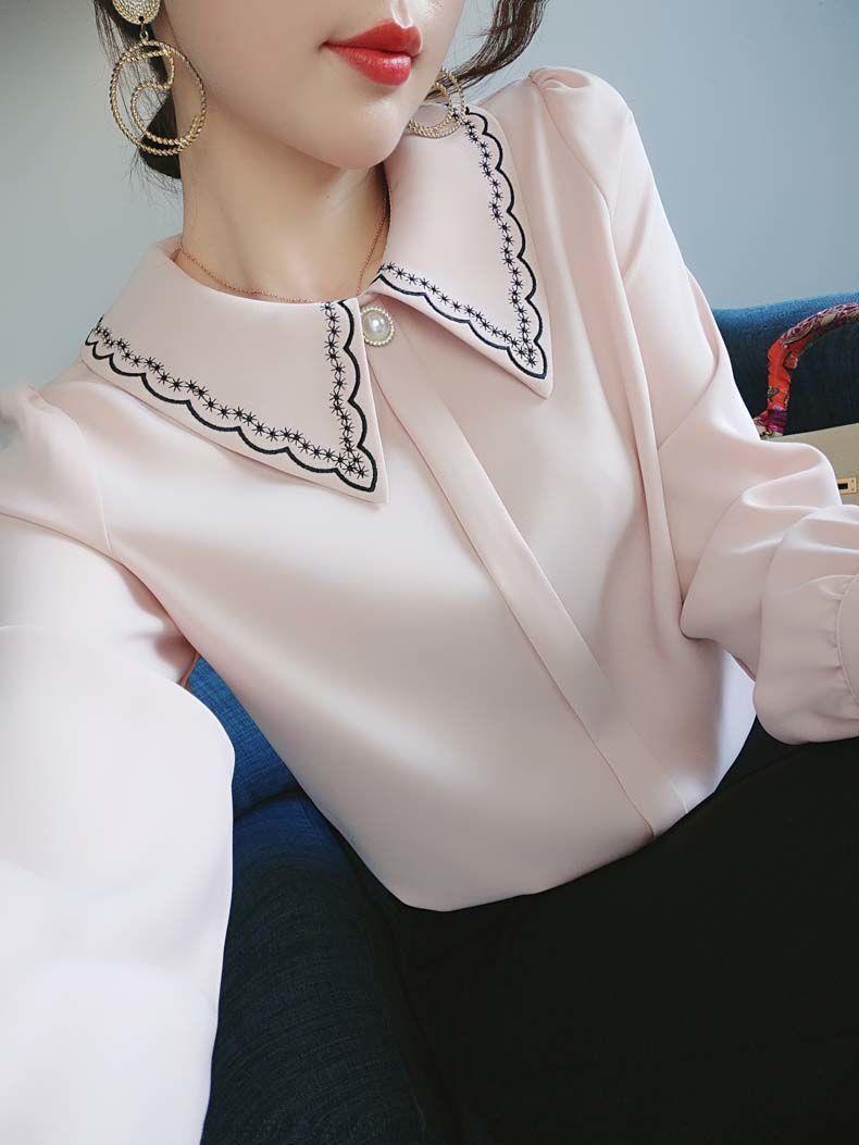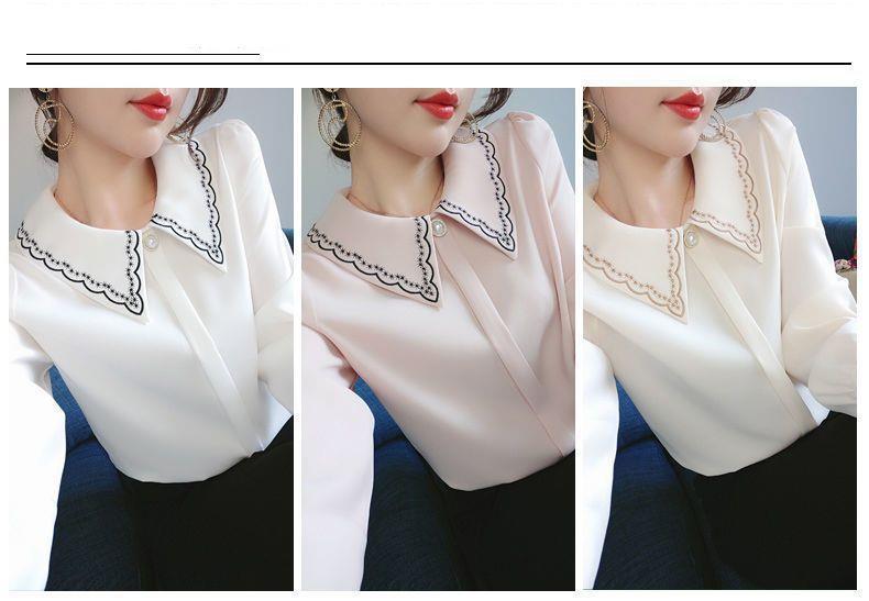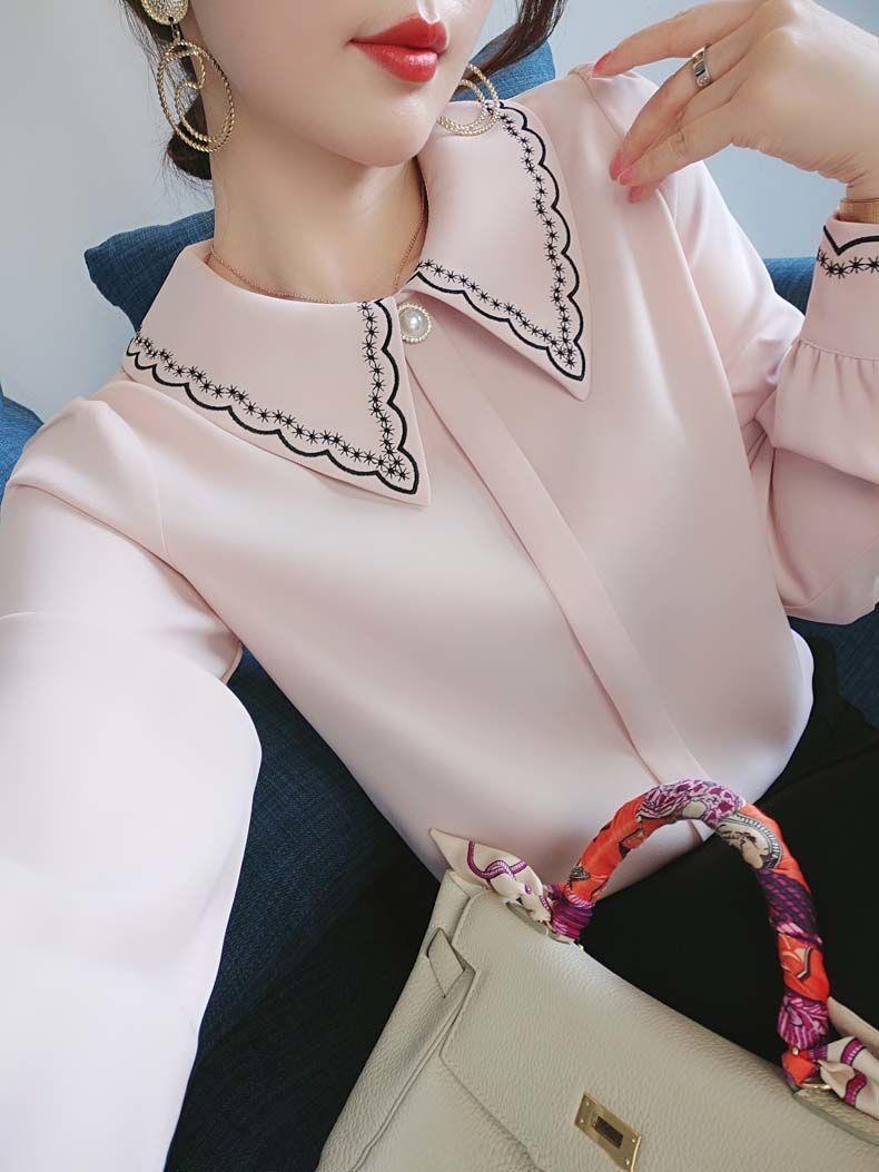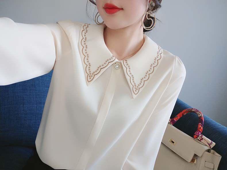 2023 봄 새 쉬폰 셔츠 풀오버 여성용 자수 디자인 감각 틈새 트렌디 모든 매치 인형 칼라