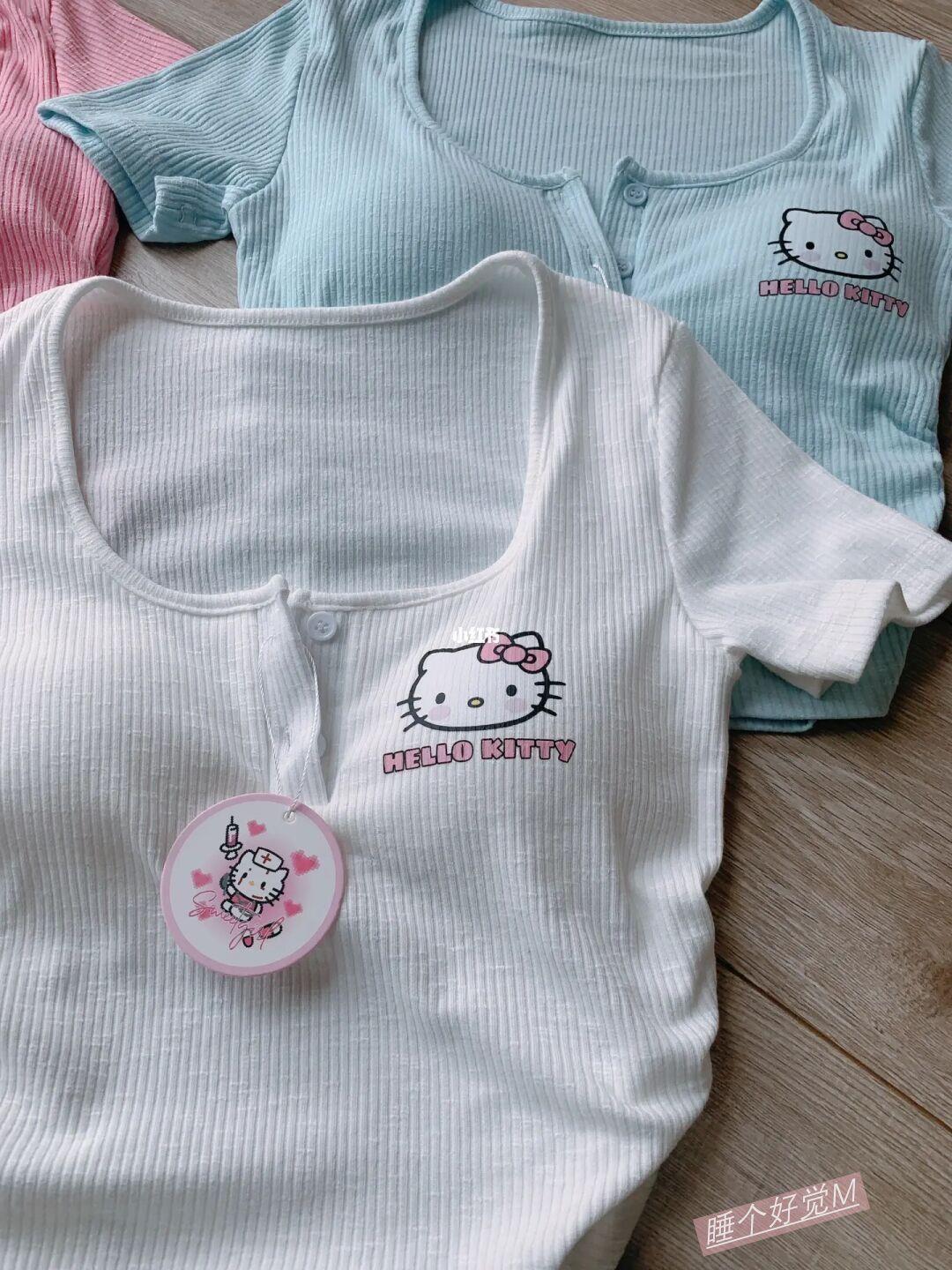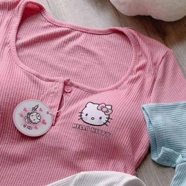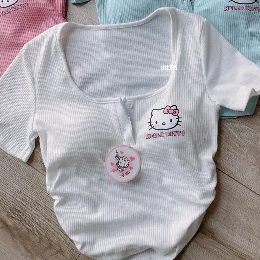 헬로 키티 새로운 반팔 여성 봄과 여름에는 가슴 패드 핫 소녀 소녀의 짧은 슬림 핏 언더 셔츠 탑이 함께 제공됩니다.스토어 가기