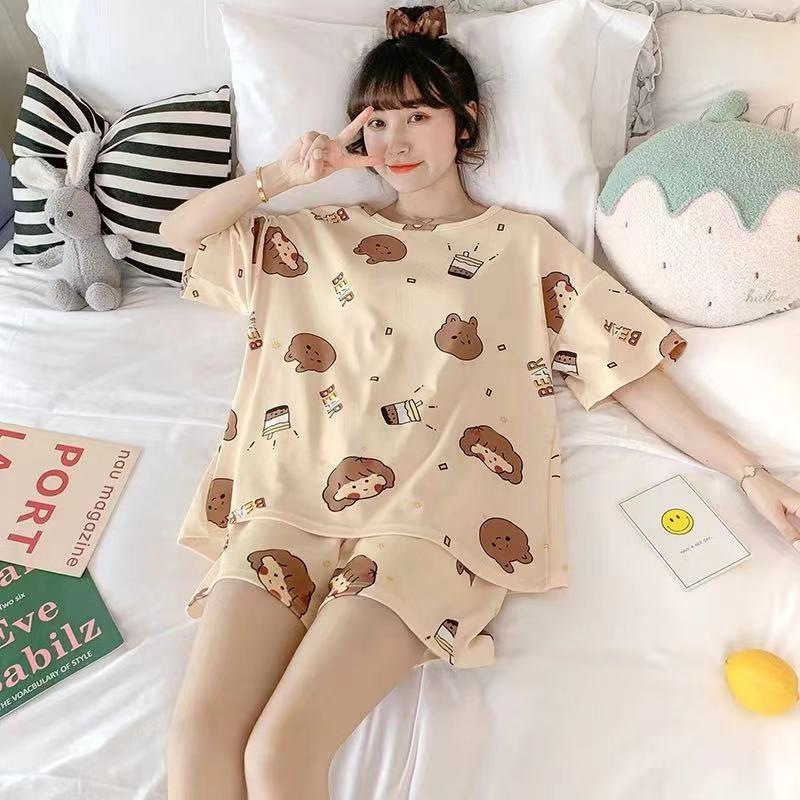 잠옷 여자의 여름 반팔 귀여운 만화 얇은 느슨한 플러스 사이즈 여름 여자의 여름 오리 가정 옷 세트스토어 가기