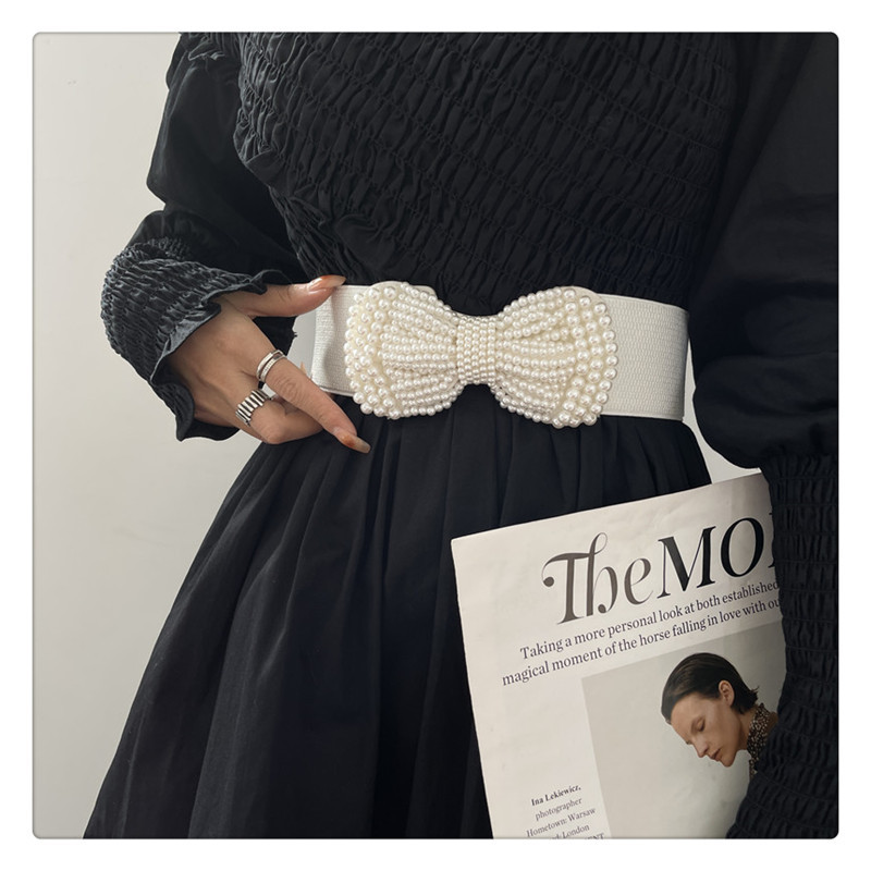 블랙 탄성 벨트 한국 스타일 여자의 진주 활 탄성 허리 커버 여자의 원피스 모든 일치 달콤한 장식스토어 가기