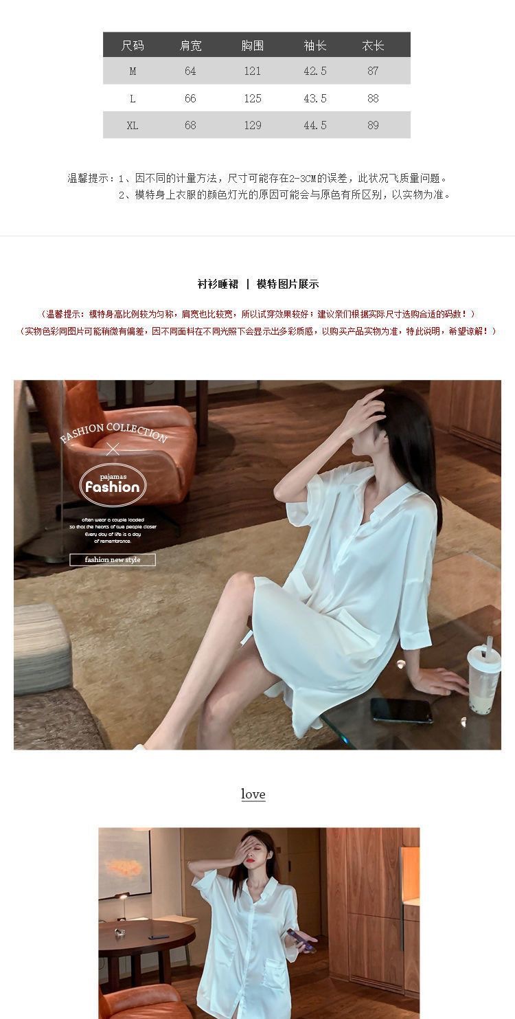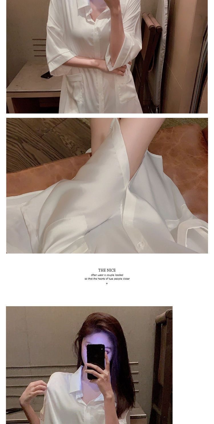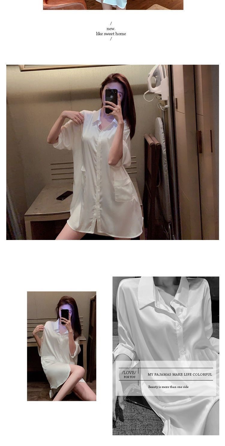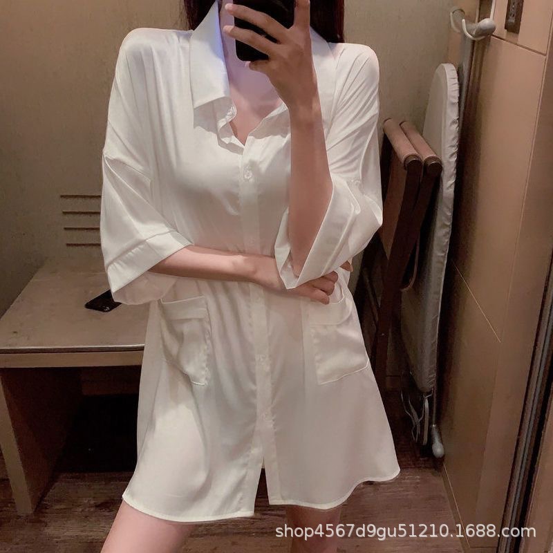 2023 잠옷 여자의 봄과 여름 얼음 실크 섹시한 얇은 남자 친구 스타일 흰색 셔츠 인터넷 인기 중간 길이 실크 모조 잠옷스토어 가기