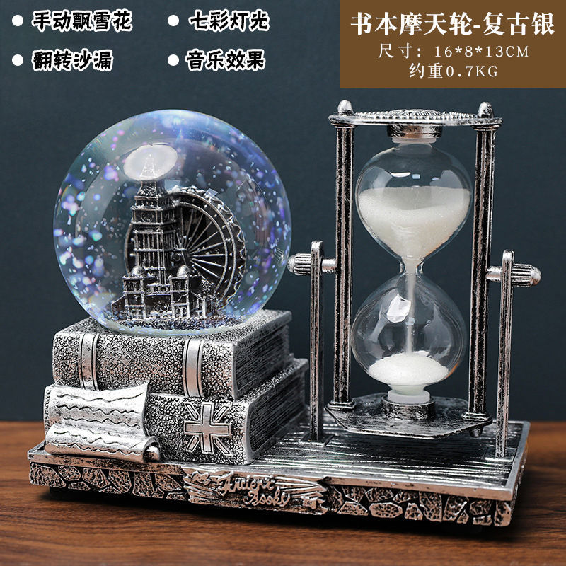 레트로 타워 모래 시계 타이밍 15 분 크리스탈 볼 뮤직 박스 빛나는 데스크탑 장식 학생 졸업 시즌 선물