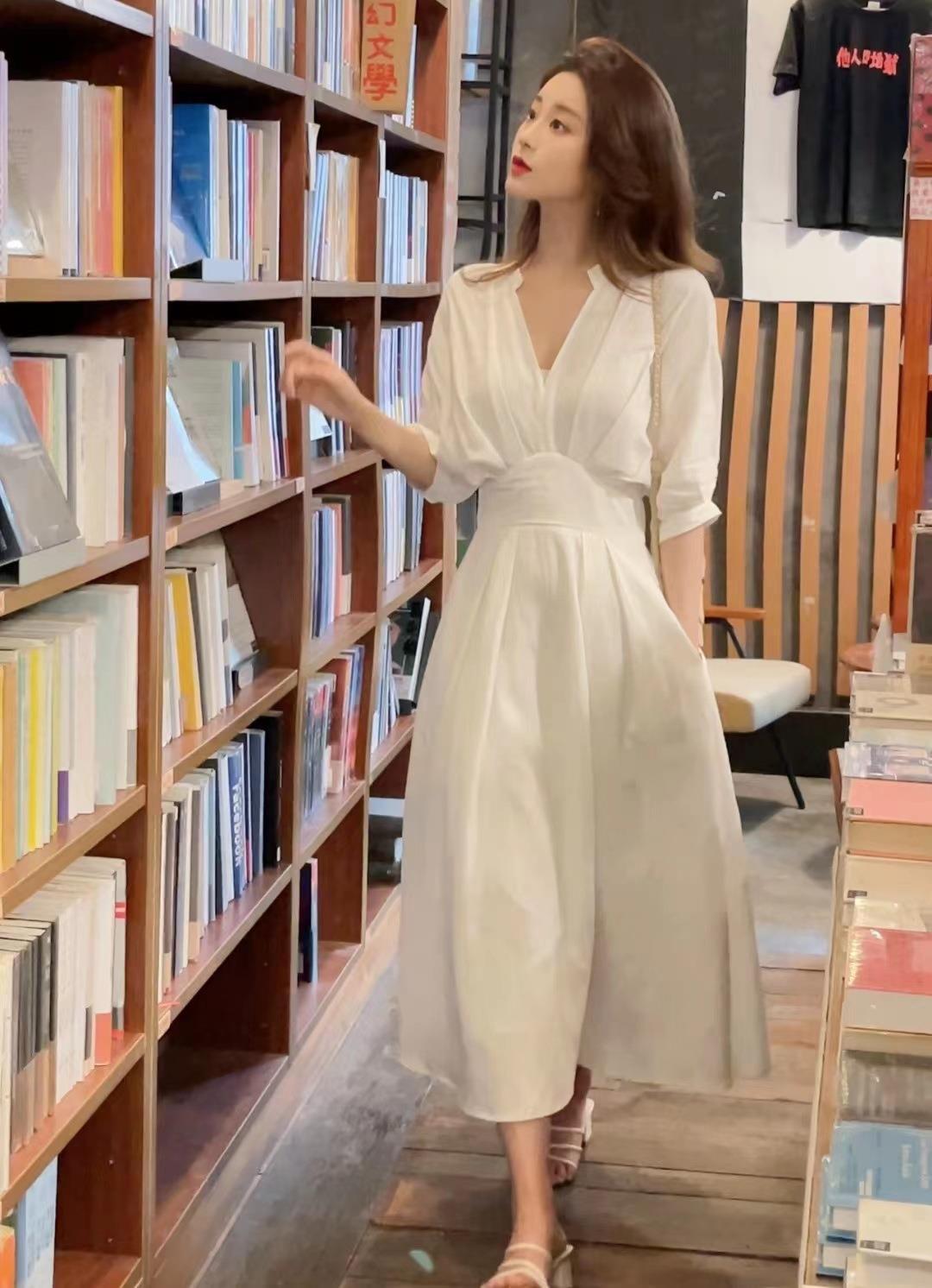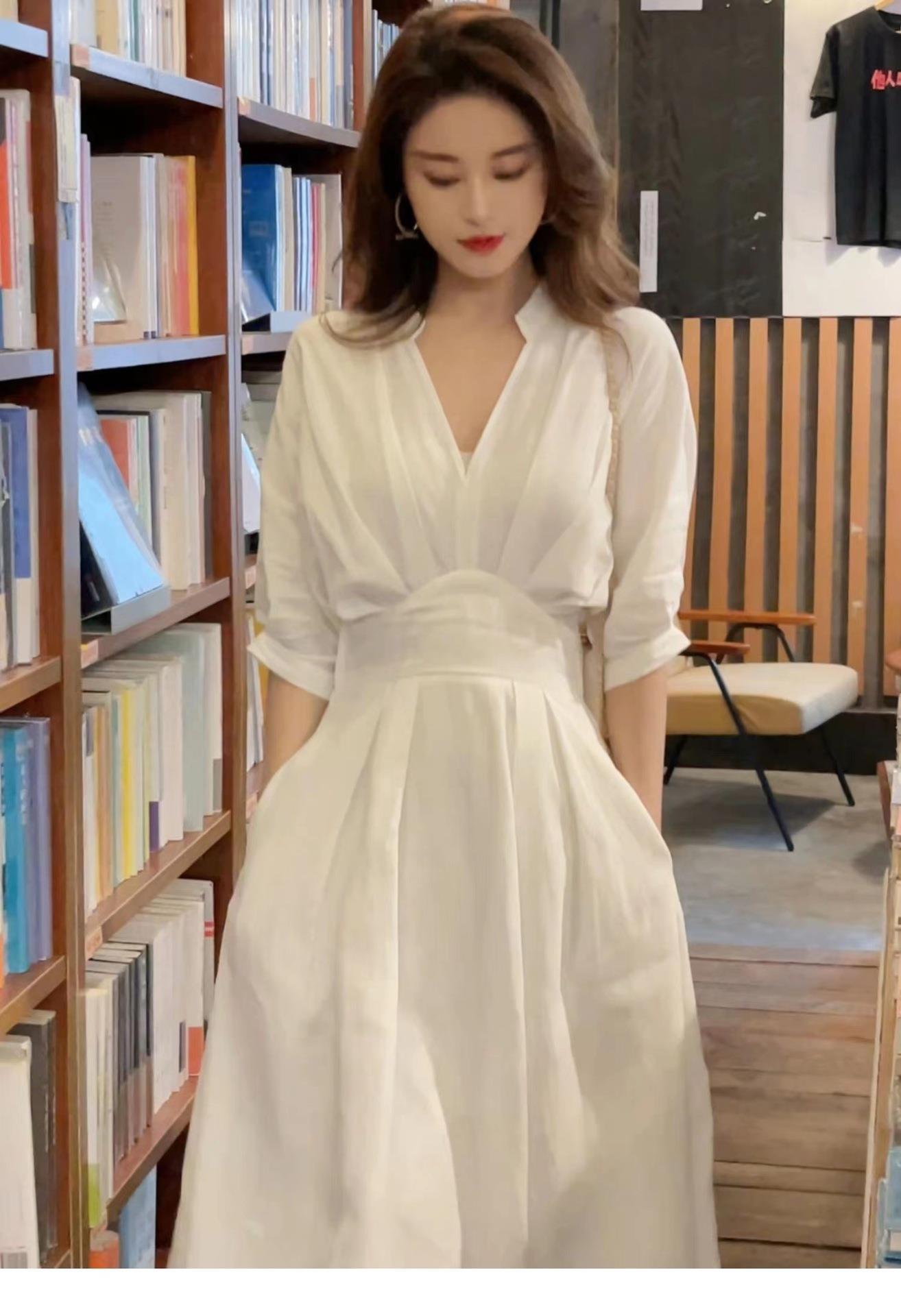 흰 셔츠 원피스 2024 여름 차 휴식 프랑스 허리 슬리밍 요정 긴 원피스 여성의 기질스토어 가기