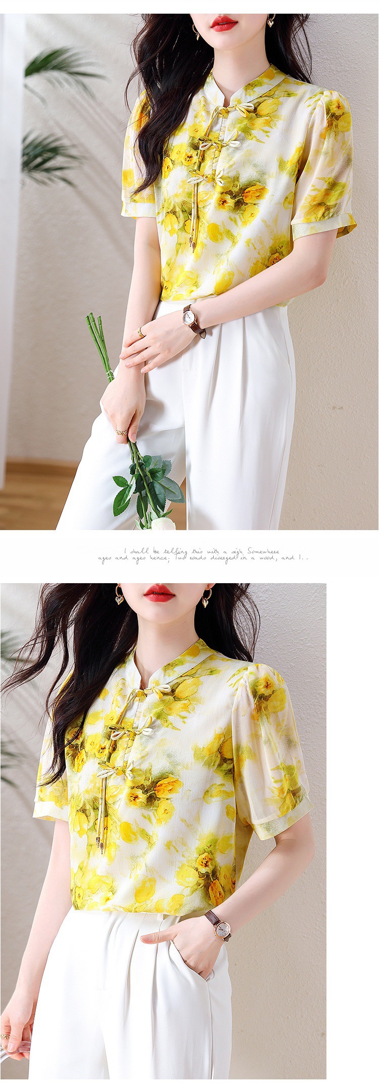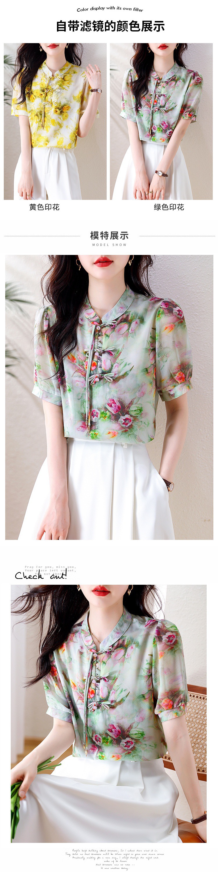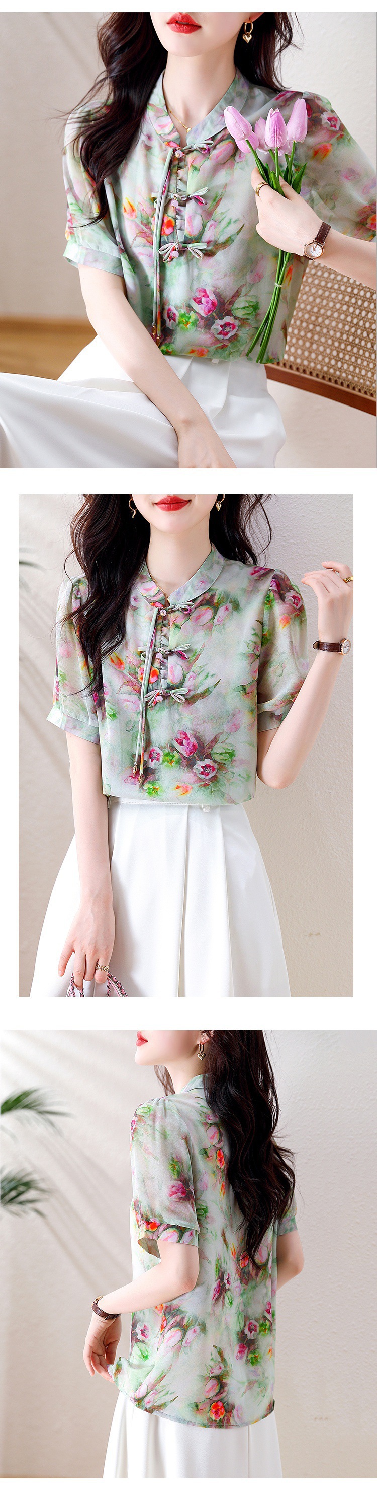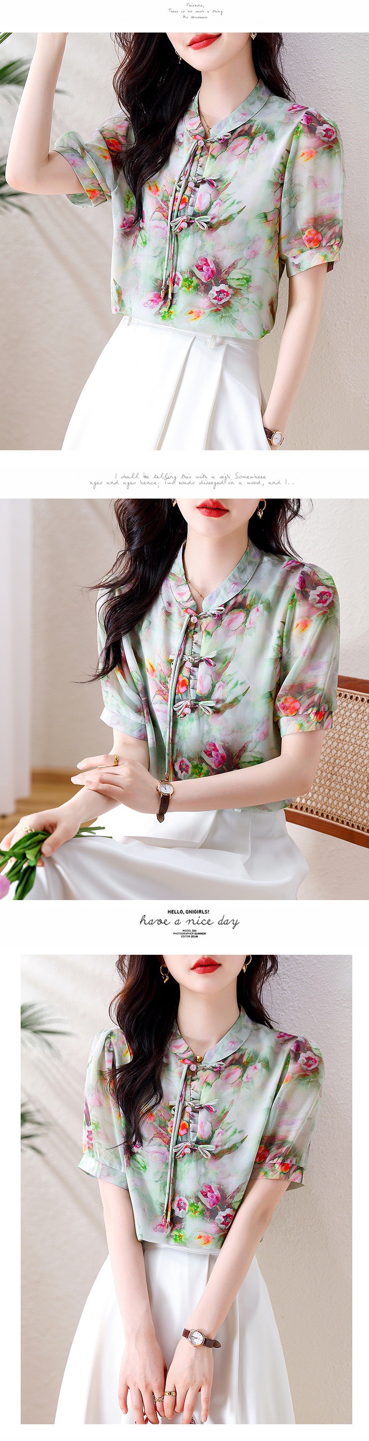699 # 새로운 한국 복고풍 우아한 세로 칼라 버튼 인쇄 반팔 쉬폰 셔츠 여성의 여름 얇은 탑