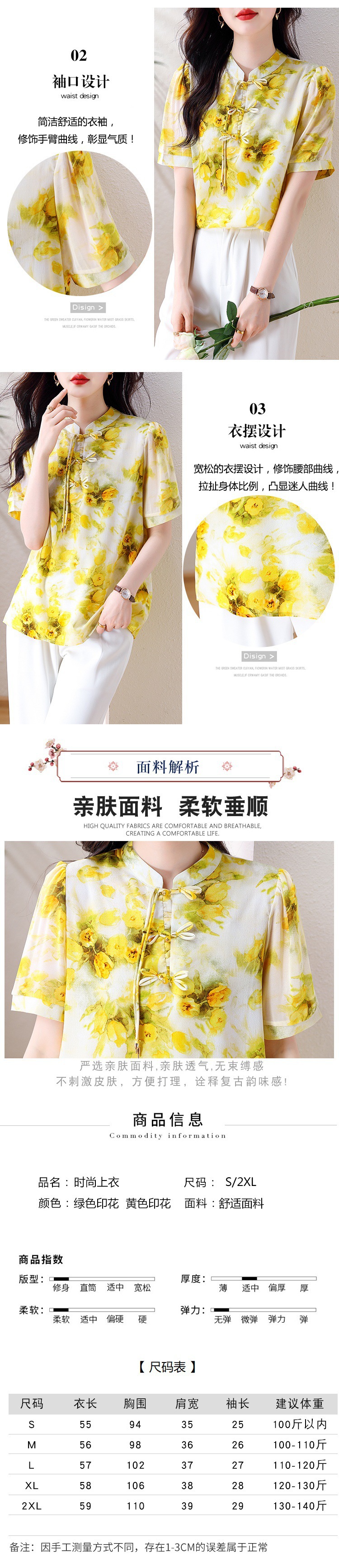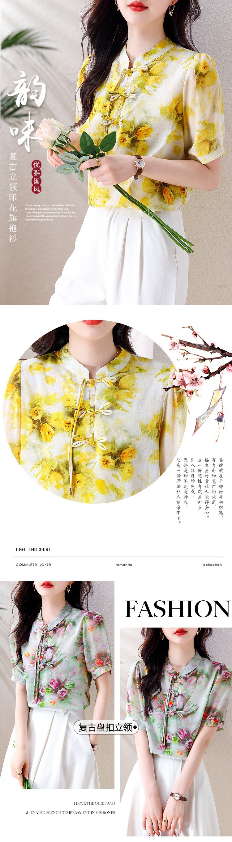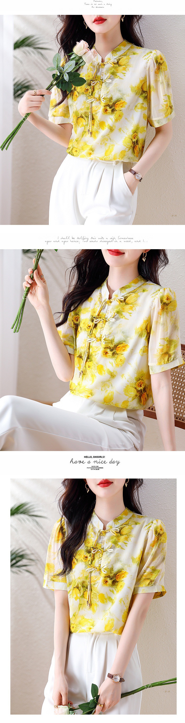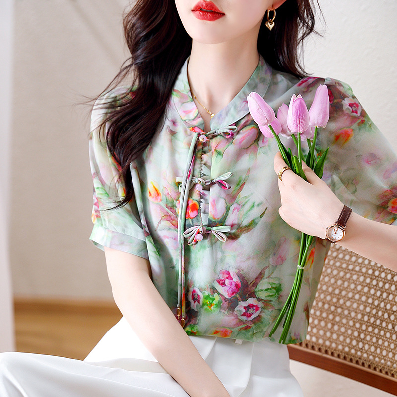 699 # 새로운 한국 복고풍 우아한 세로 칼라 버튼 인쇄 반팔 쉬폰 셔츠 여성의 여름 얇은 탑