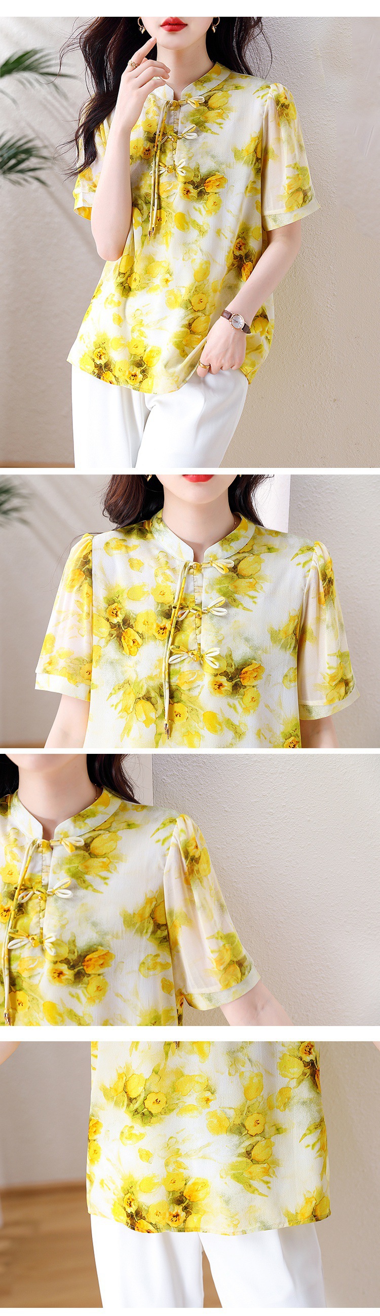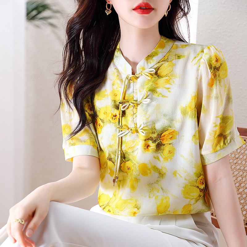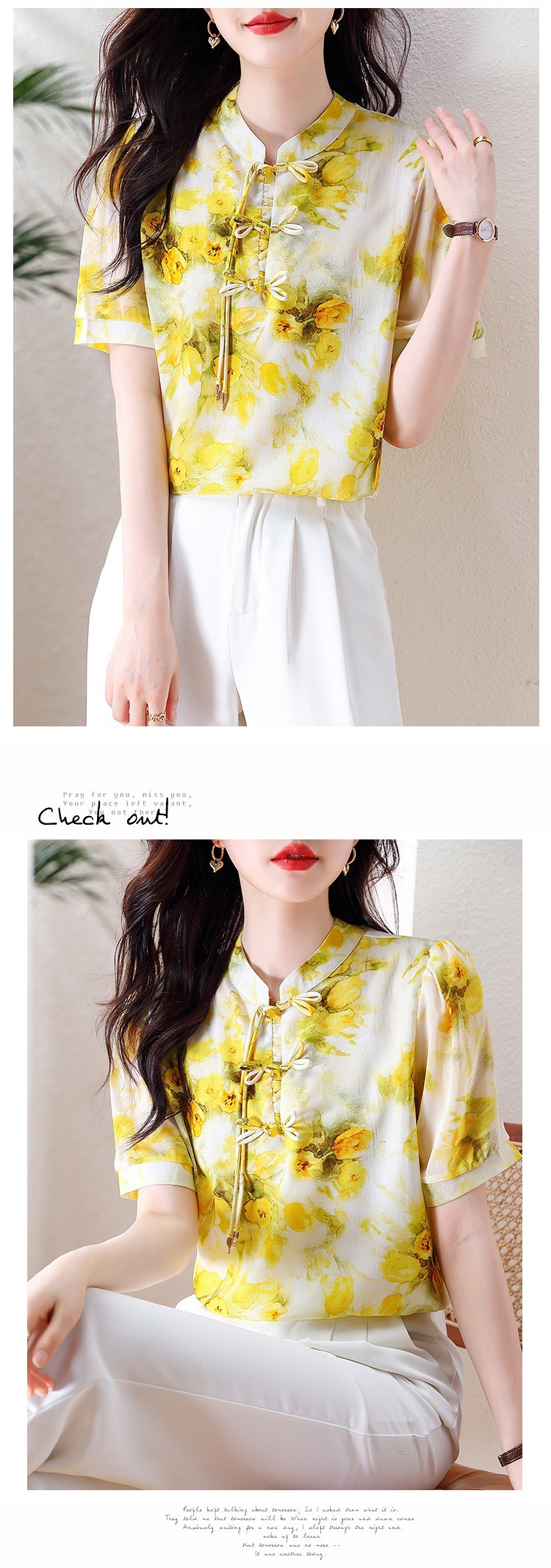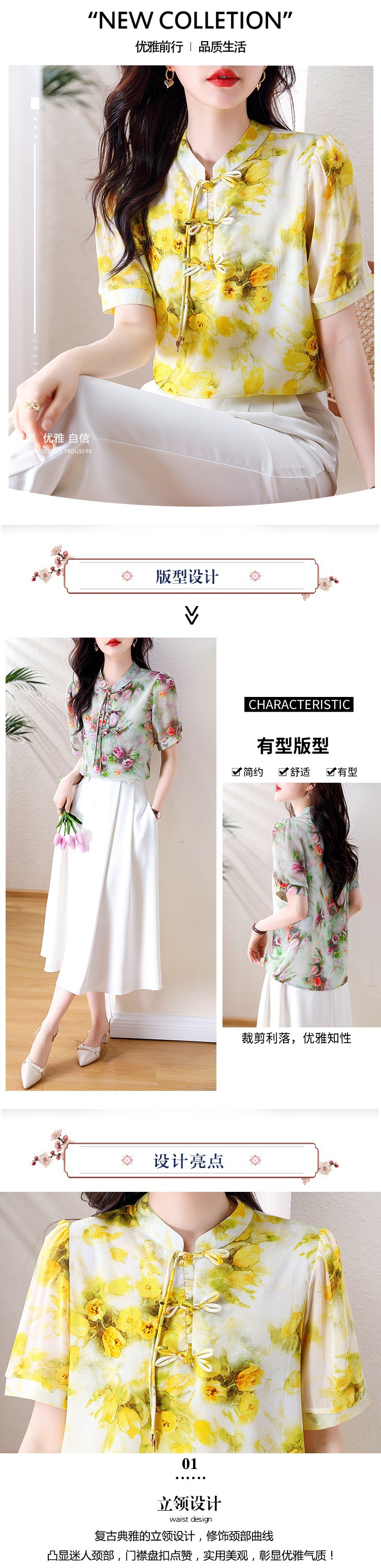 699 # 새로운 한국 복고풍 우아한 세로 칼라 버튼 인쇄 반팔 쉬폰 셔츠 여성의 여름 얇은 탑