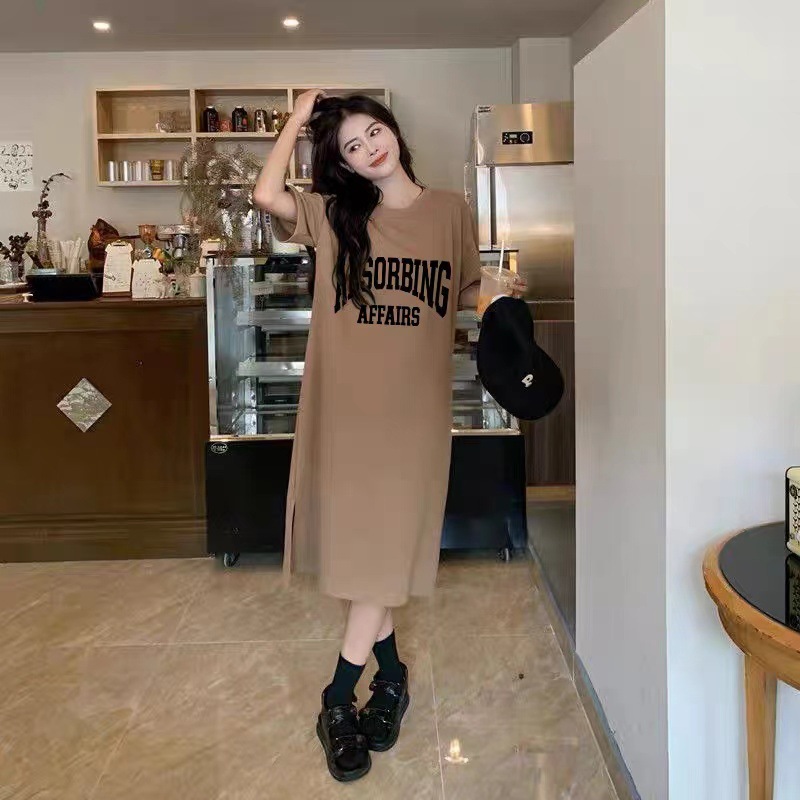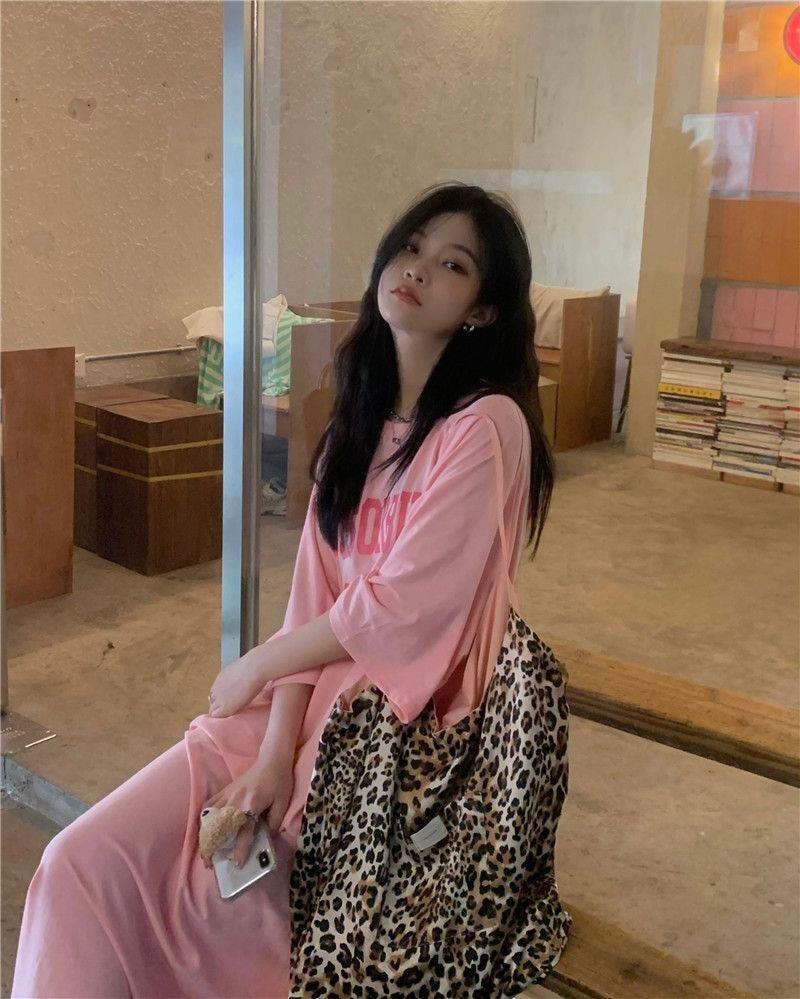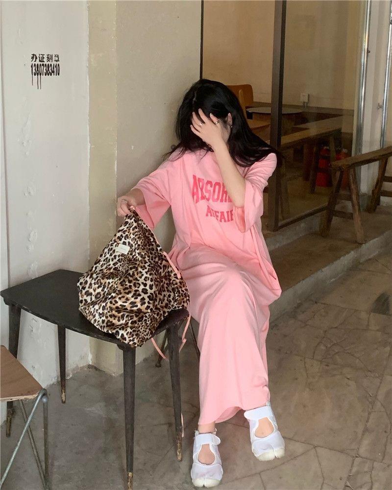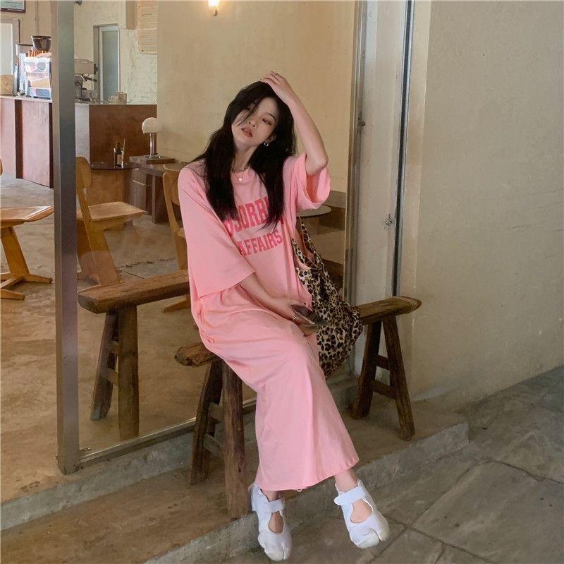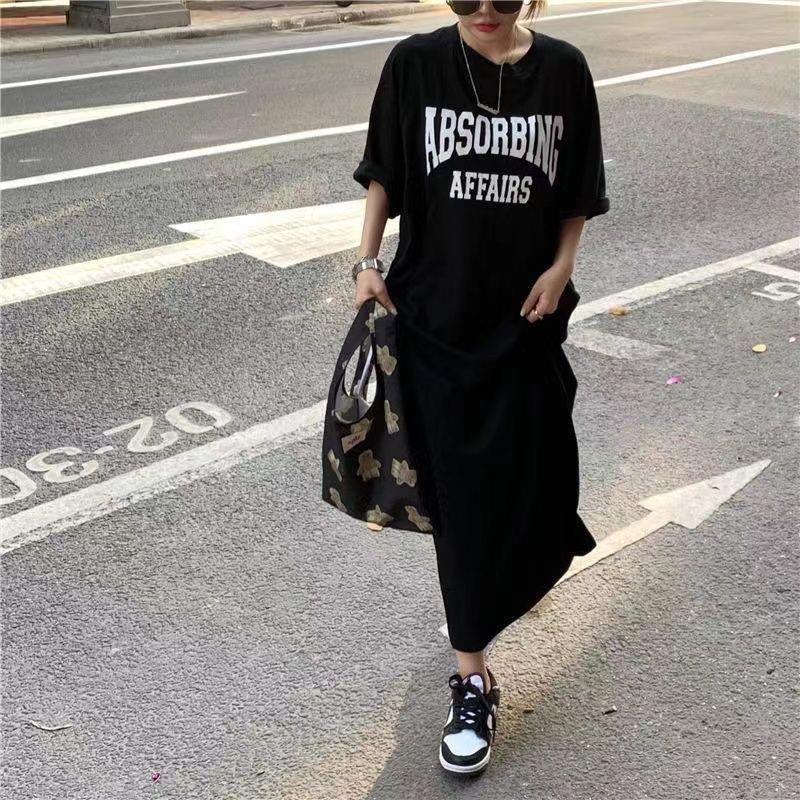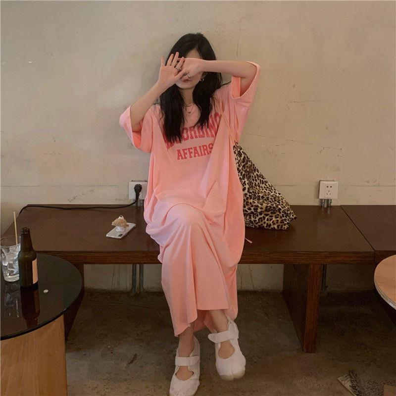 여름 한국 스타일 한국 플러스 사이즈 여성 캐주얼 롱 원피스 통통녀 느슨한 무릎 위 티셔츠 롱 스커트 여성용 잠옷스토어 가기