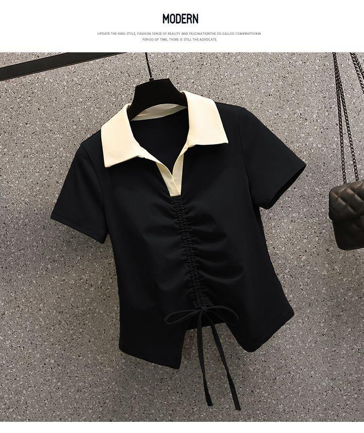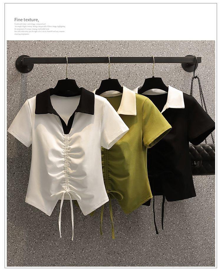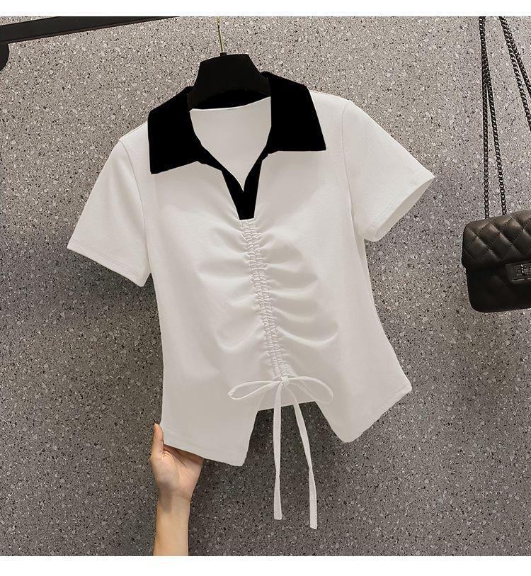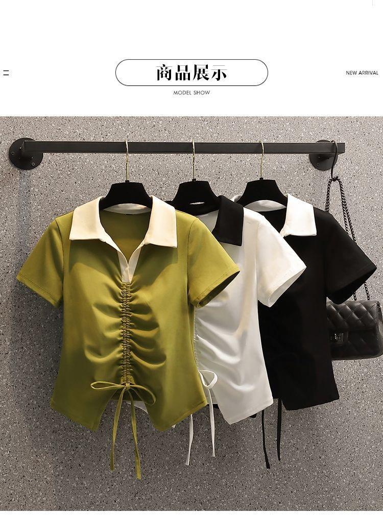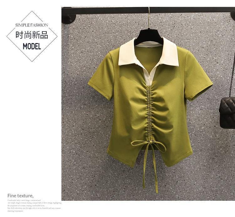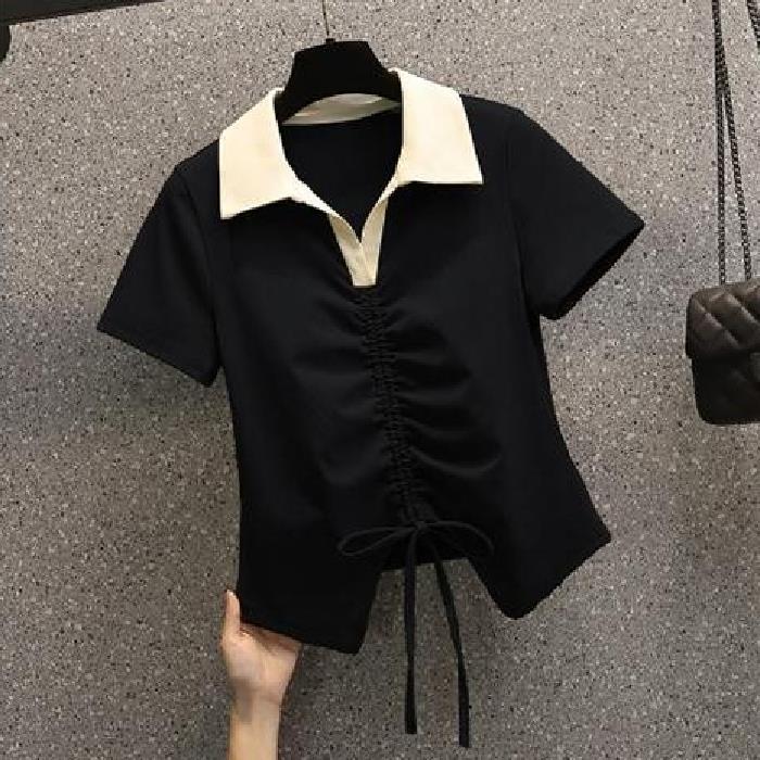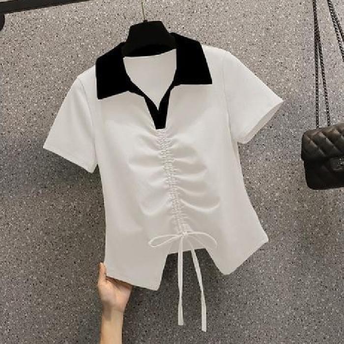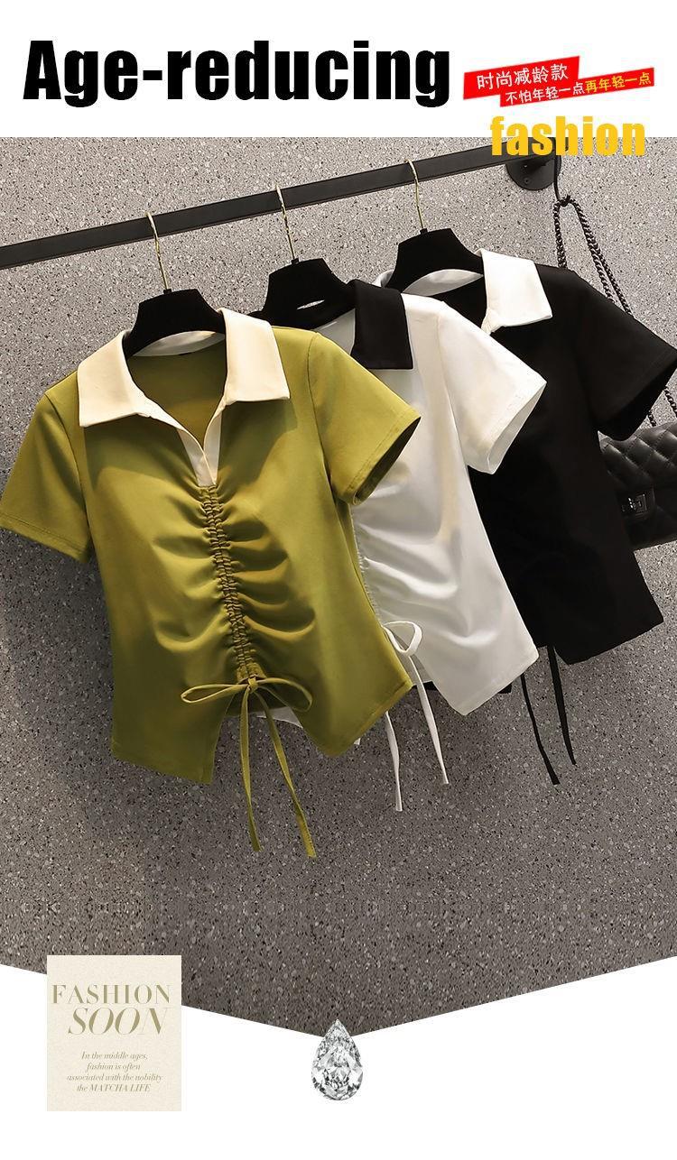 2025 여름 패션 플러스 사이즈 여성 의류 패셔너블한 POLO 칼라 신상 슬리밍 불규칙 드로스트링 배색 티셔츠 상의스토어 가기
