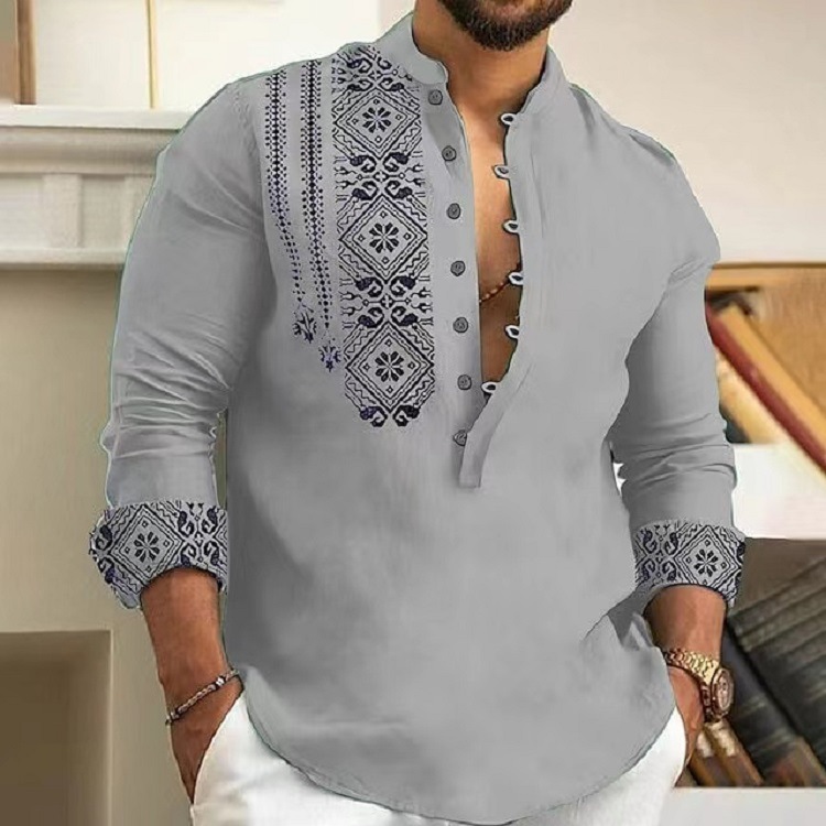 크로스 보더 유럽과 미국 남성 셔츠 여름 새로운 긴팔 칼라 패션 하프 카디건 캐주얼 얇은 셔츠 남성용 대외 무역