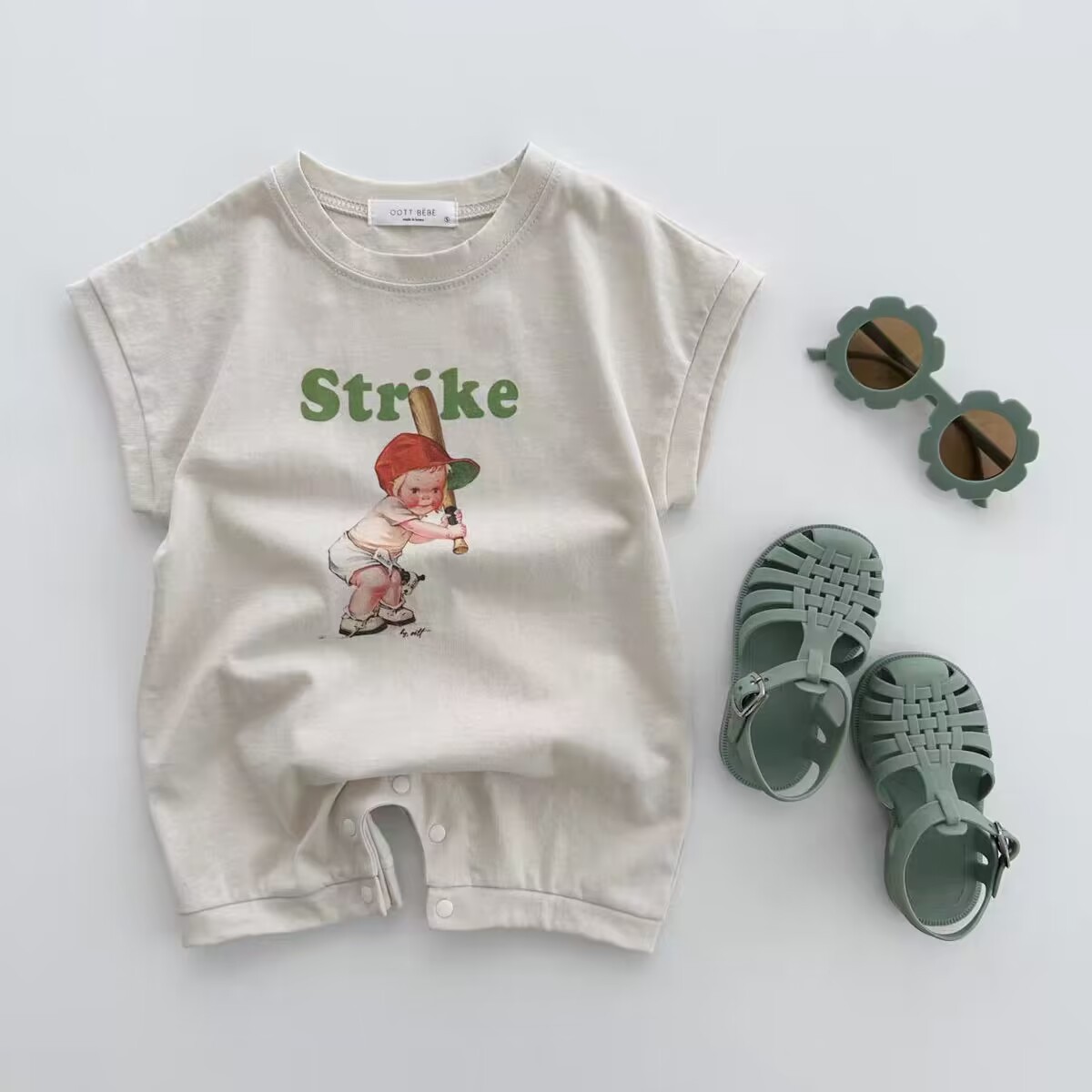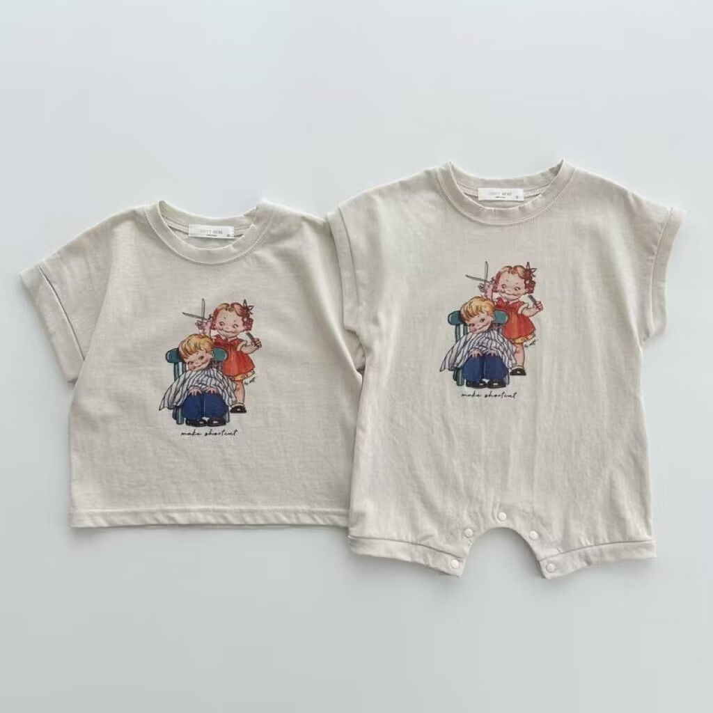 한국 스타일의 아기 여름 옷 귀여운 인형 캐주얼 반팔 바디 수트 모든 매치 만화 등산 세트스토어 가기