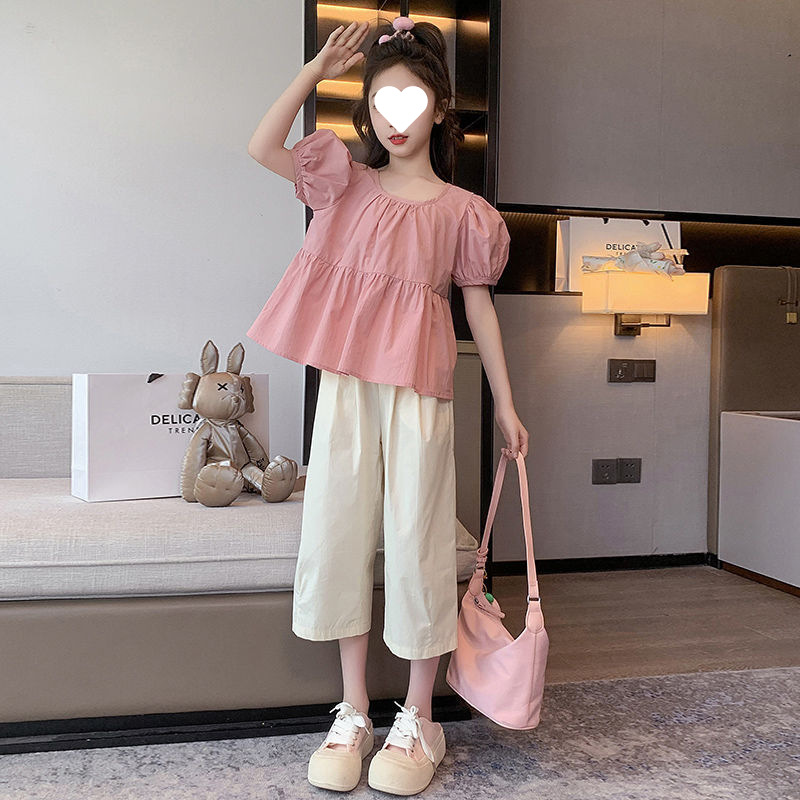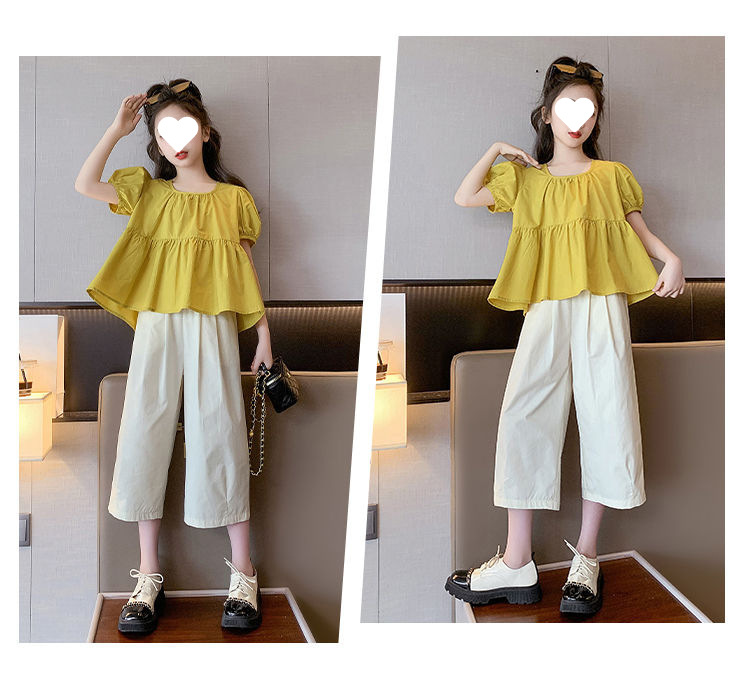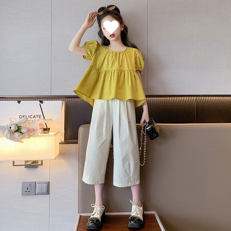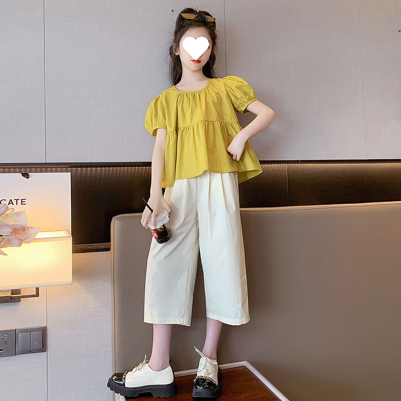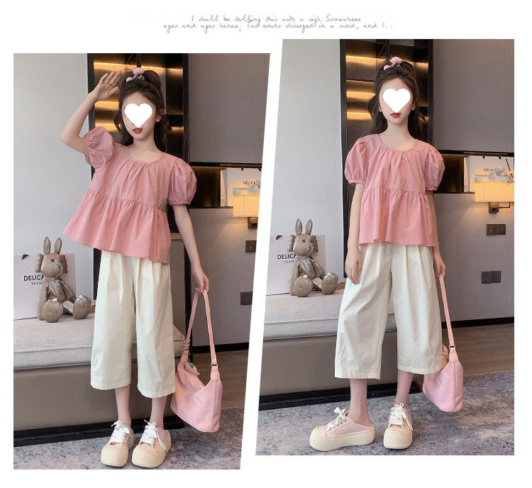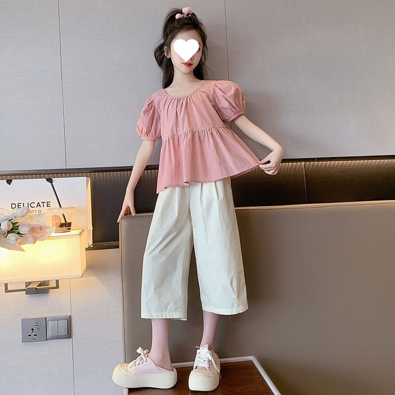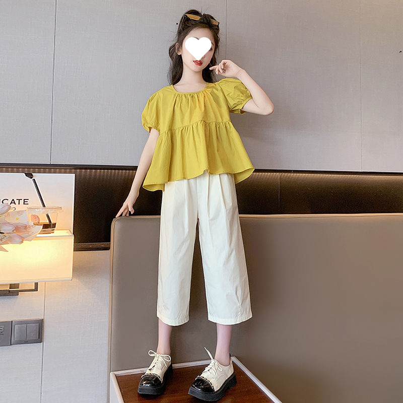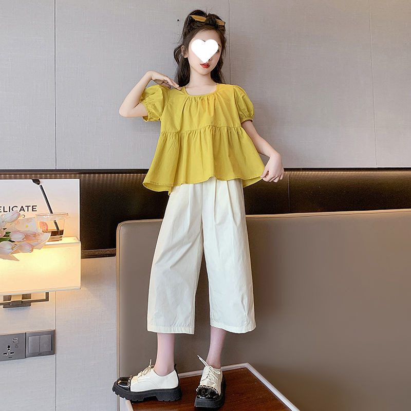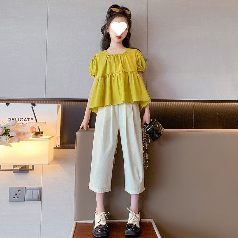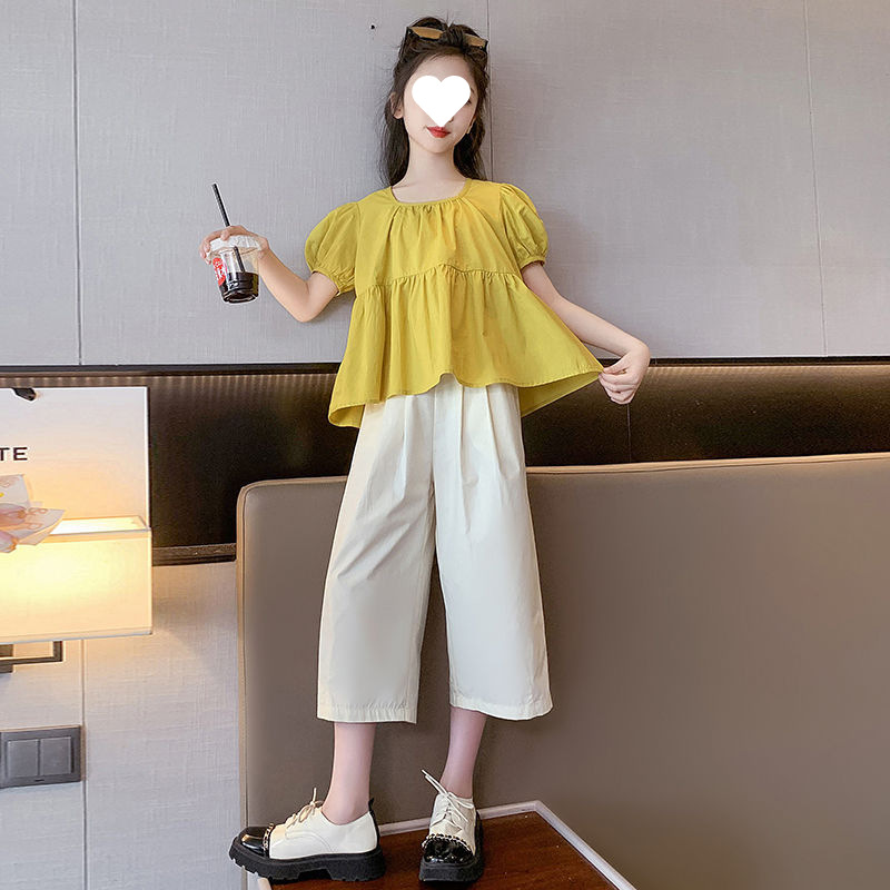 여아 여름 여자의 얇은 쉬폰 셔츠 크롭 팬츠 투피스 2023 새로운 큰 아이들 한국 세트 조수스토어 가기