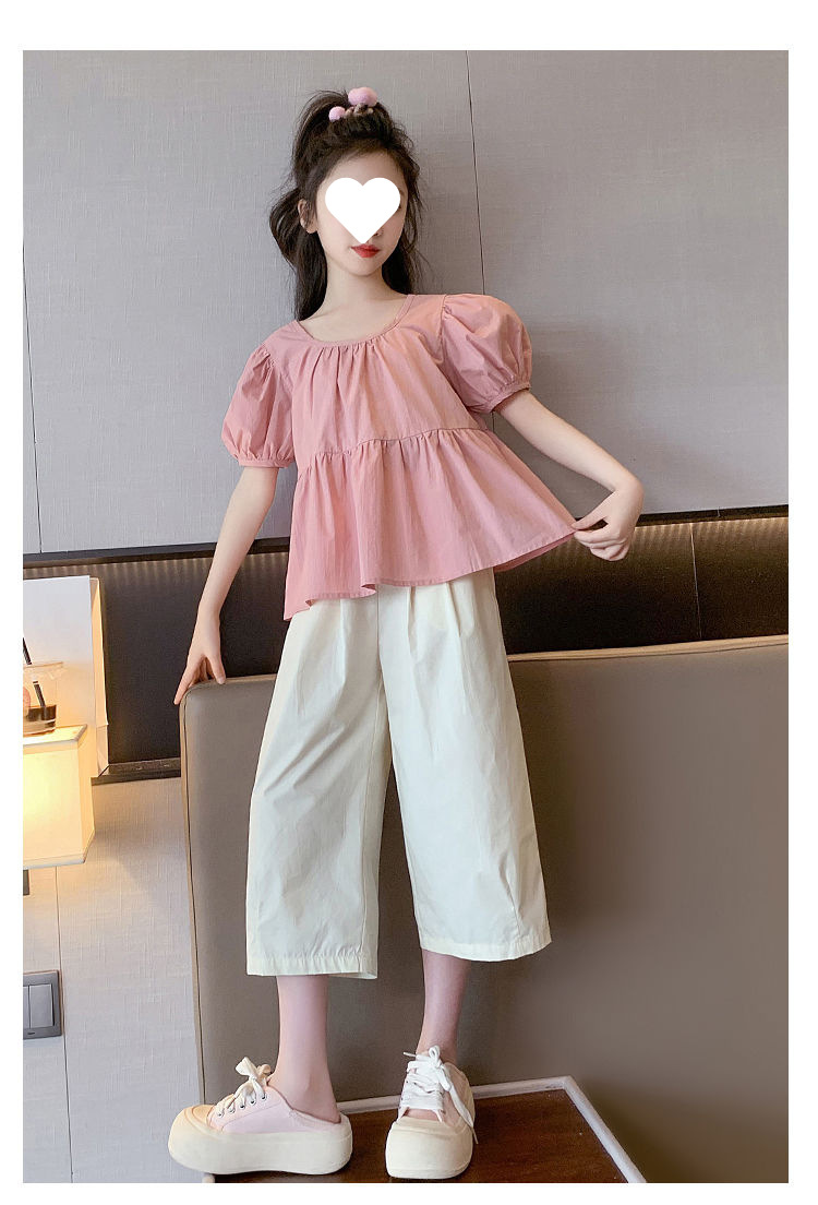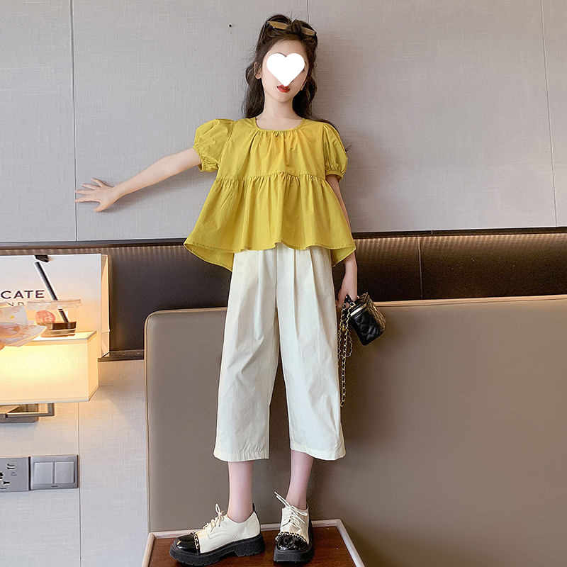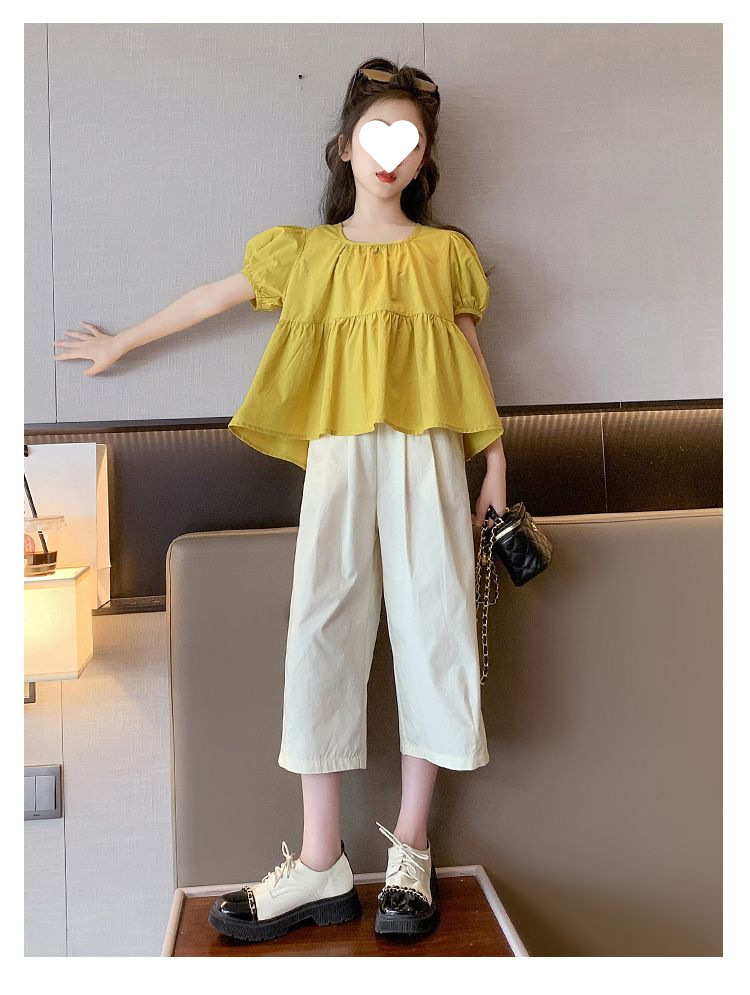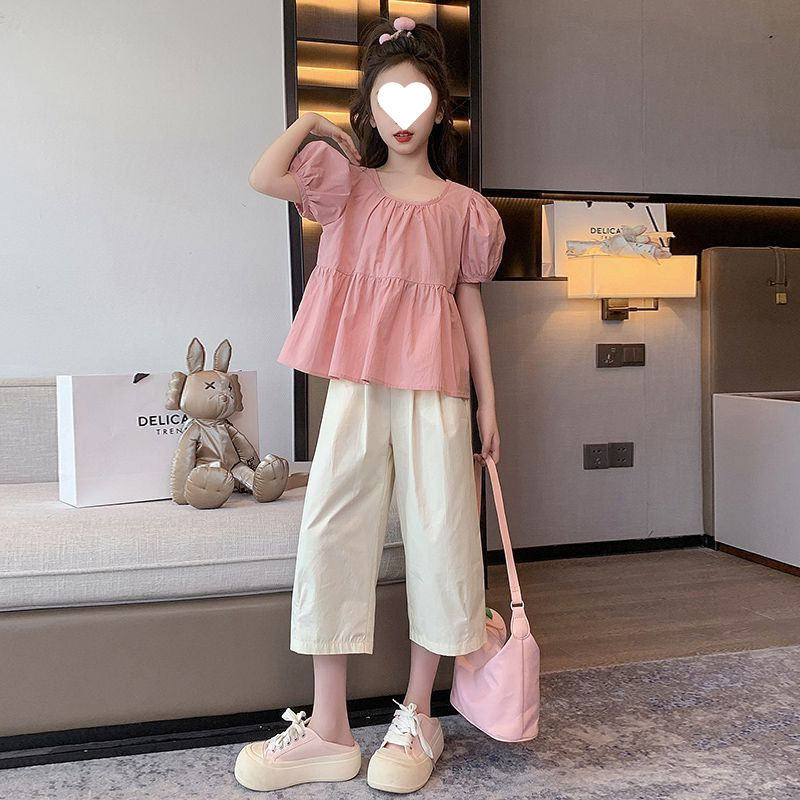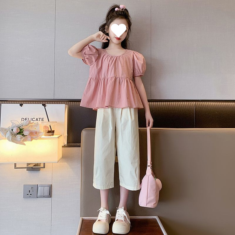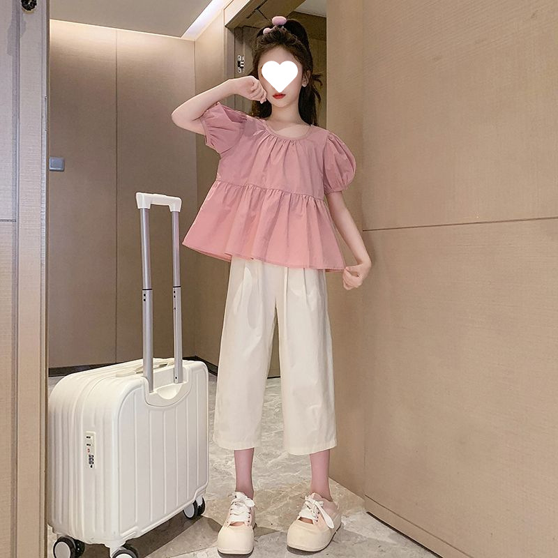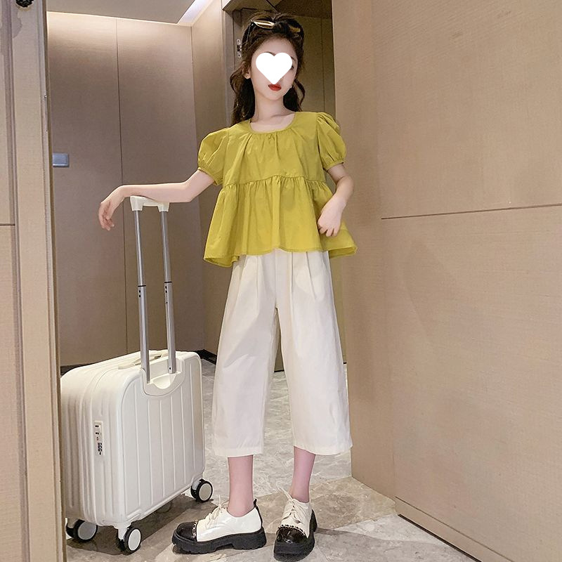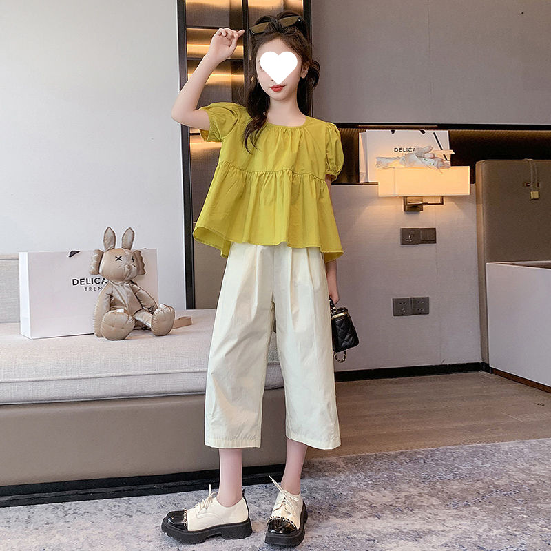 여아 여름 여자의 얇은 쉬폰 셔츠 크롭 팬츠 투피스 2023 새로운 큰 아이들 한국 세트 조수스토어 가기