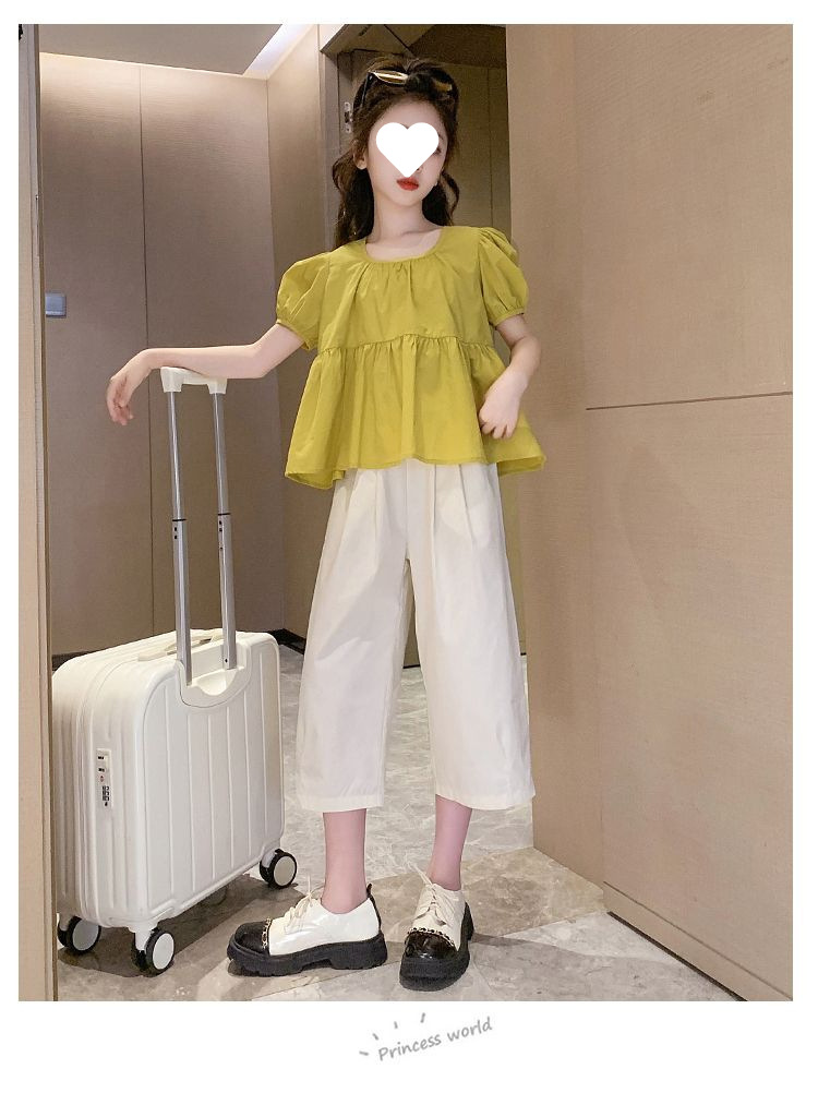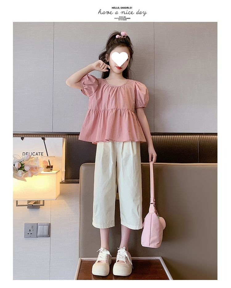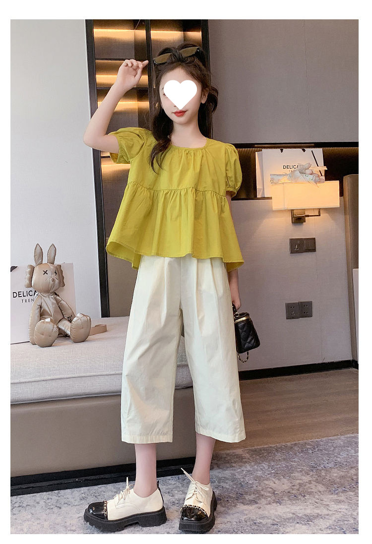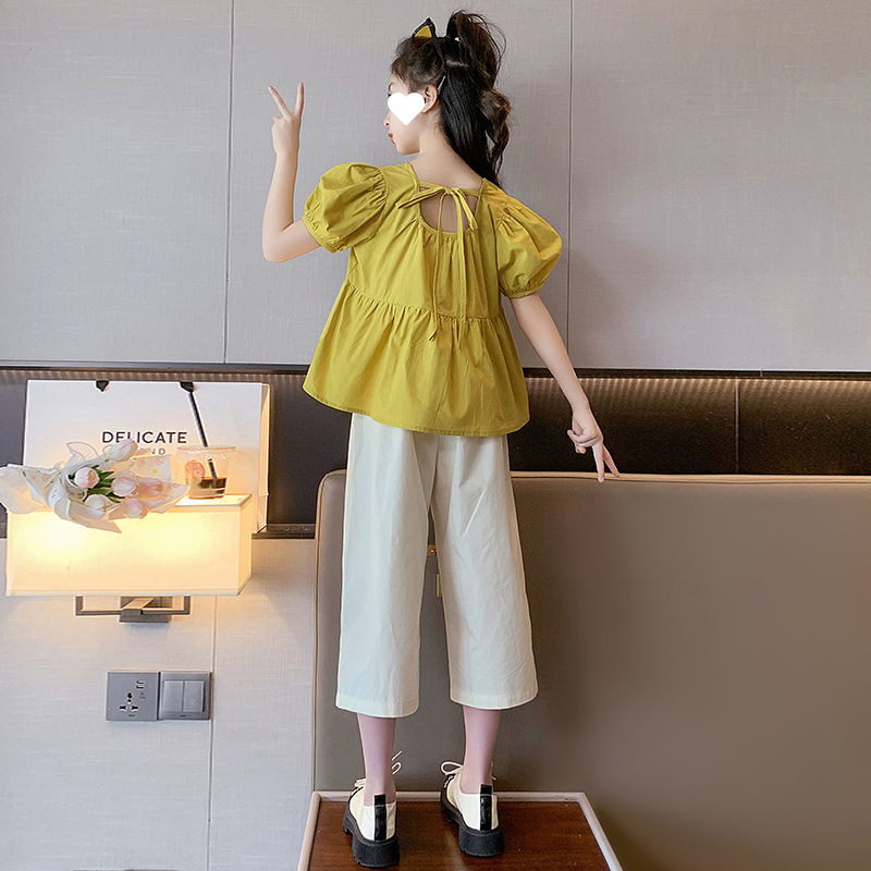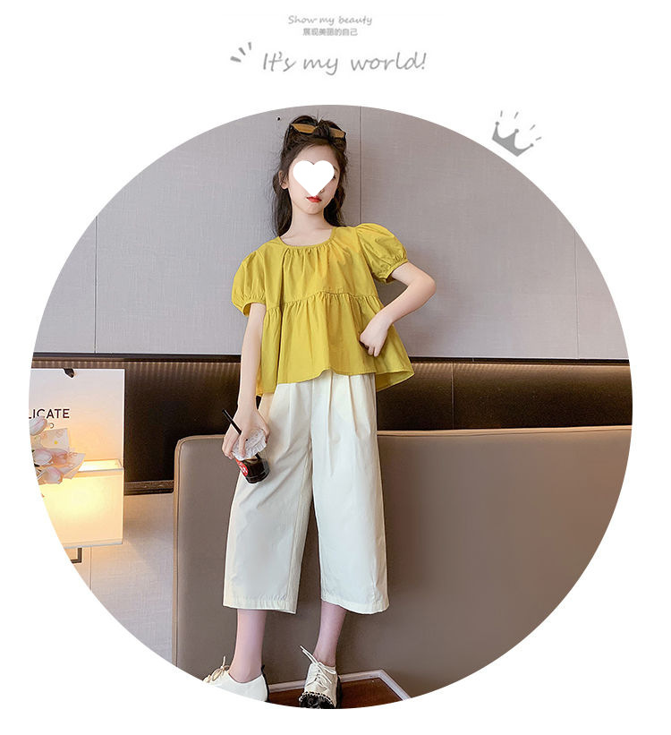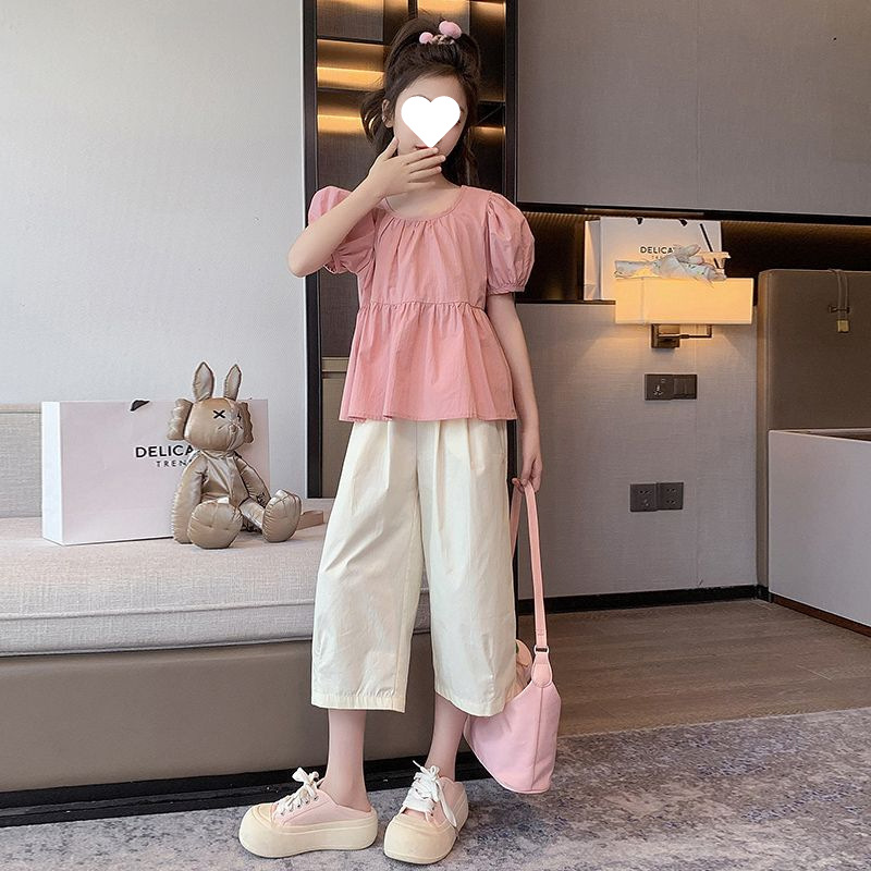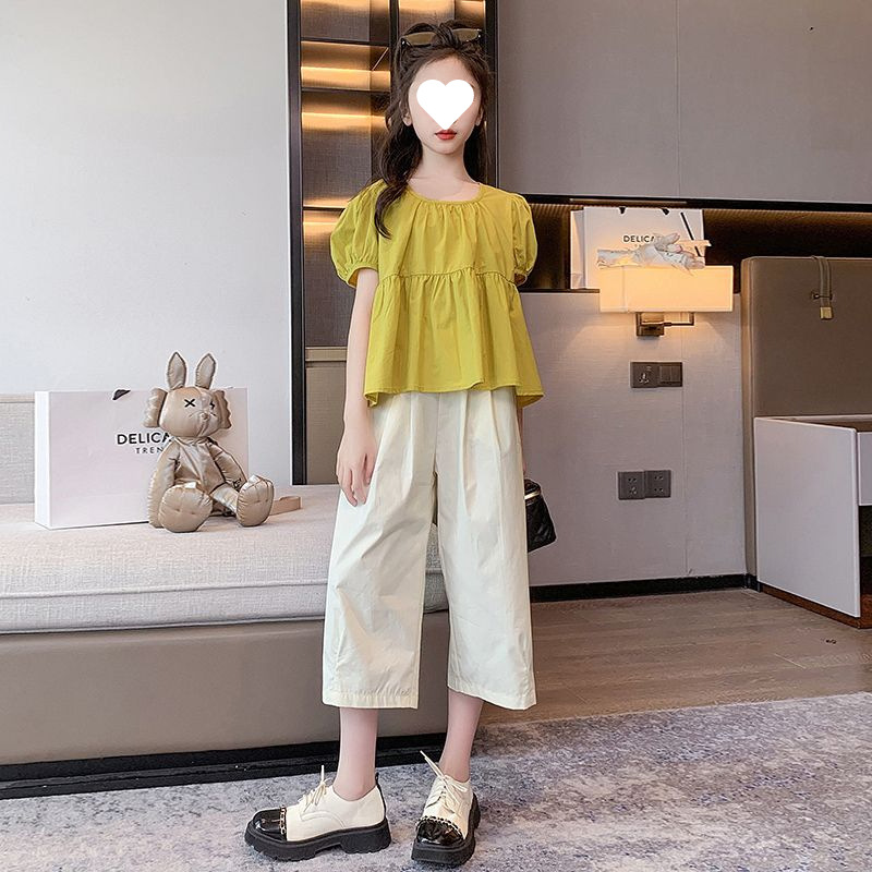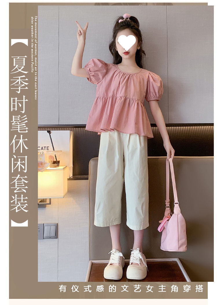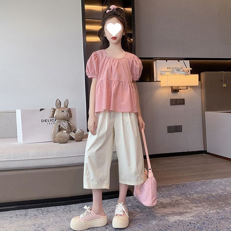 여아 여름 여자의 얇은 쉬폰 셔츠 크롭 팬츠 투피스 2023 새로운 큰 아이들 한국 세트 조수스토어 가기