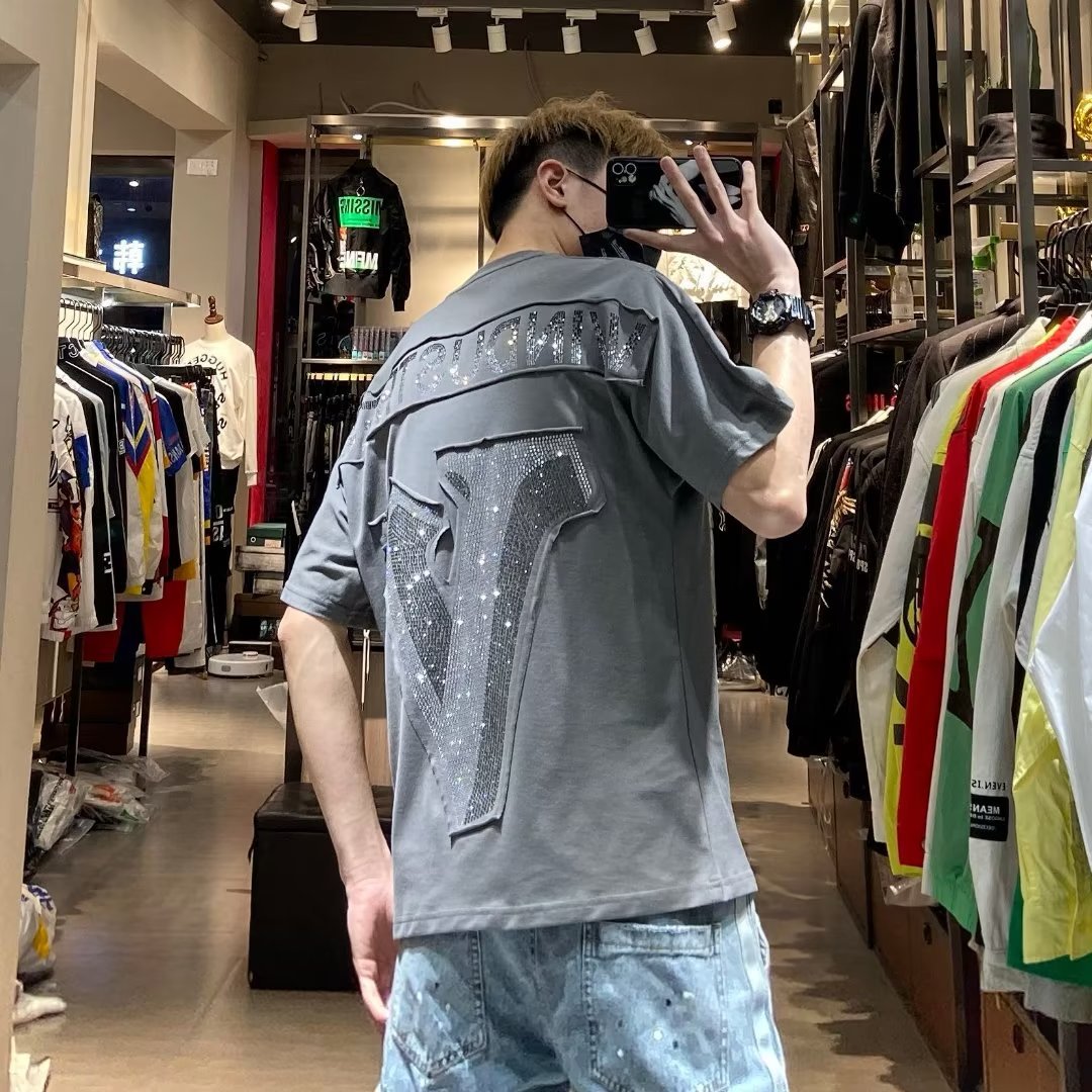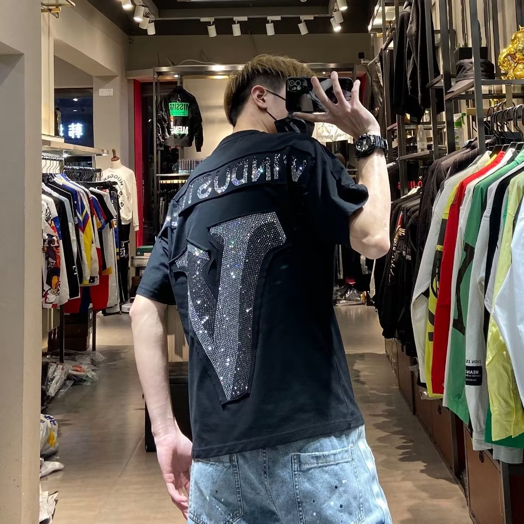 한국식 핫 드릴링 레터 인쇄 라운드 넥 느슨한 하이 엔드 센스 성격 패션 틈새 디자인 센스 티셔츠 남성용 미디엄 및 반팔