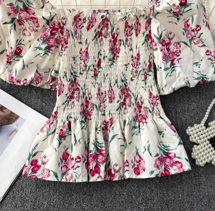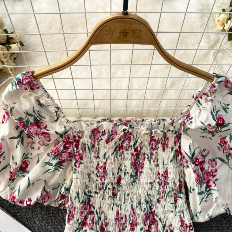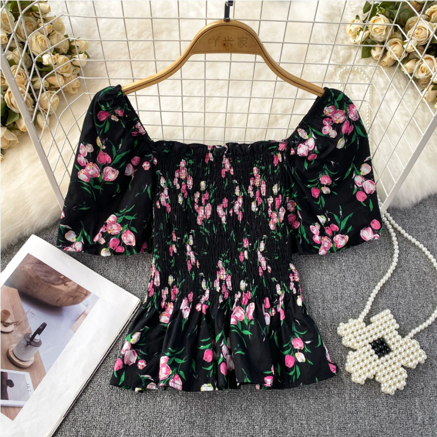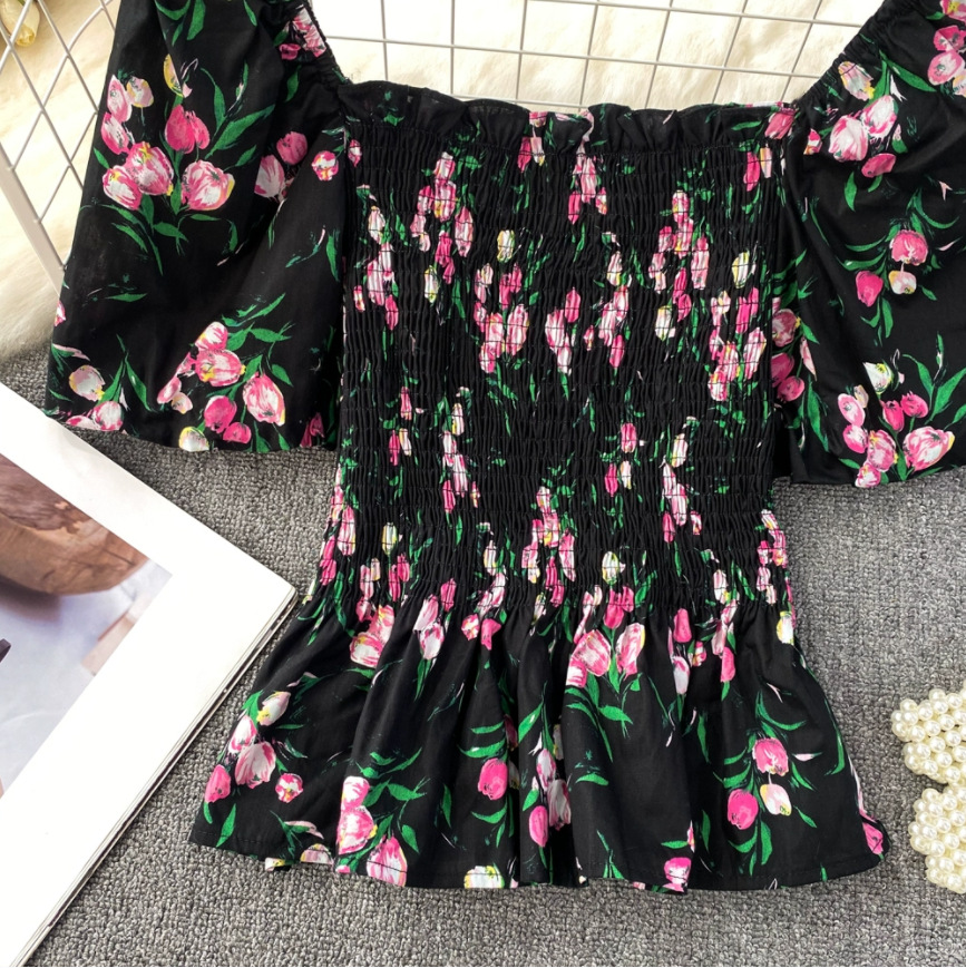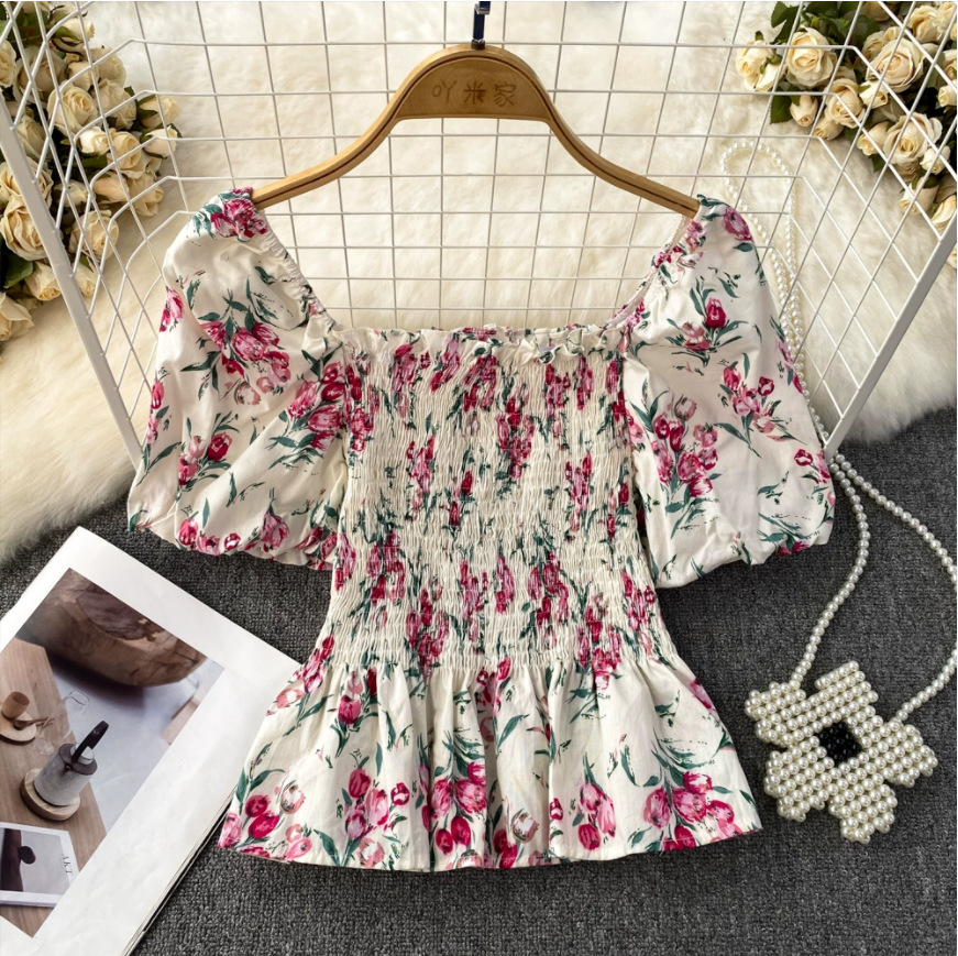 프렌치 퍼프 슬리브 쉬폰 셔츠 여성의 새로운 디자인 센스 틈새 꽃 달콤한 서양 스타일 타이트 허리 슬리밍 올 매치 탑