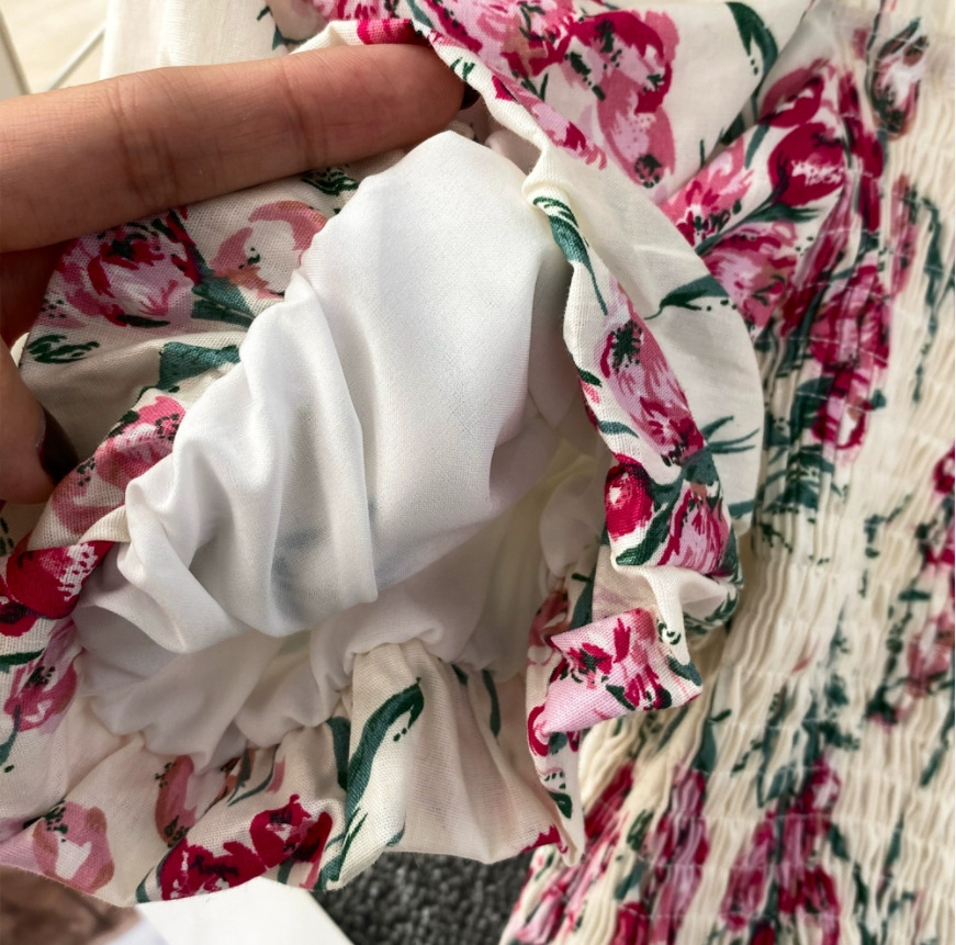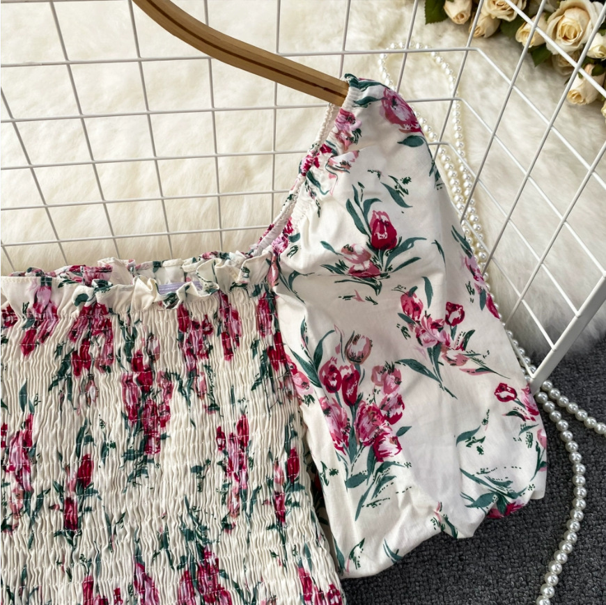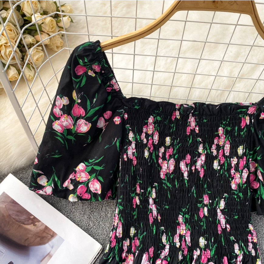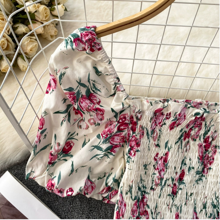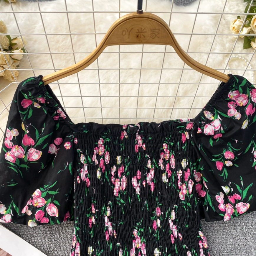 프렌치 퍼프 슬리브 쉬폰 셔츠 여성의 새로운 디자인 센스 틈새 꽃 달콤한 서양 스타일 타이트 허리 슬리밍 올 매치 탑